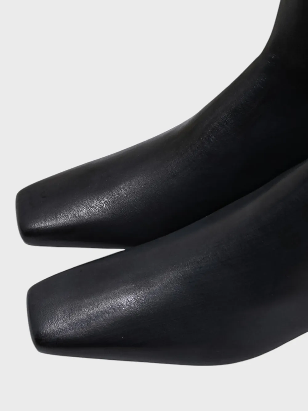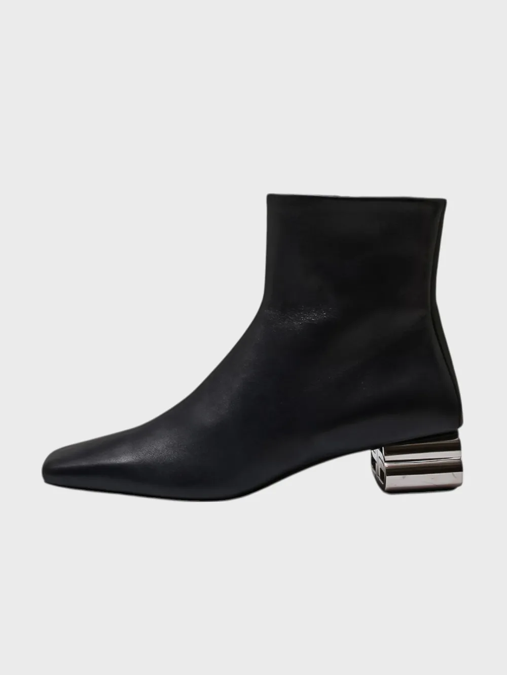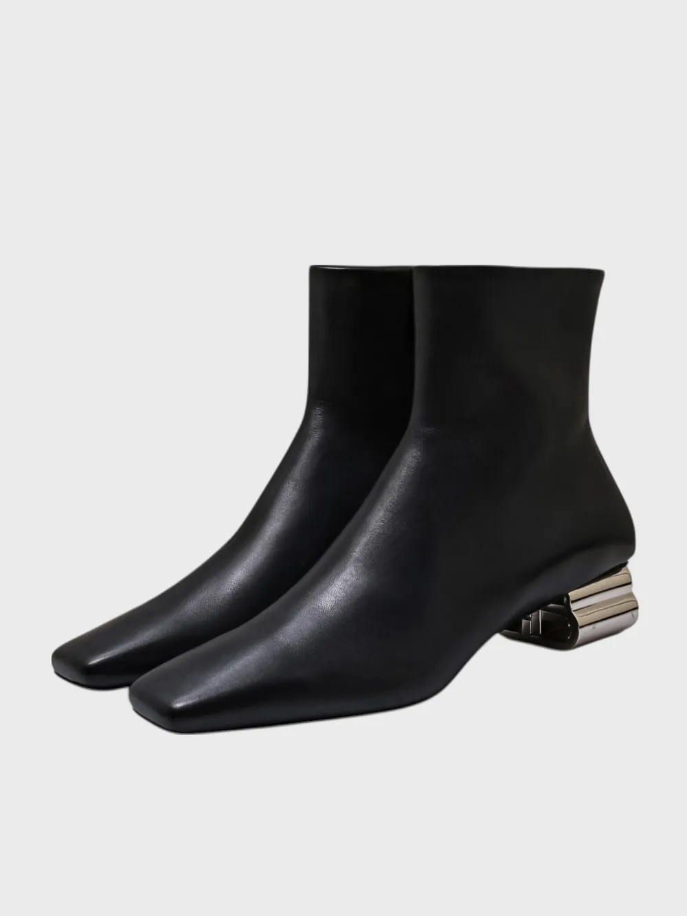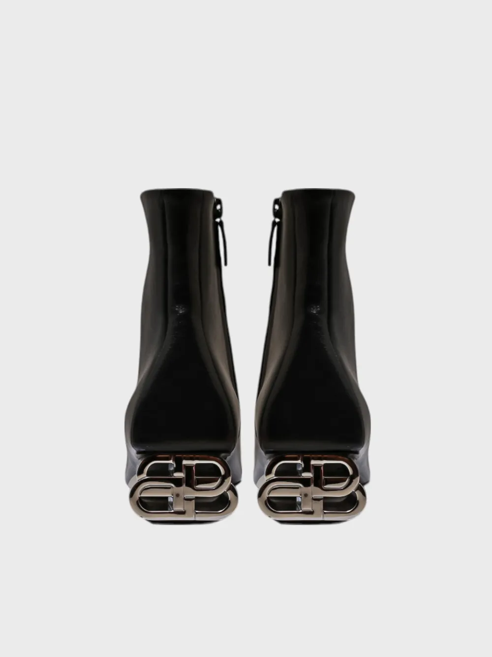 Ботинки Balenciaga выполнены из черной гладкой кожи с квадратным носком и элегантным средним каблуком. Модель дополнена металлическим декоративным элементом на подошве, который представляет собой фирменный логотип бренда. Удобная посадка и классический дизайн делают эти ботинки универсальным аксессуаром для повседневного и делового стиля.