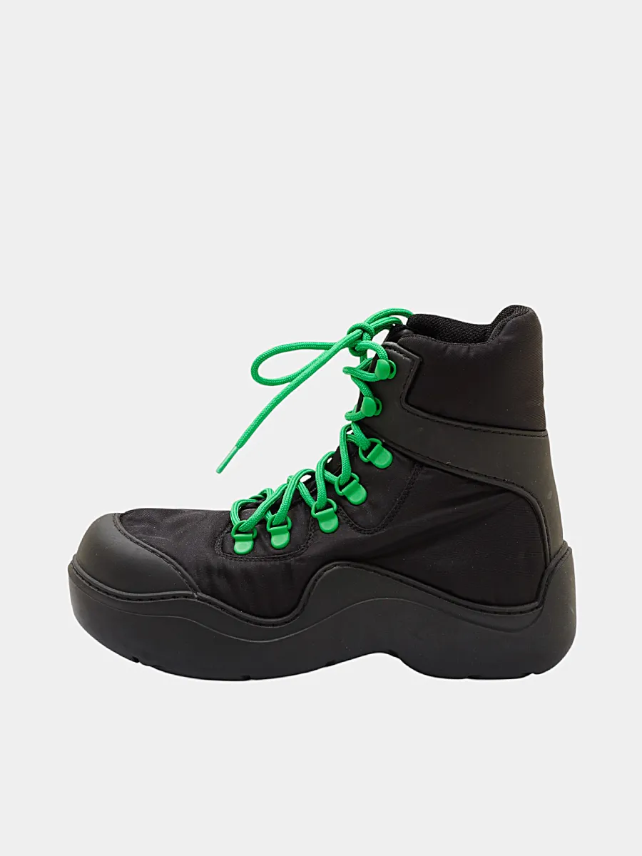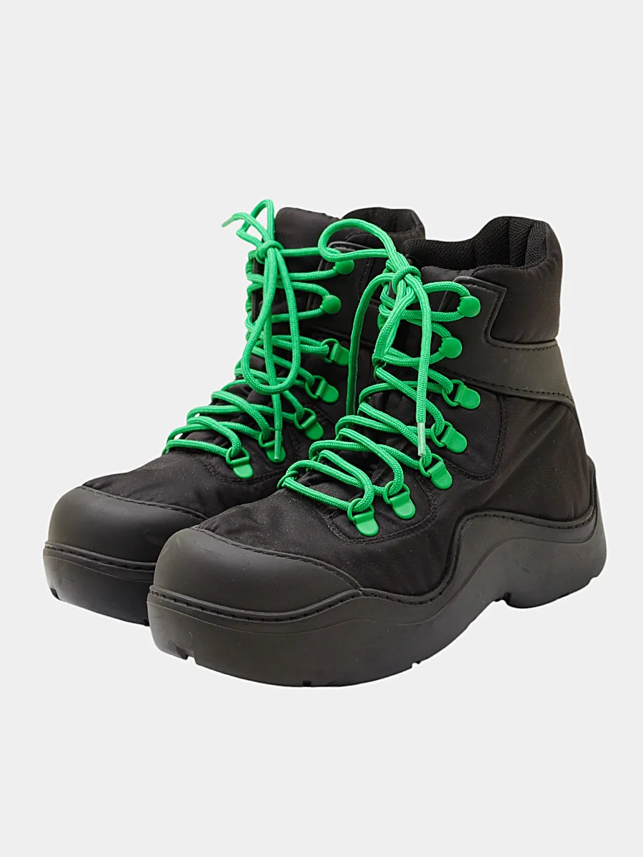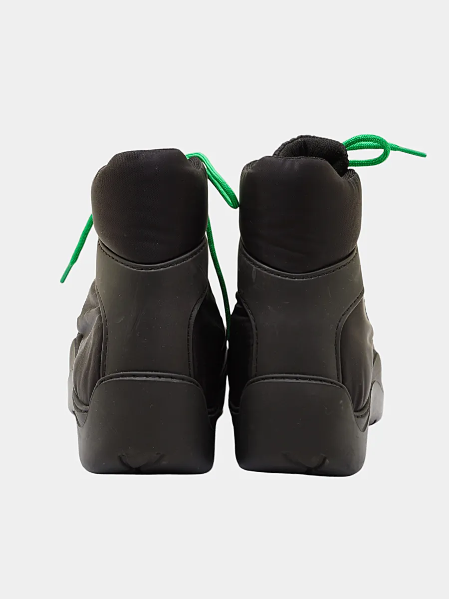 Ботинки Bottega Veneta выполнены из качественного водонепроницаемого материала черного цвета с контрастными ярко-зелеными шнурками. Модель дополнена элегантным дизайном с высоким верхом и широкой рифленой подошвой, обеспечивающей комфорт при ходьбе в любую погоду. Простой крой сочетается с практичными элементами для удобства ношения. Безупречное качество исполнения и современный минималистичный дизайн делают эти ботинки идеальным аксессуаром для повседневного или делового образа, особенно в холодное время года.
