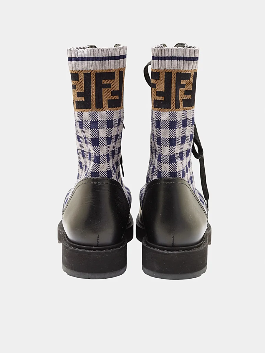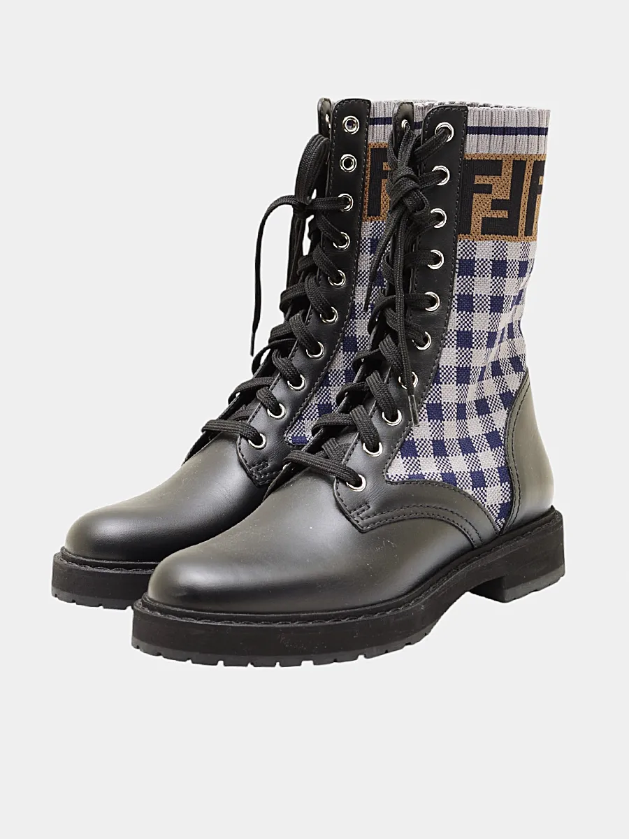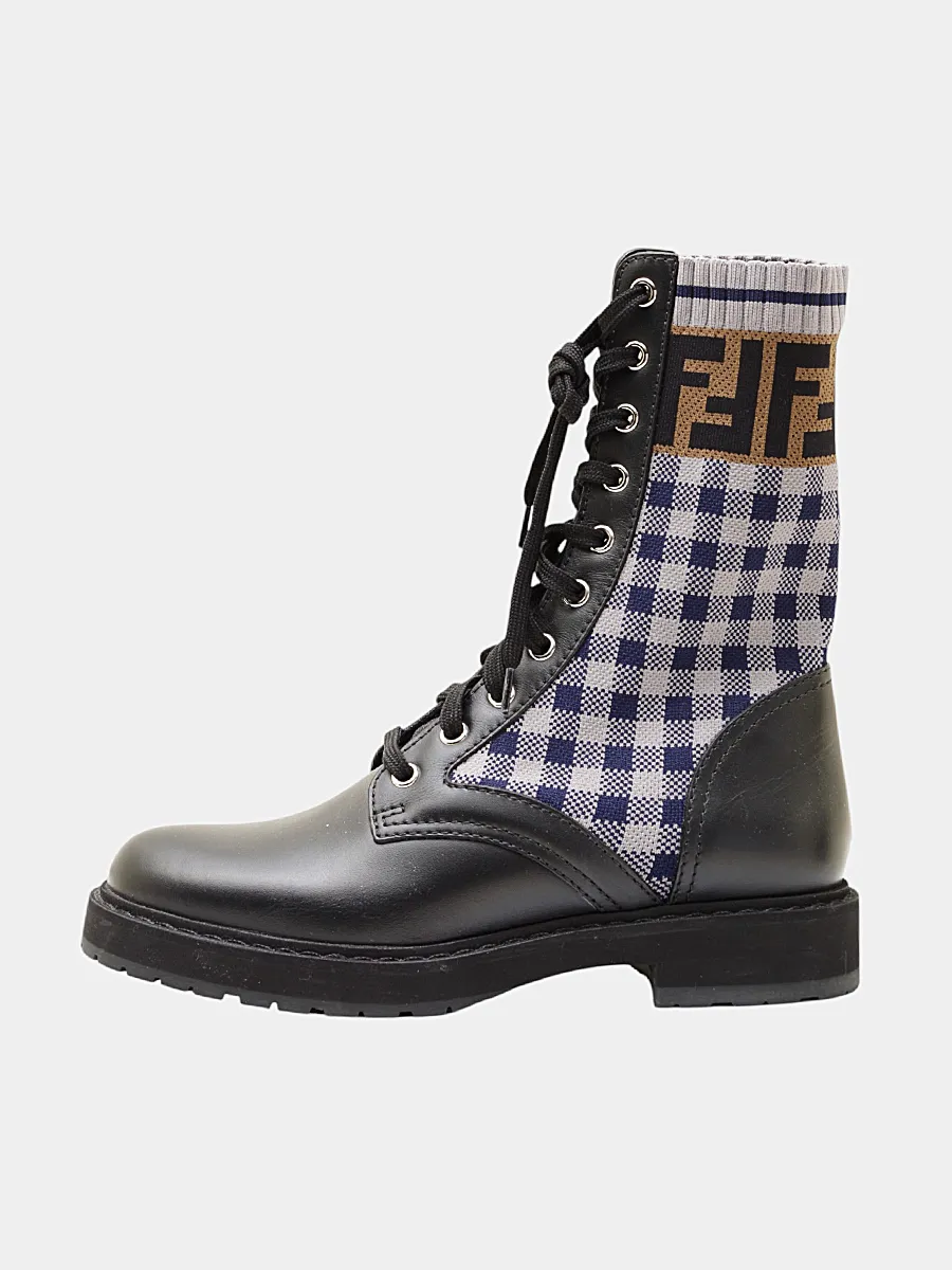 Ботинки Fendi выполнены из качественной гладкой кожи черного цвета с комбинированным дизайном. Верхняя часть модели оформлена из плотной фактурной ткани, декорированной фирменным принтом в клетку и крупным логотипом бренда "FF". Модель дополнена шнуровкой для комфортной посадки и рифленой подошвой для улучшенной проходимости. Лаконичный дизайн и текстура материала создают современный и стильный образ для повседневной носки или деловых встреч.
