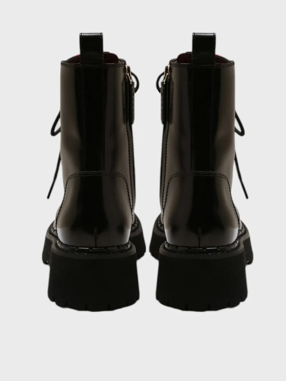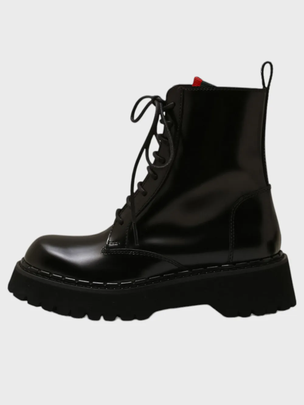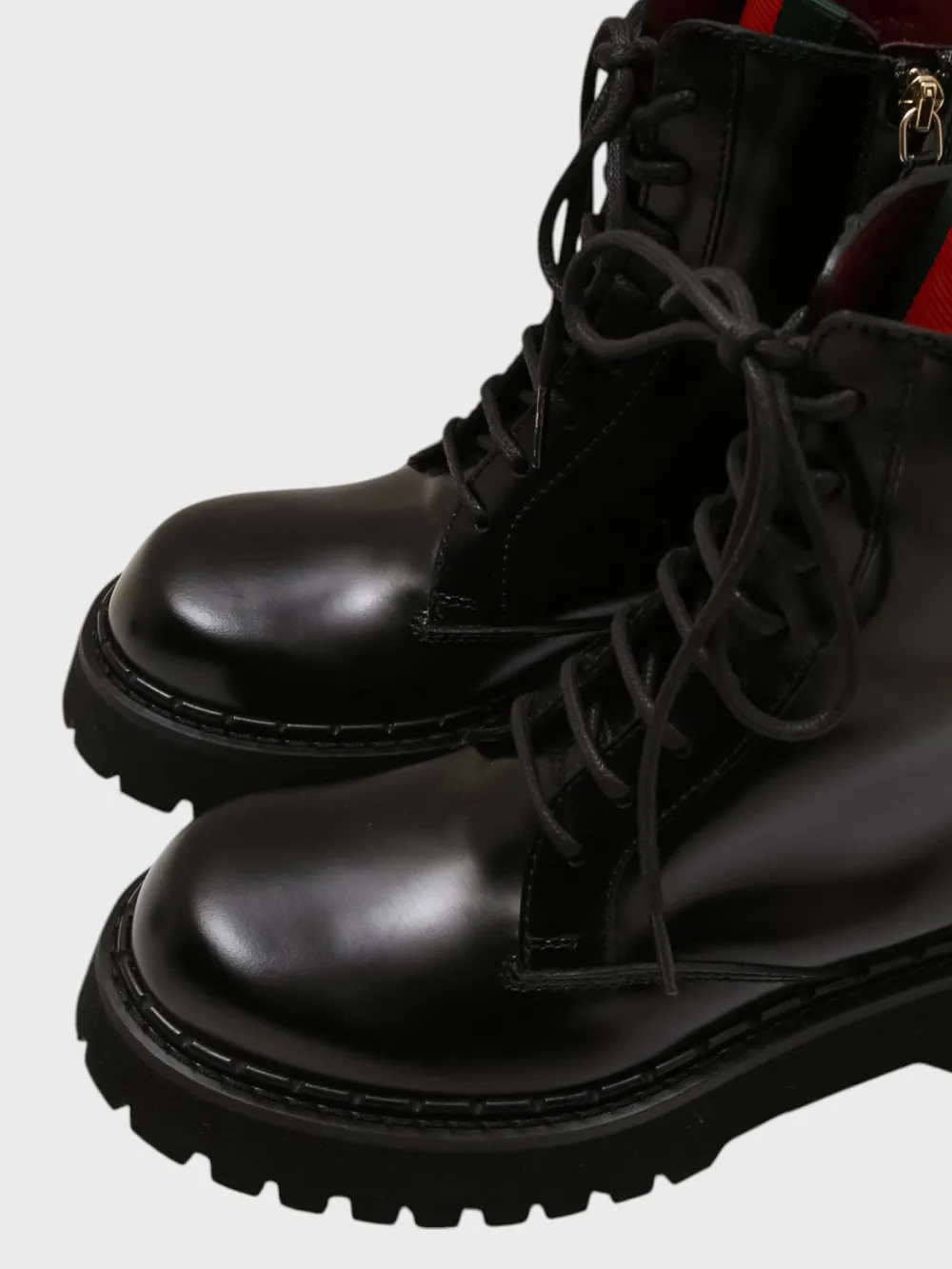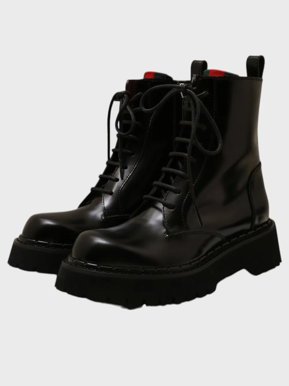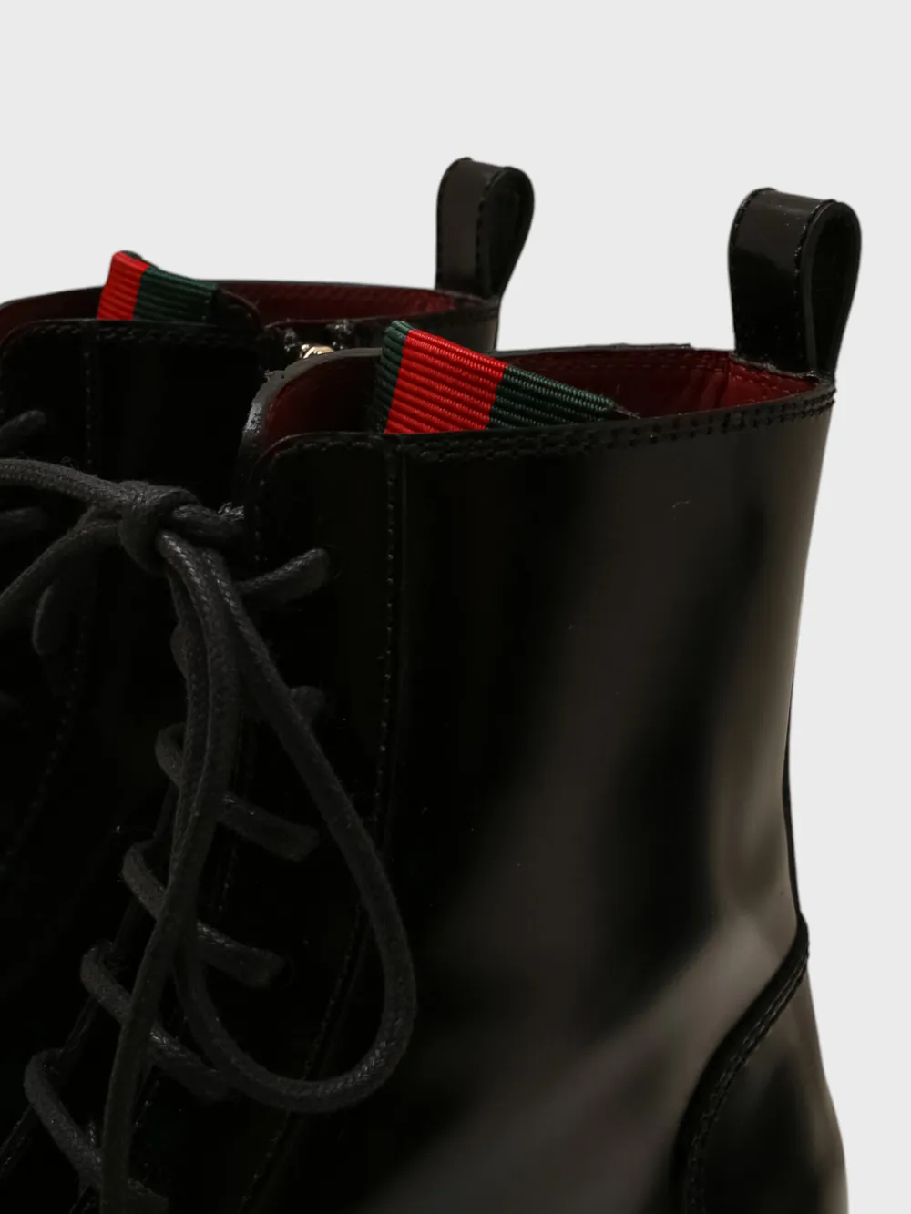 Ботинки Gucci выполнены из черной лаковой кожи с глянцевым эффектом, что придает модели современный и роскошный вид. Модель дополнена шнуровкой на металлических пуговицах, которая обеспечивает комфортную посадку. Тщательная работа над деталями — от ровных швов до текстуры подошвы — подчеркивает высокое качество исполнения. Ботинки идеально подходят для повседневной носки, сочетая стиль и комфорт.