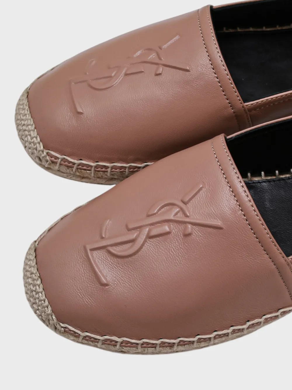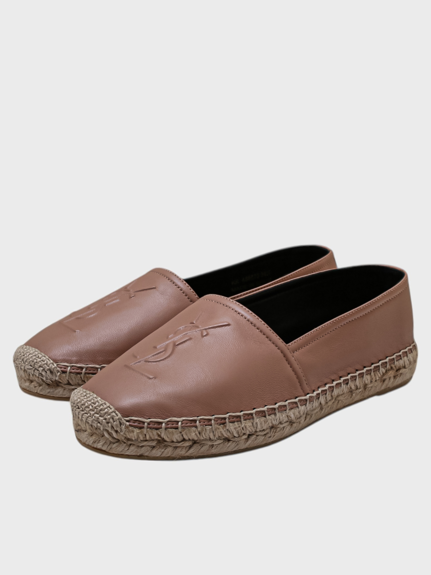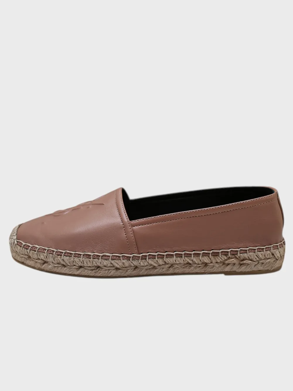 Эспадрильи Saint Laurent выполнены из светло-коричневой кожи с элегантным дизайном. Модель дополнена плетеной подошвой, которая придает ей легкость и комфорт. Детали логотипа на верхней части создают акцент на роскоши бренда. Простой крой и удобная посадка делают эти эспадрильи идеальным выбором для повседневного использования или летнего отдыха.