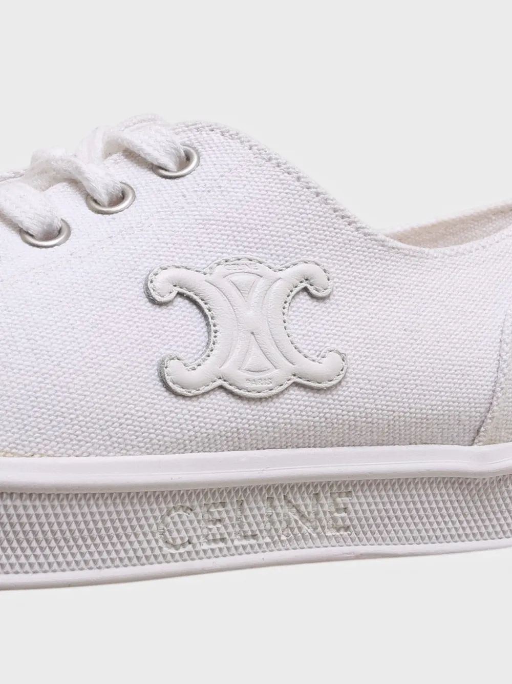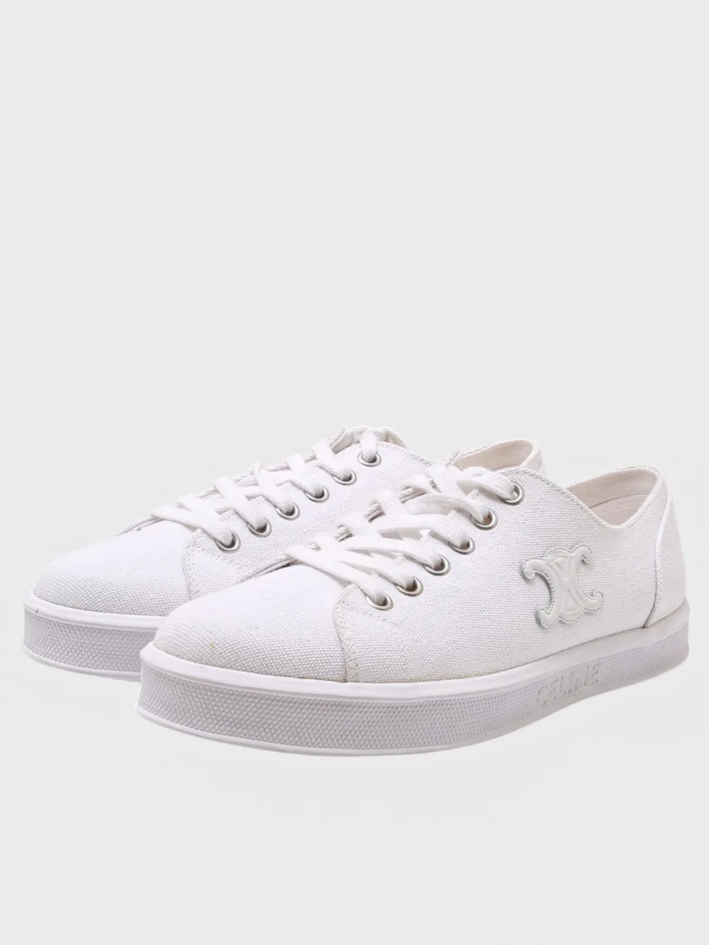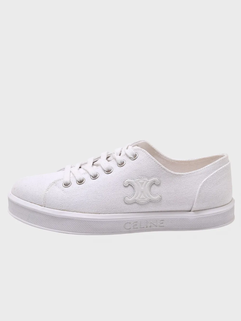 Кеды Celine выполнены из белой ткани с лаконичным дизайном и крупным вышитым логотипом бренда на боковой стороне. Модель дополнена шнурками для регулировки посадки и комфортной подошвой. Простой силуэт и высокое качество материалов делают кеды универсальным выбором для повседневного стиля или спортивных мероприятий.