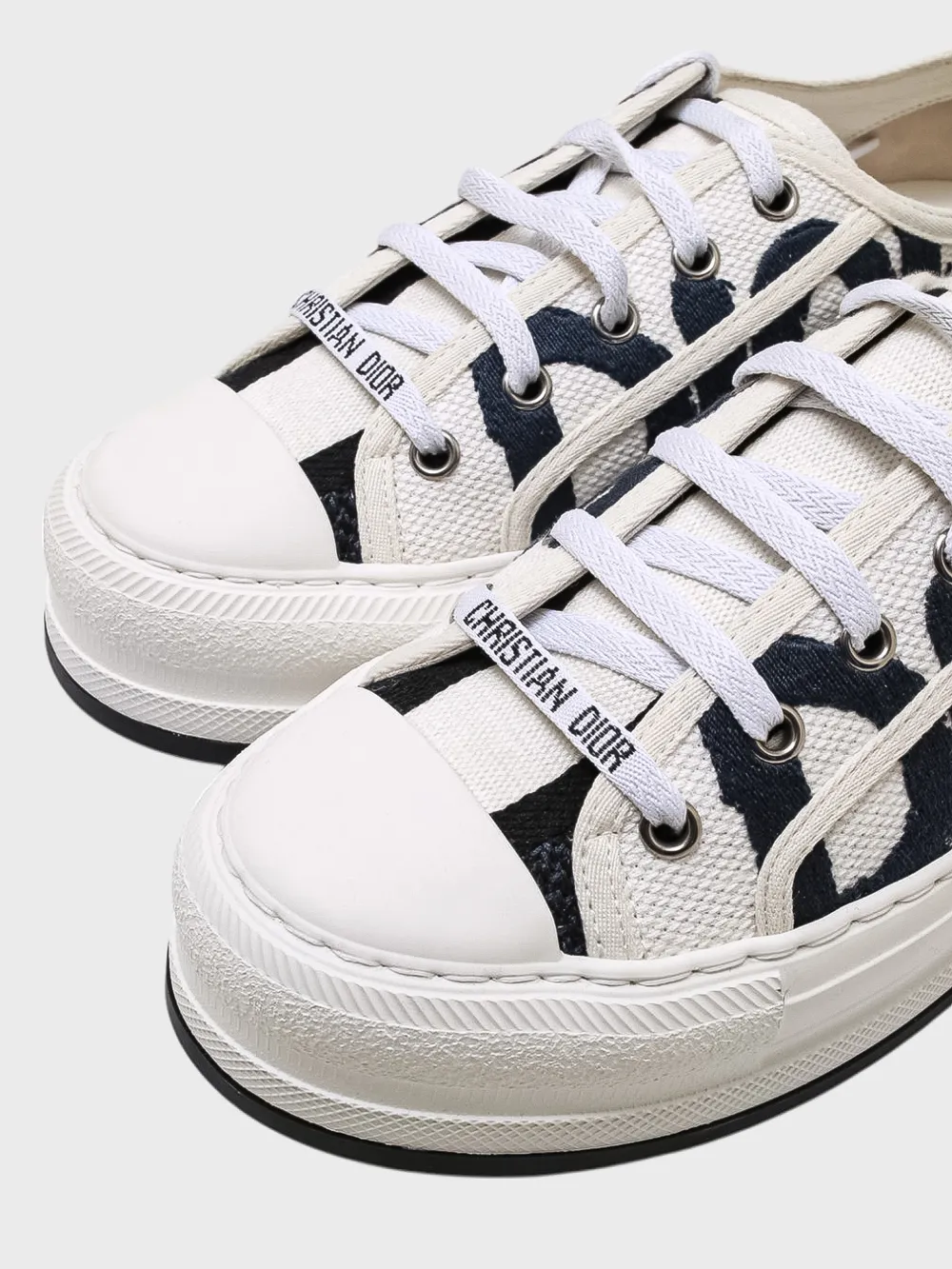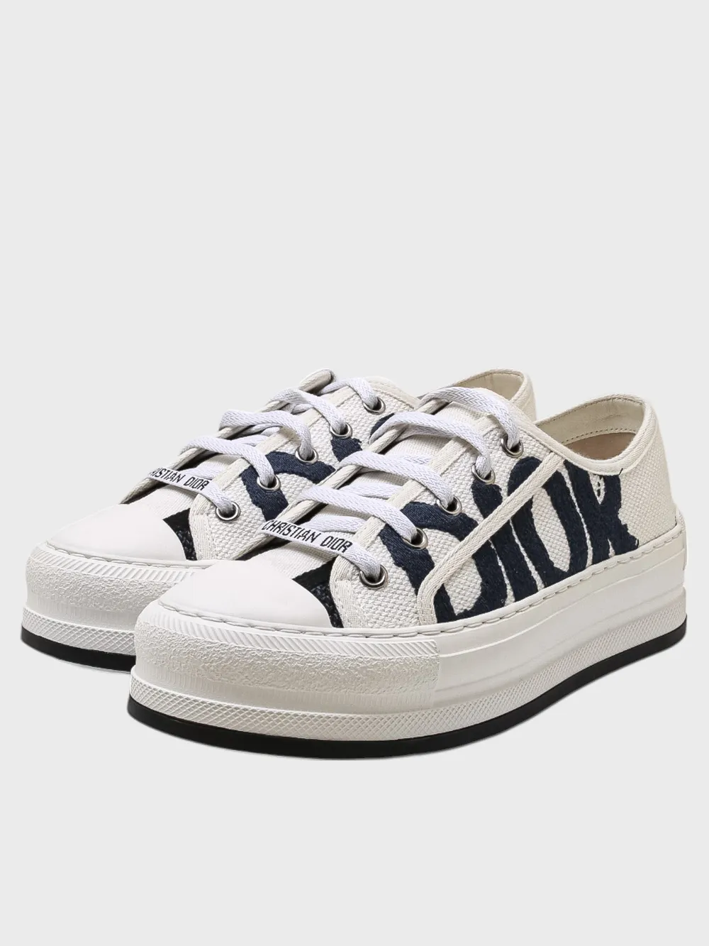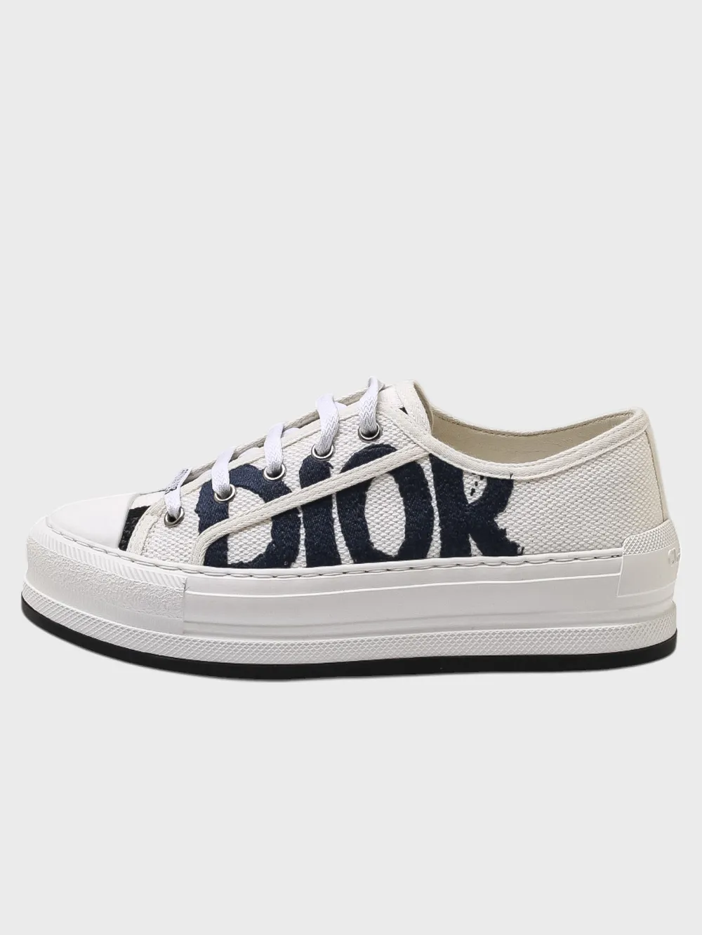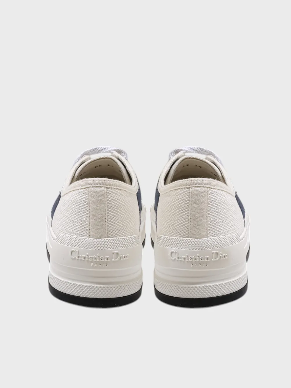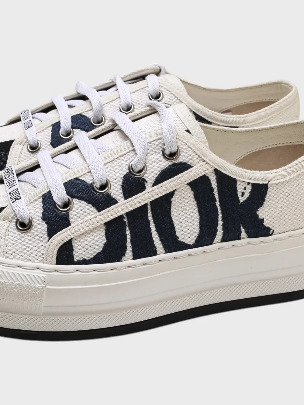 Кеды Christian Dior выполнены в современном стиле с комбинированным дизайном. Верхняя часть кроссовок сочетает белый текстиль и темно-синий принт, создавая контрастный эффект. Белые шнурки добавляют чистоту образа и усиливают акцент на цветовом решении. Подошва выполнена из резины с текстурой для лучшей устойчивости и комфорта при ходьбе. Модель дополнена декоративными элементами с логотипом "Christian Dior" и адресом "30 Avenue Montaigne", что подчеркивает премиальность изделия. Удобная конструкция и безупречное качество исполнения делают эти кеды идеальным выбором для повседневного использования или спортивного образа. Их универсальность позволяет сочетать их с различными типами одежды.