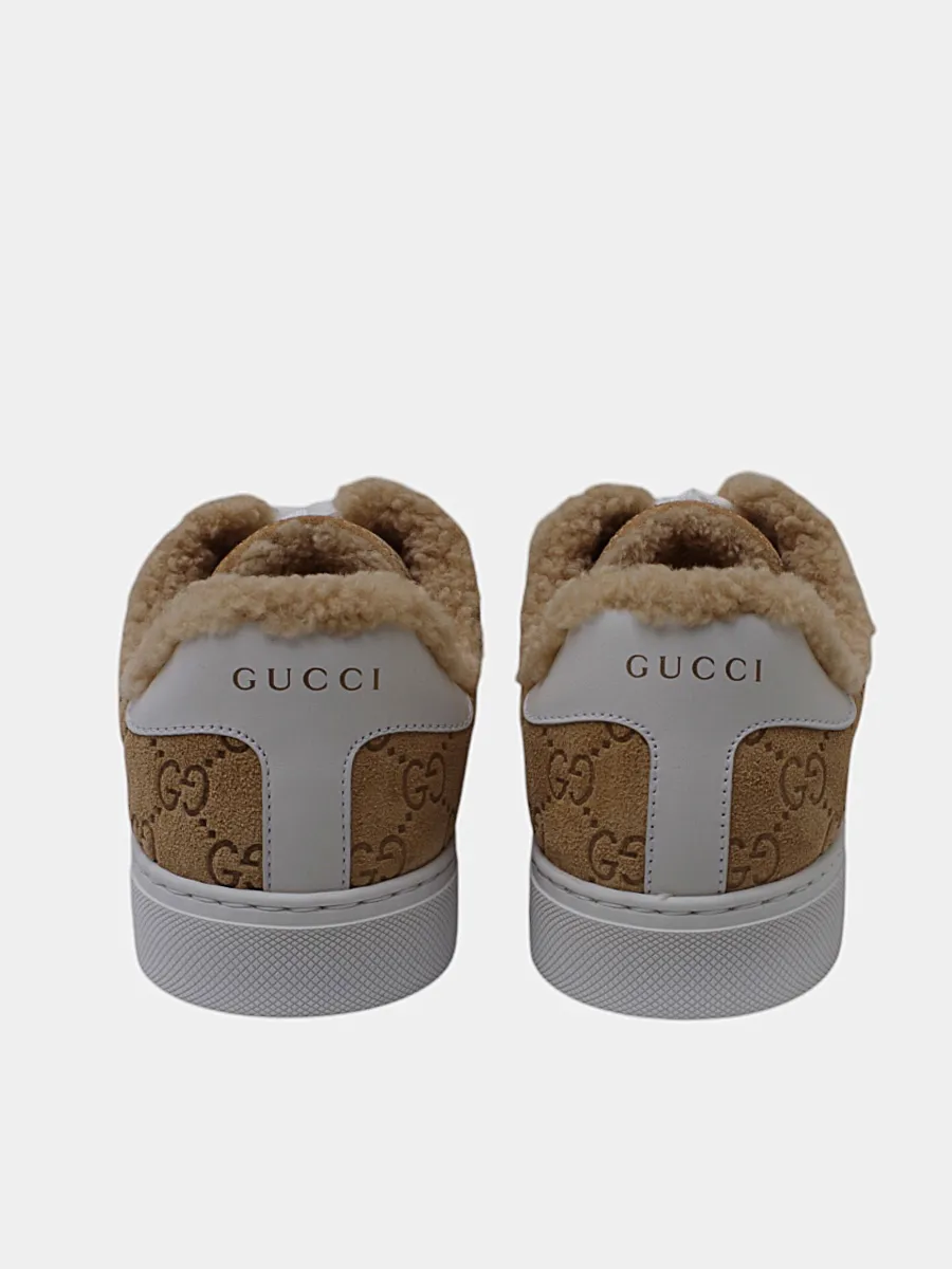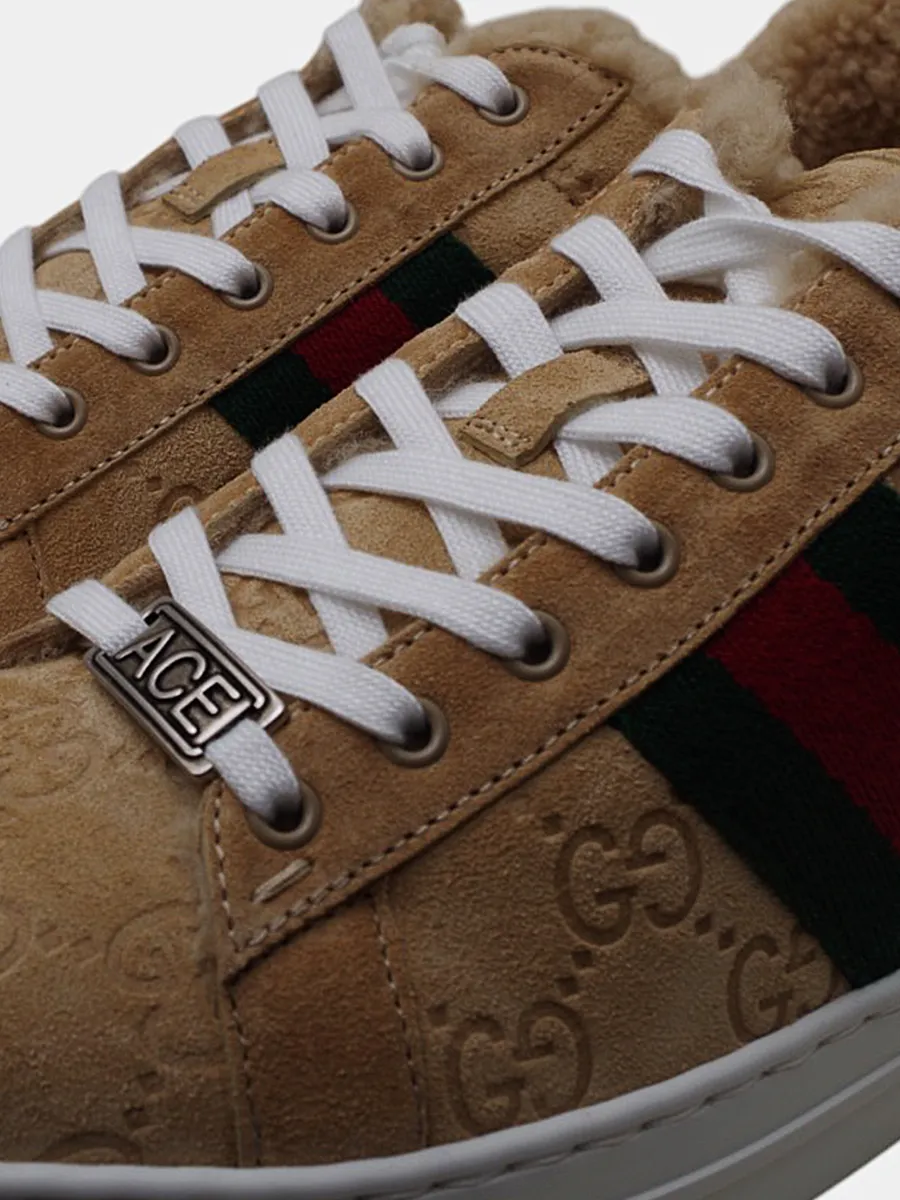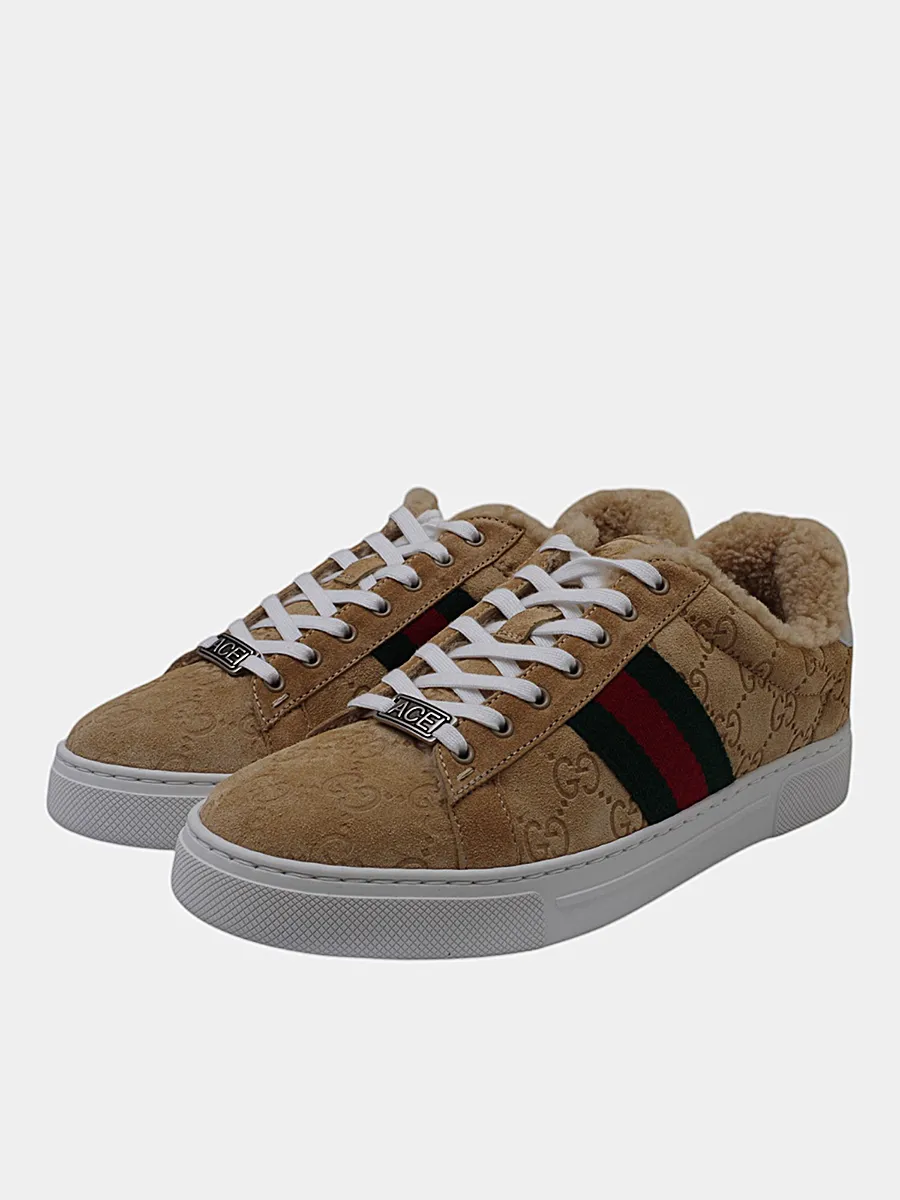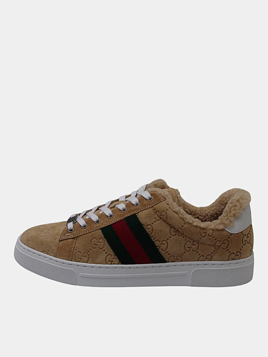 Кеды Gucci выполнены из фактурной замши с фирменным монограммным принтом GG, дополнены контрастной полосой в стиле Web и мягкой меховой отделкой внутри. Модель сочетает узнаваемый дизайн бренда, комфортную посадку и стильный внешний вид — идеальный выбор для современного образа с ноткой роскоши.