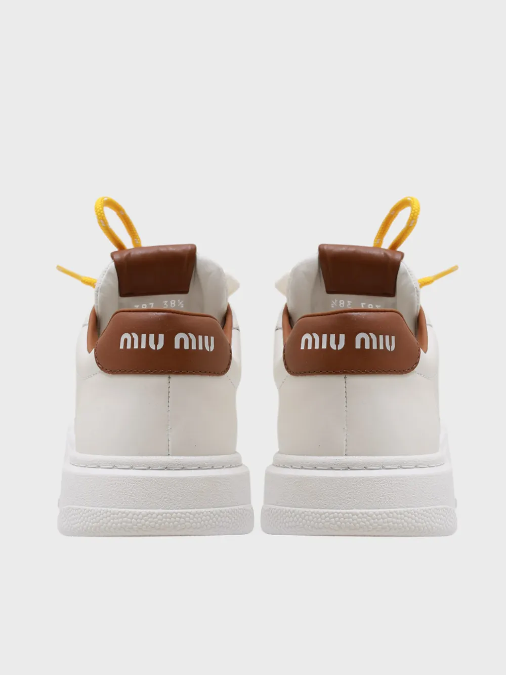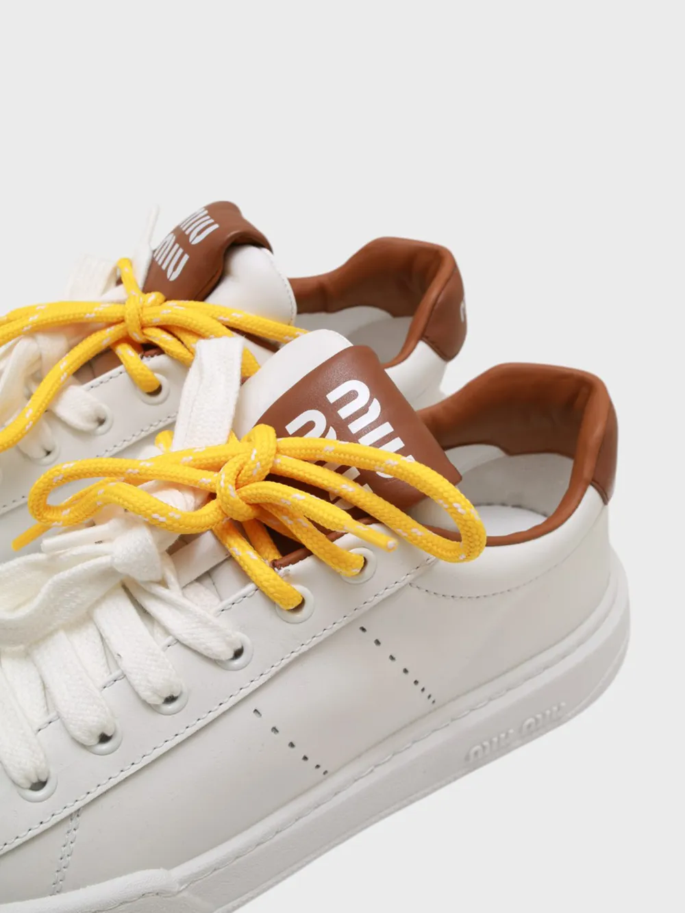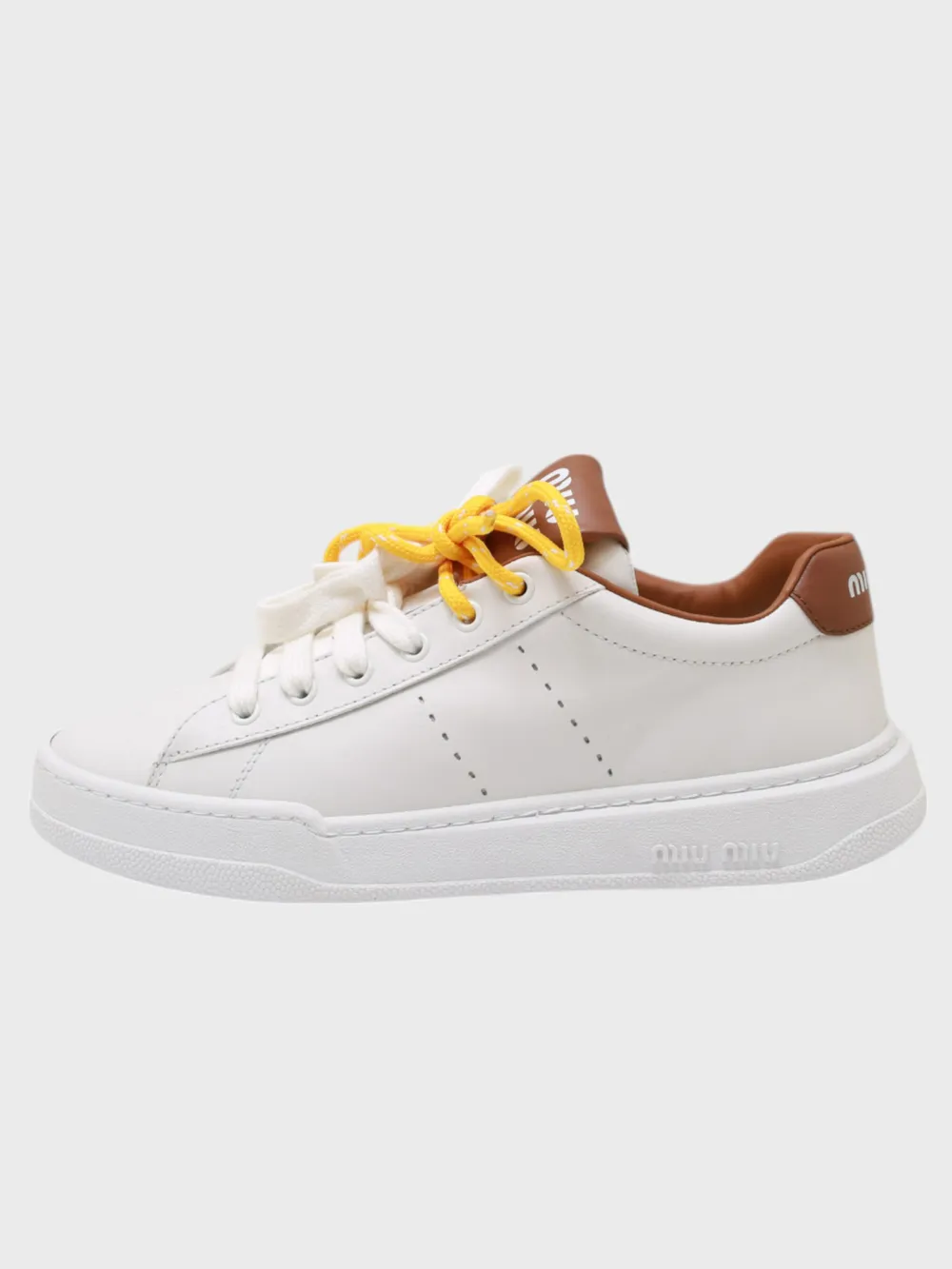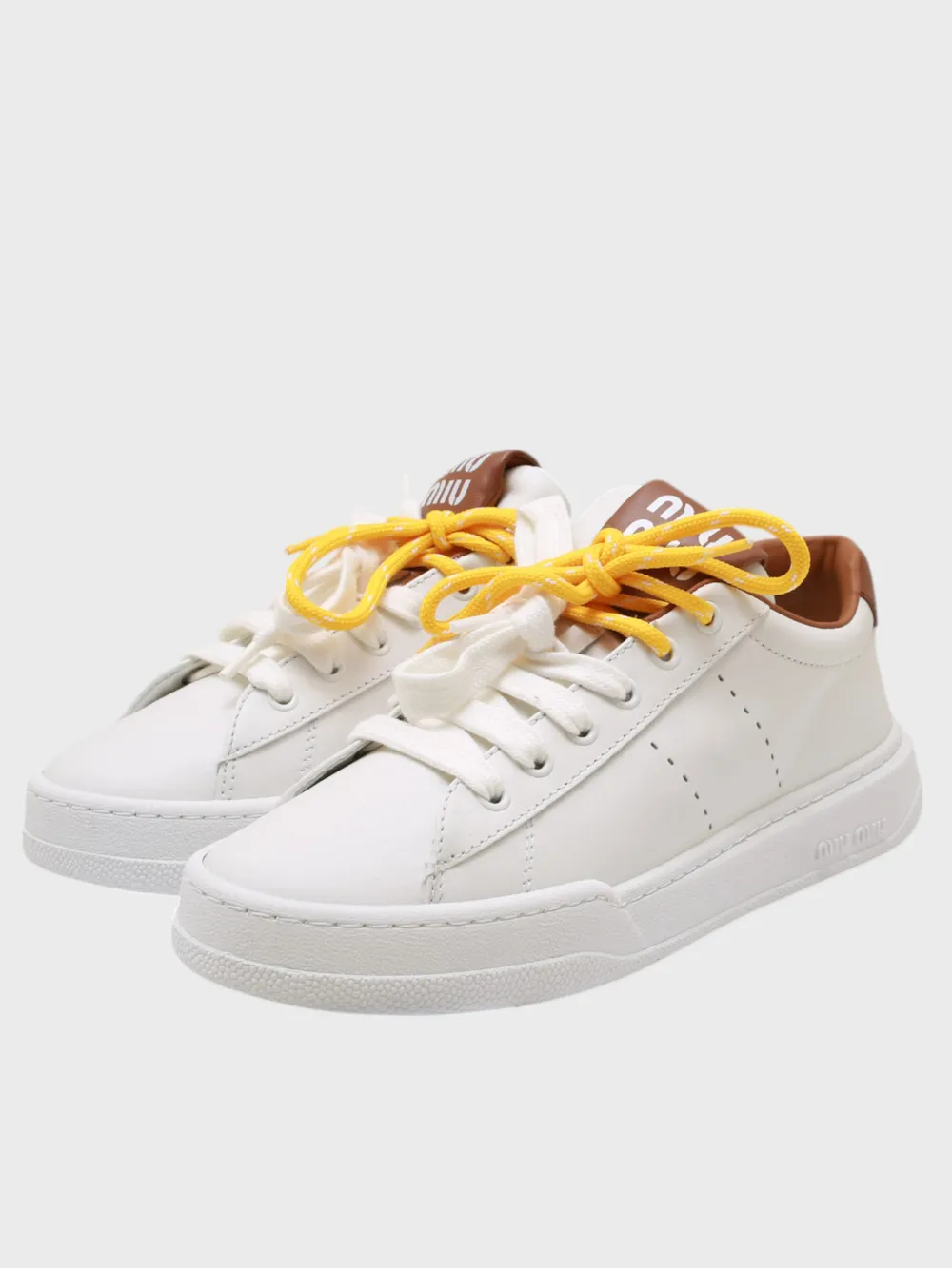 Кеды Miu Miu выполнены из белой кожи с акцентами коричневого цвета на язычке и задней части. Модель дополнена яркими желтыми шнурками, которые создают контрастный акцент. Устойчивая подошва обеспечивает комфорт при длительной носке. Стильные и модные — идеальный выбор для повседневного образа, сочетающий современность и практичность.