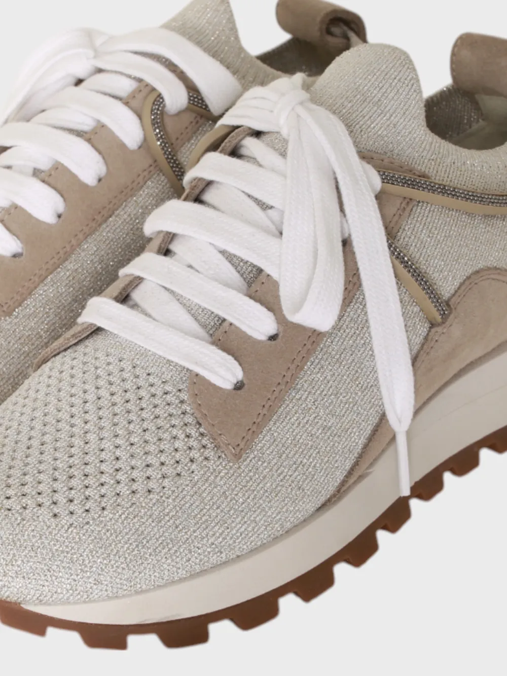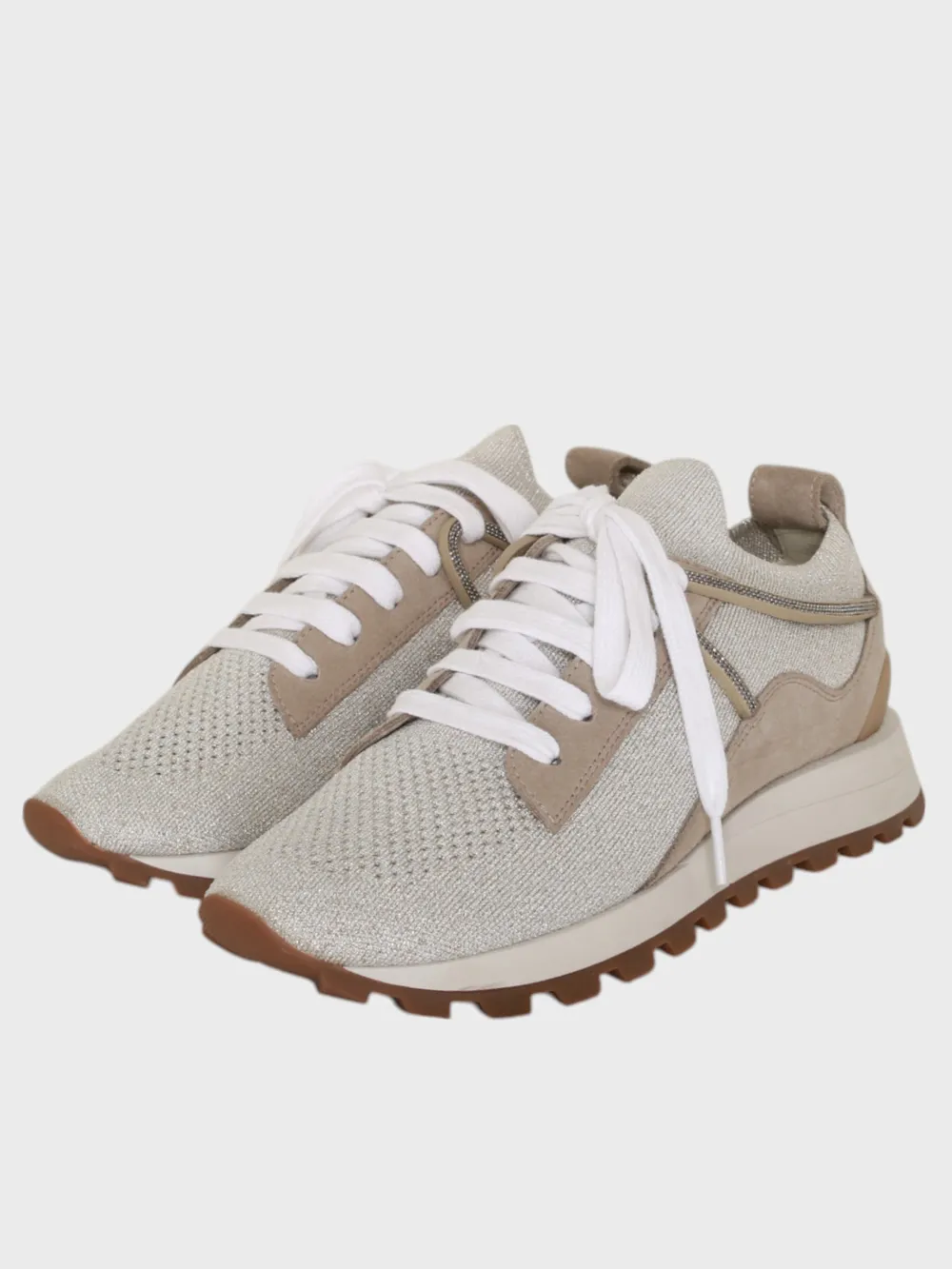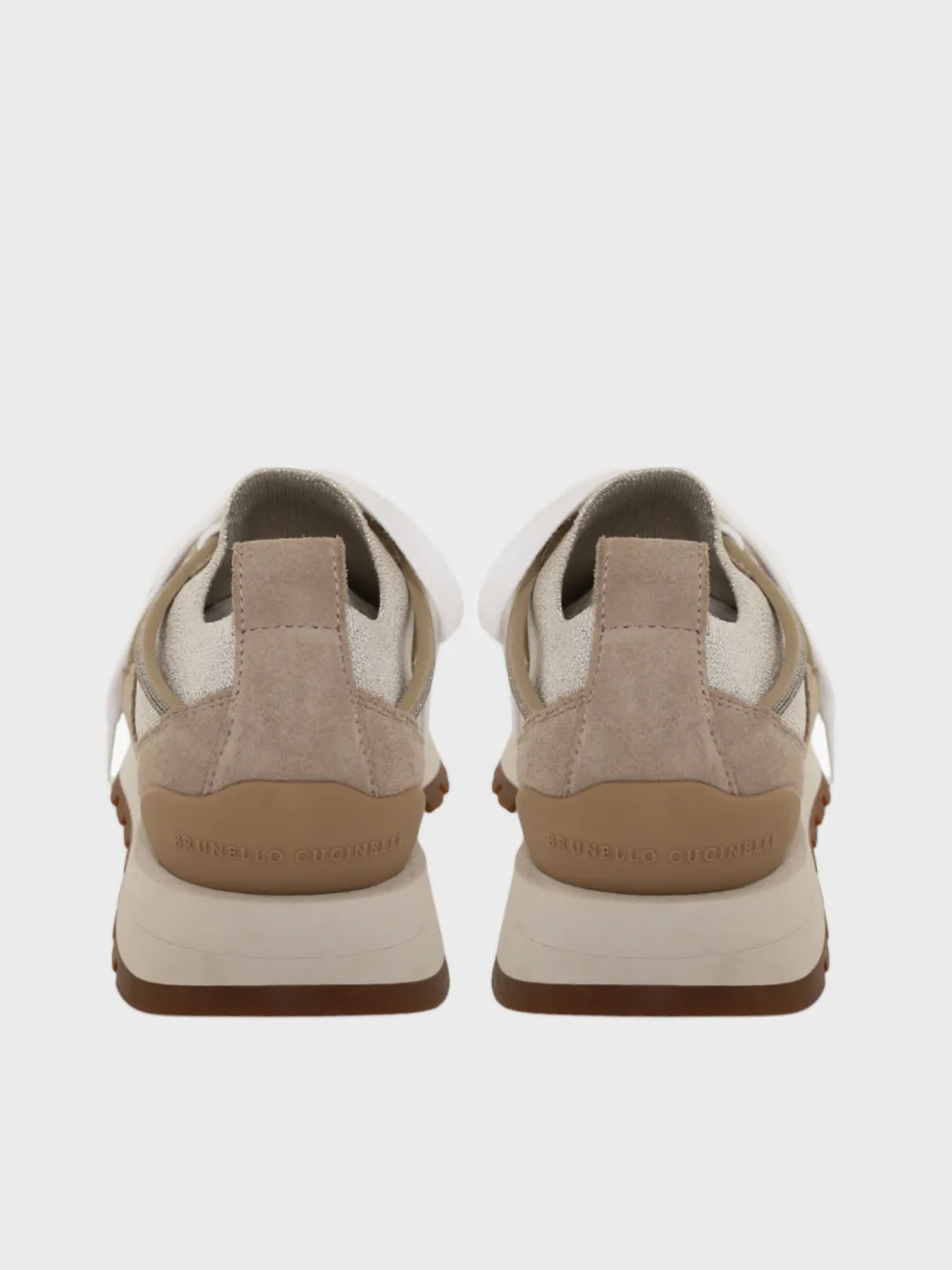 Кеды Brunello Cucinelli выполнены из светло-бежевой кожи с блестящим эффектом. Модель дополнена белыми шнурками, которые создают контрастный акцент. Устойчивая подошва обеспечивает комфорт при длительной носке. Стильные и модные — идеальный выбор для повседневного образа, сочетающий современность и элегантность.