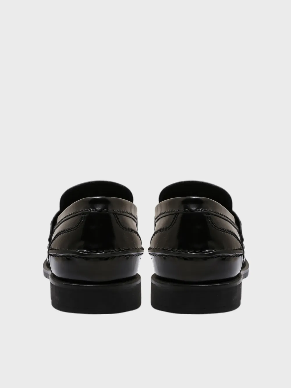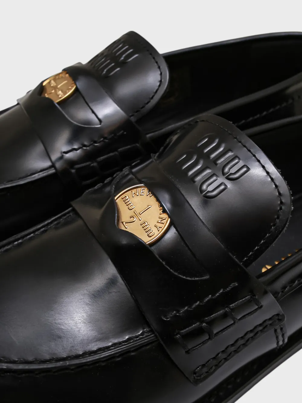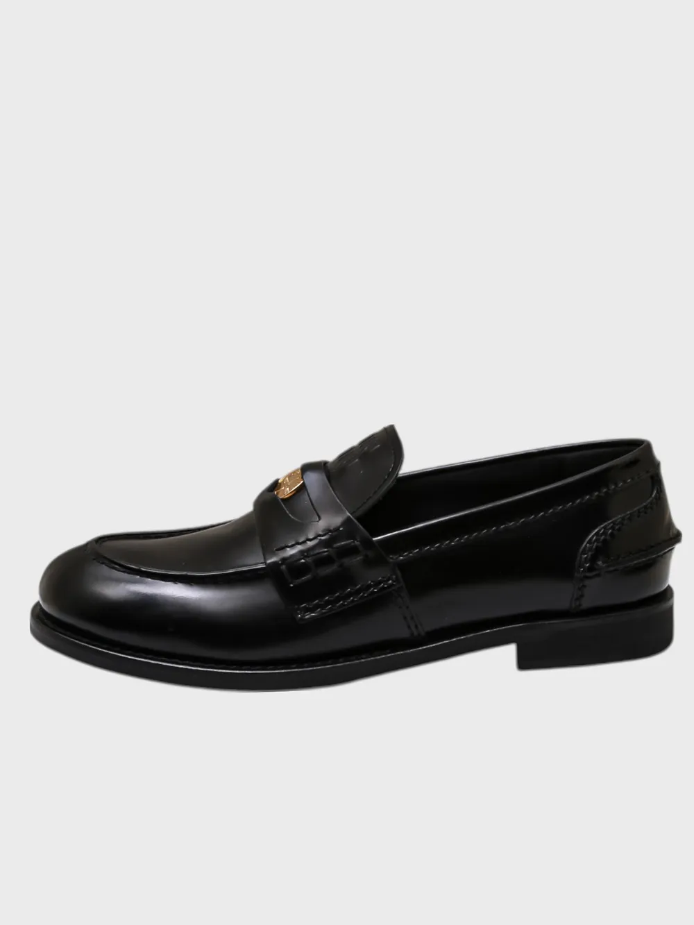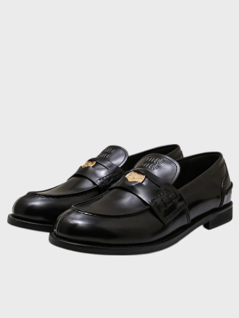 Лоферы MIU MIU выполнены из черной лаковой кожи с элегантным дизайном. Модель дополнена золотым декоративным элементом на передней части, который добавляет роскоши и узнаваемости бренда. Устойчивая подошва обеспечивает комфорт при длительной носке. Стильные и модные — идеальный выбор для делового или повседневного образа, сочетающий современность и классику.