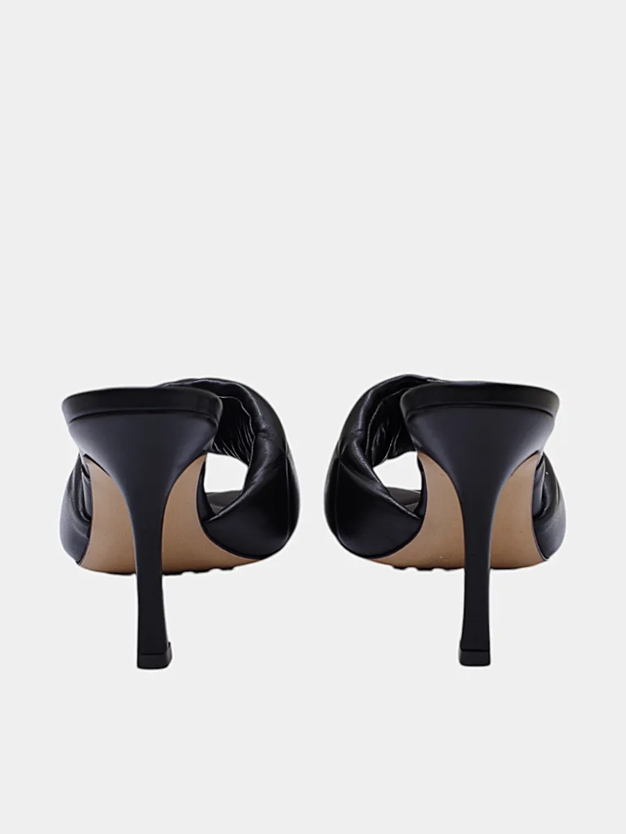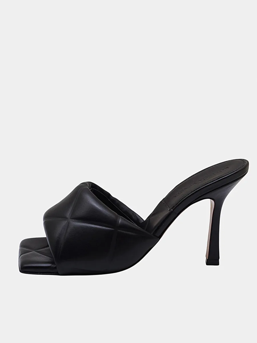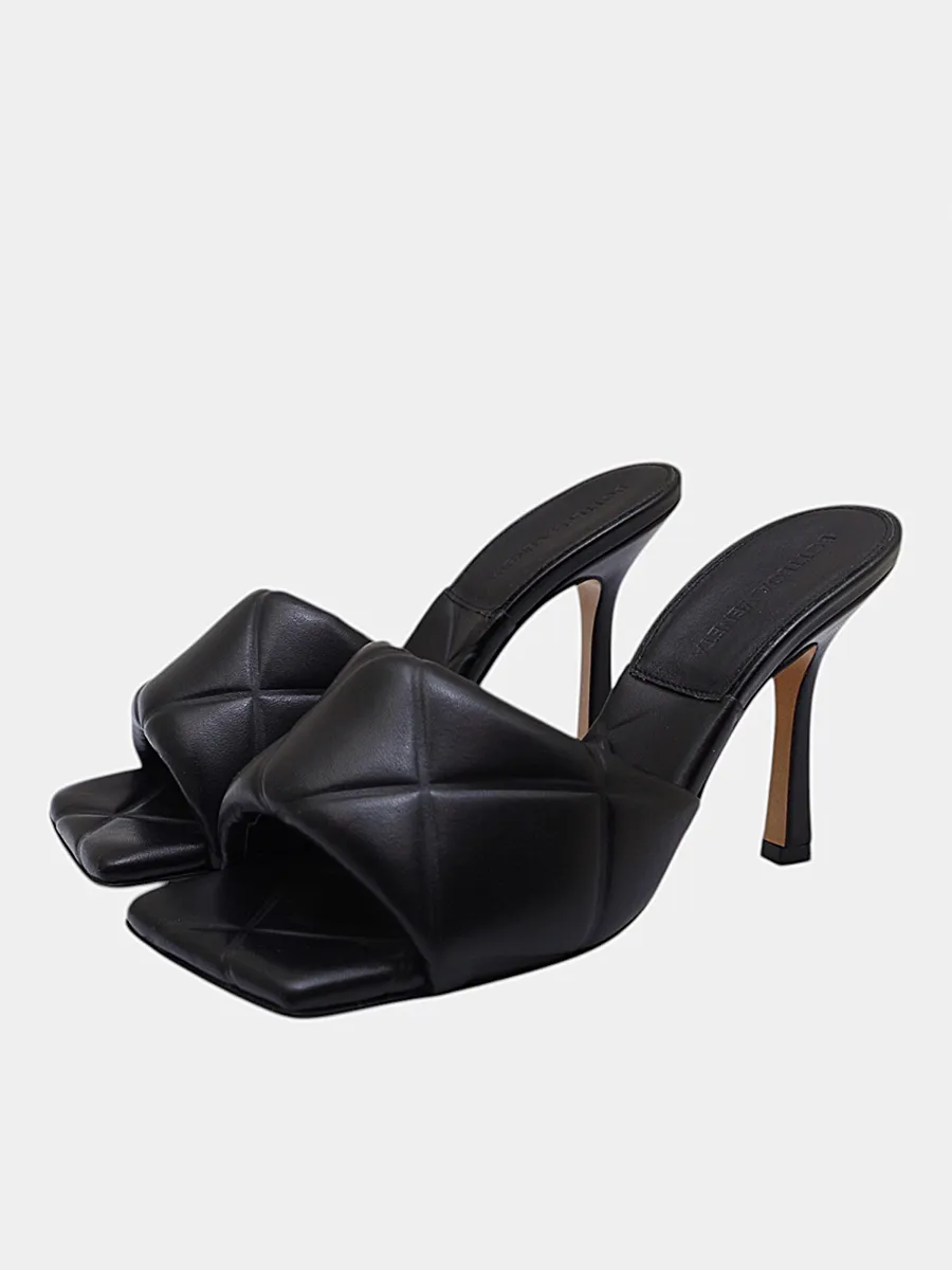 Босоножки Bottega Veneta выполнены из гладкой чёрной кожи с характерной стёганой текстурой и широким ремешком, сочетают элегантность и современный силуэт. Модель на высоком устойчивом каблуке подчёркивает качество пошива и минималистичный стиль — идеальный выбор для уверенных и роскошных образов в духе итальянской элегантности.