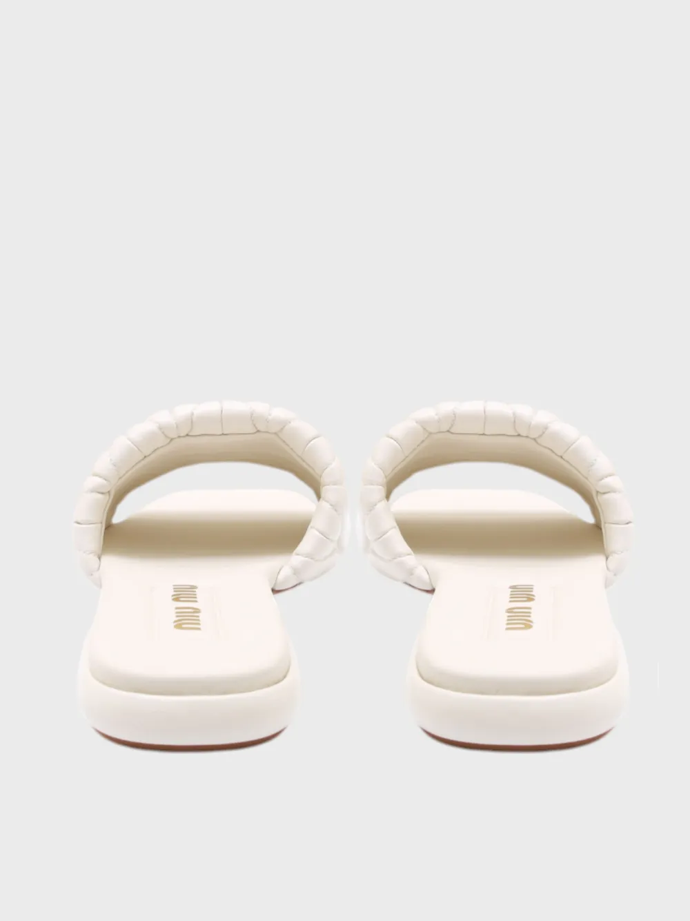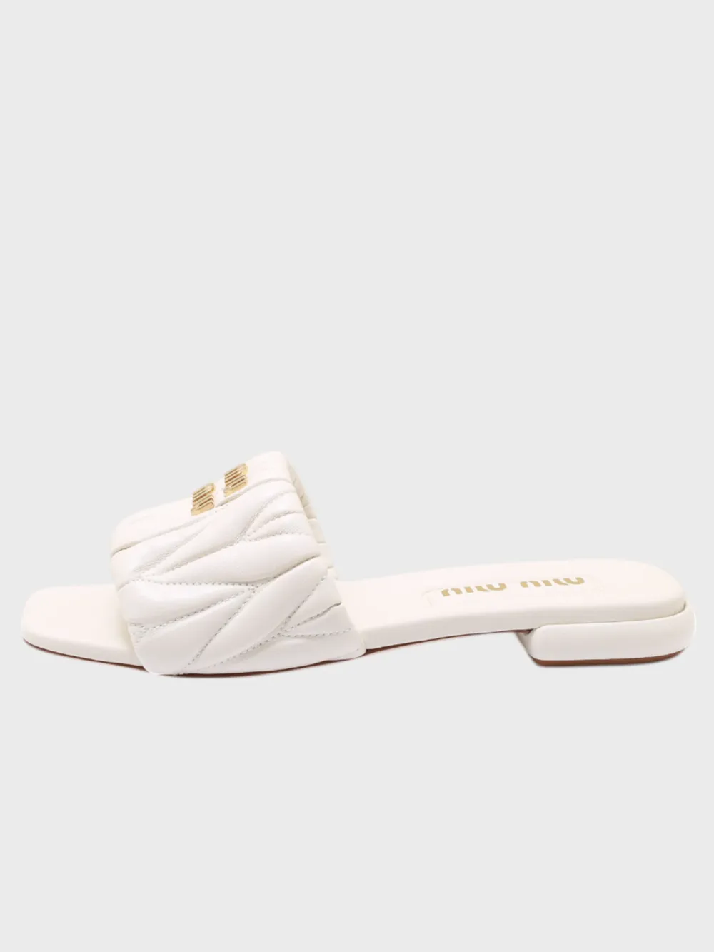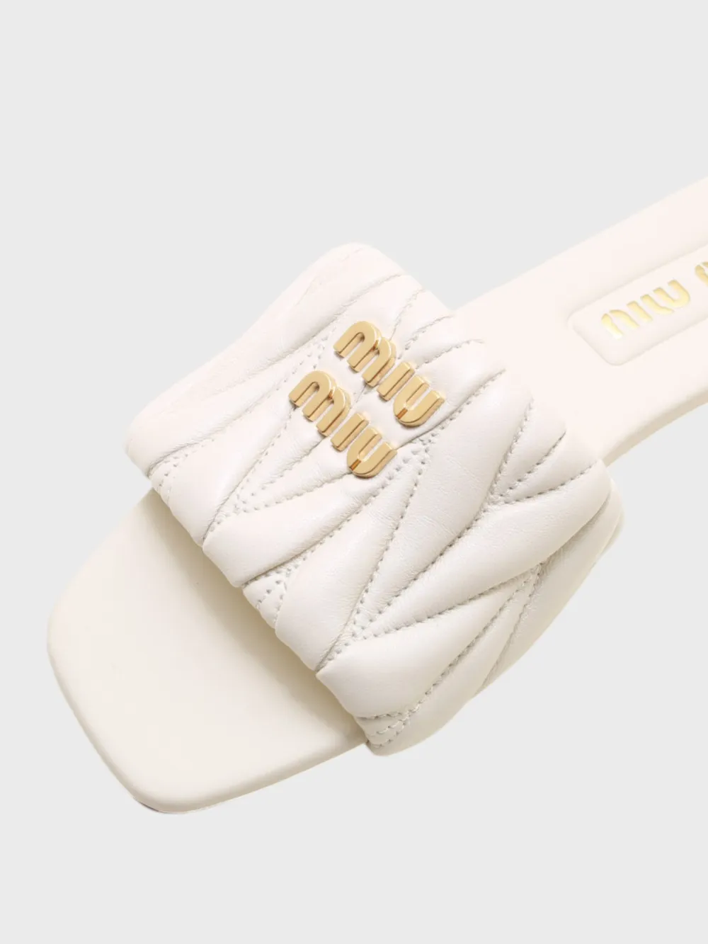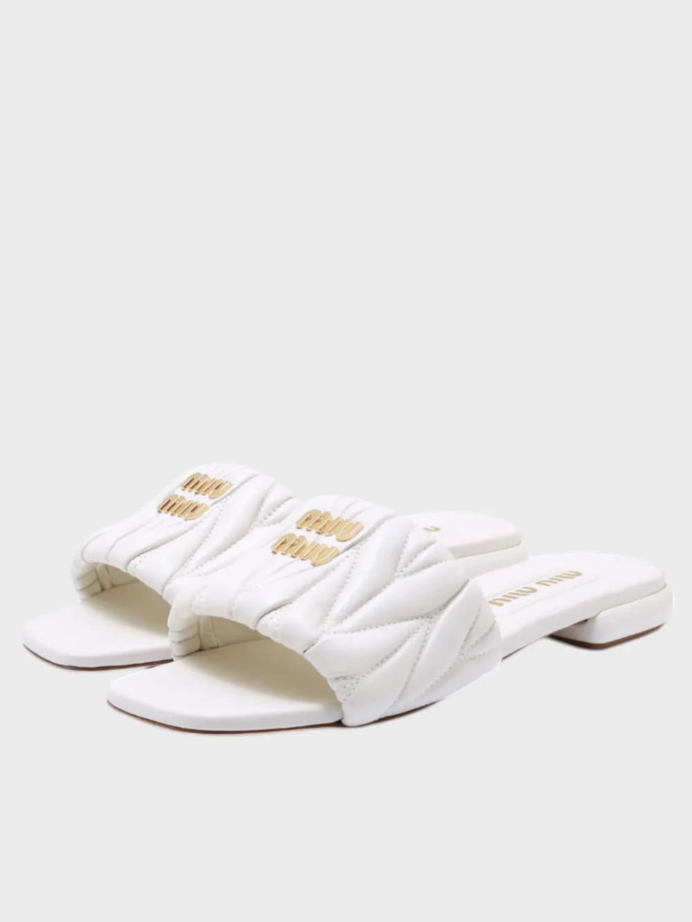 Шлепки Miu Miu выполнены из белой натуральной кожи с фактурным квадратным стежением, придающим модели современный и элегантный вид. Модель дополнена золотым логотипом бренда на ремешке, который обеспечивает комфортную посадку. Плоская подошва из качественного материала гарантирует длительное ношение без утраты формы. Идеальный выбор для летнего сезона — сочетают удобство и стиль в единстве.