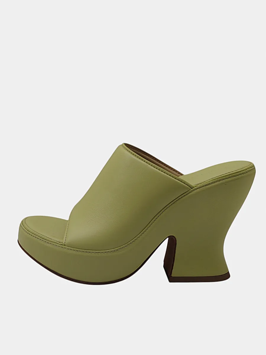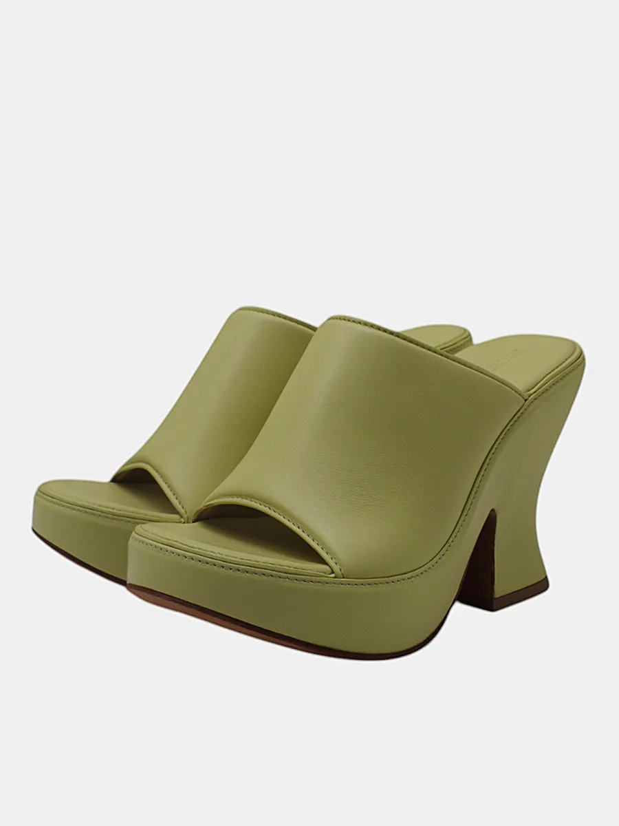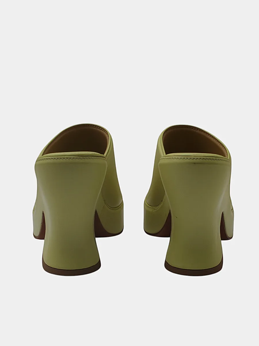 Мюли Bottega Veneta выполнены из качественной гладкой кожи оливкового цвета. Модель дополнена элегантным дизайном с широкой платформой и массивной квадратной пяткой, обеспечивающей комфорт при ходьбе. Простой крой сочетается с современным минималистичным стилем, подчеркивающим безупречное качество исполнения. Без застежек и ремешков, эти мюли идеально подходят для повседневного или вечернего образа, добавляя яркости и уверенности в каждом шаге.