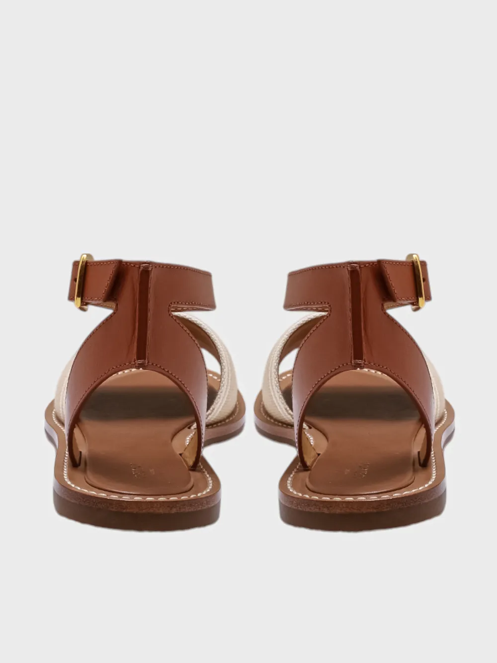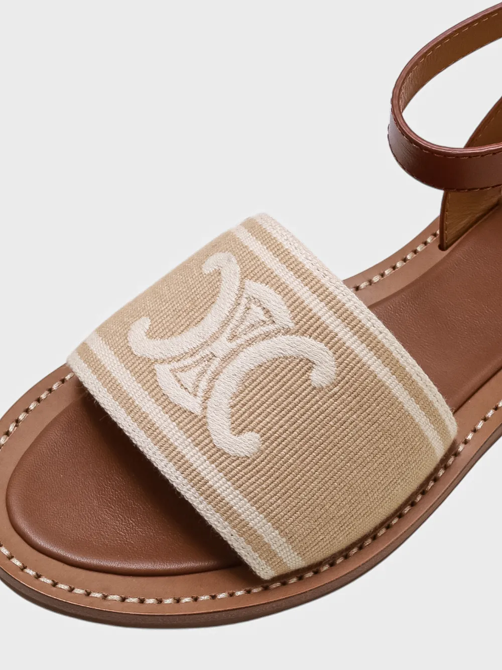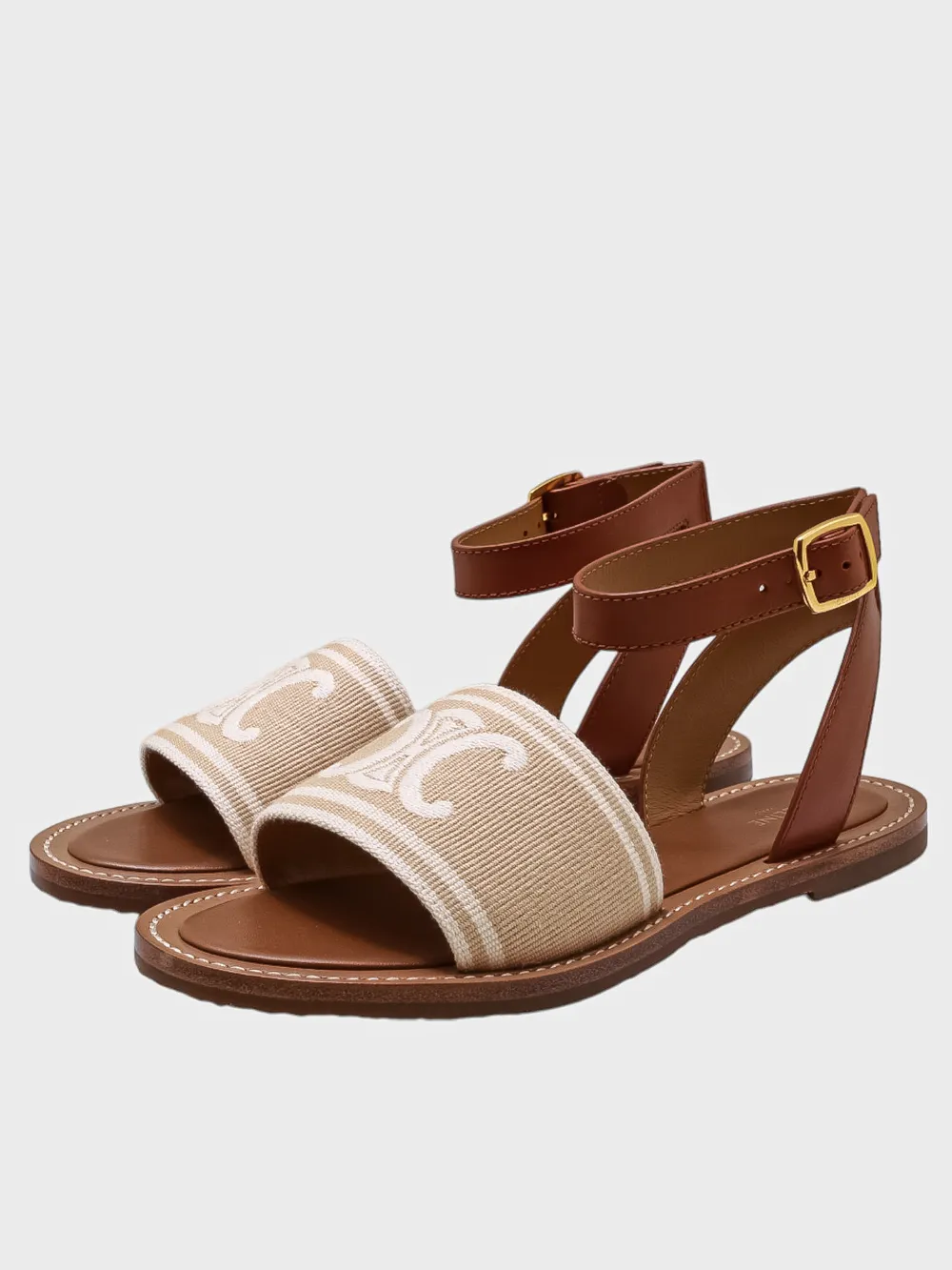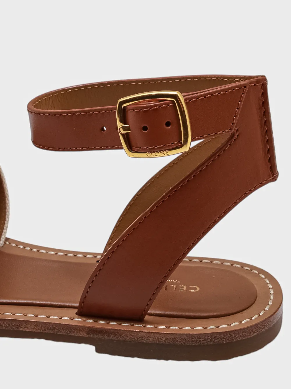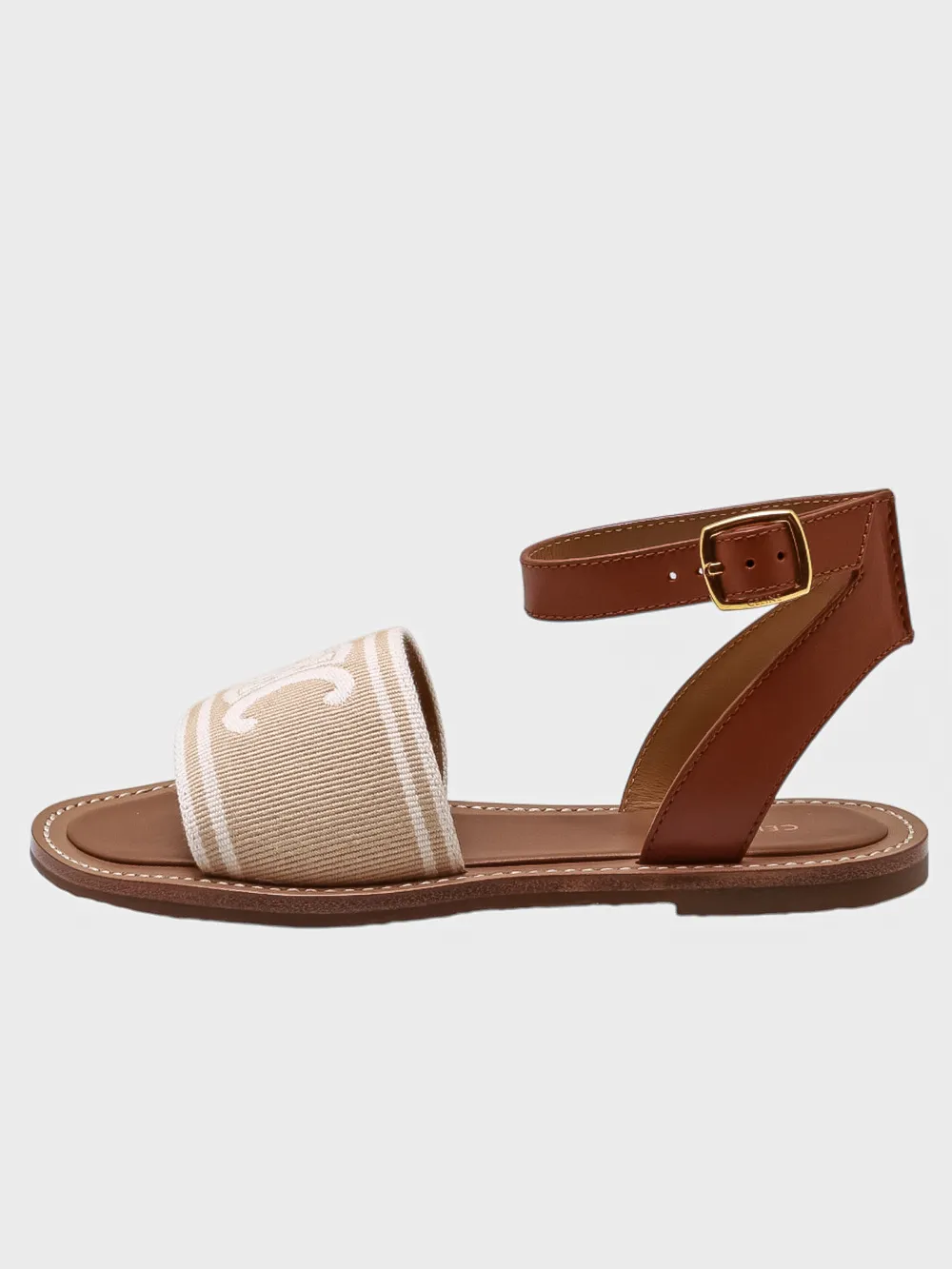 Босоножки Celine выполнены в теплом коричневом оттенке из натуральной кожи. Модель дополнена эластичным ремешком с золотой пряжкой, обеспечивающей комфортную посадку и регулировку размера. На передней части босоножек расположен декоративный элемент из ткани с крупным белым логотипом "CELINE". Удобная подошва гарантирует комфорт при длительной носке. Идеально подходят для летнего сезона и повседневной носки.