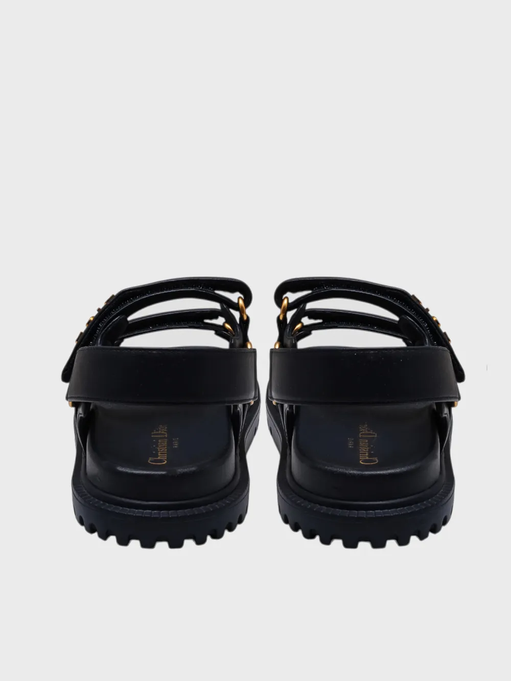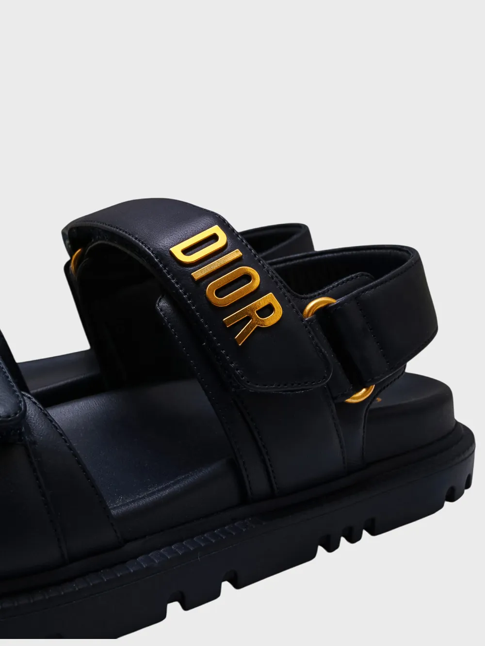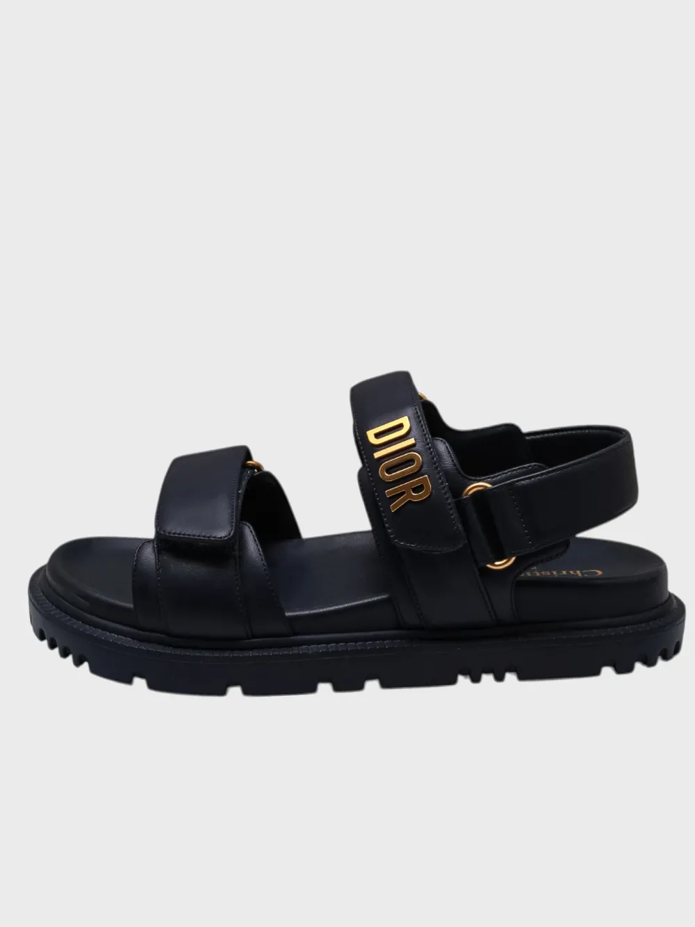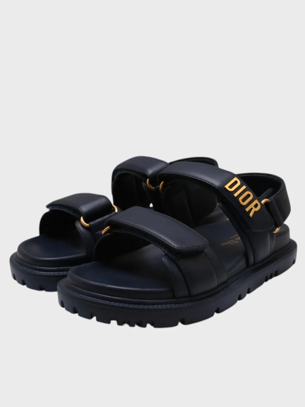 Обувь Christian Dior представляет собой черные сандалии из качественной кожи. Модель оснащена двумя ремешками с золотыми застежками и логотипом "Dior" на верхнем ремешке. Подошва массивная, обеспечивает комфорт при длительной носке. Удобный дизайн для повседневного использования.