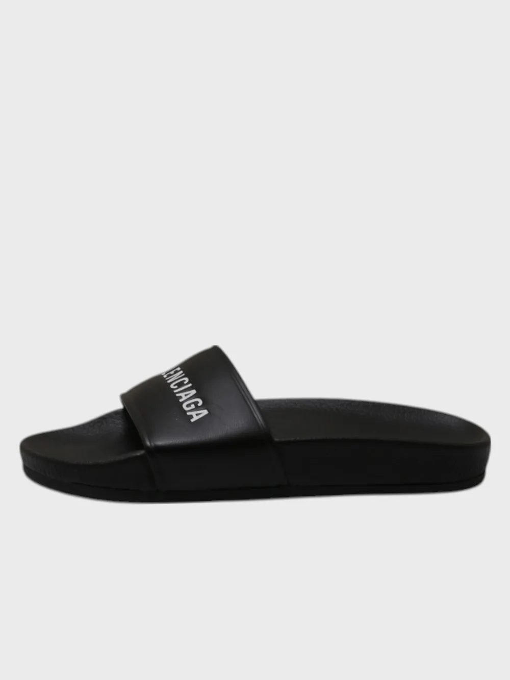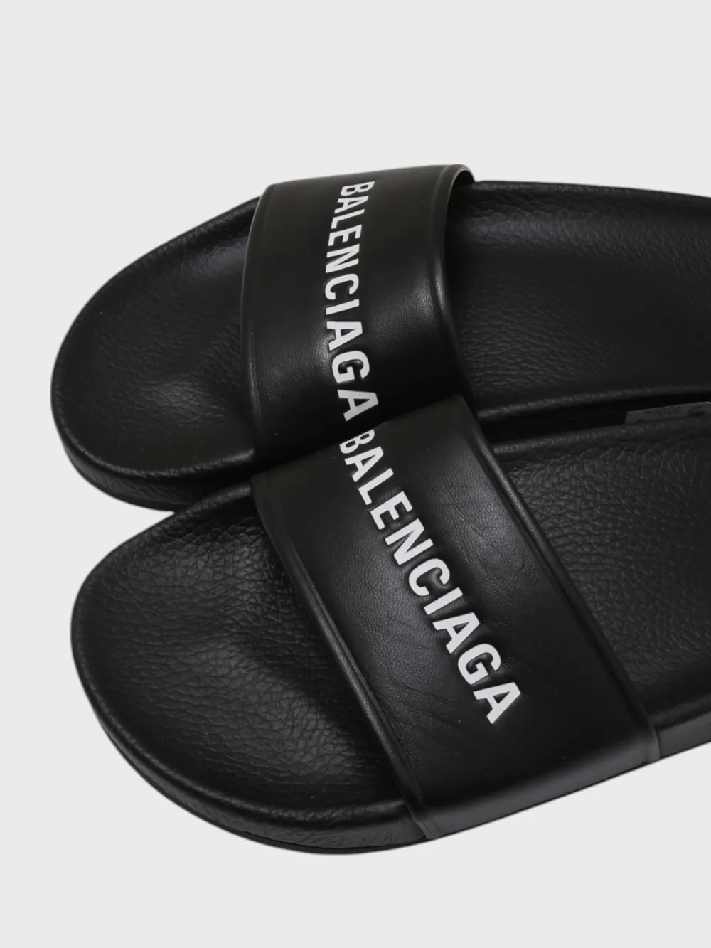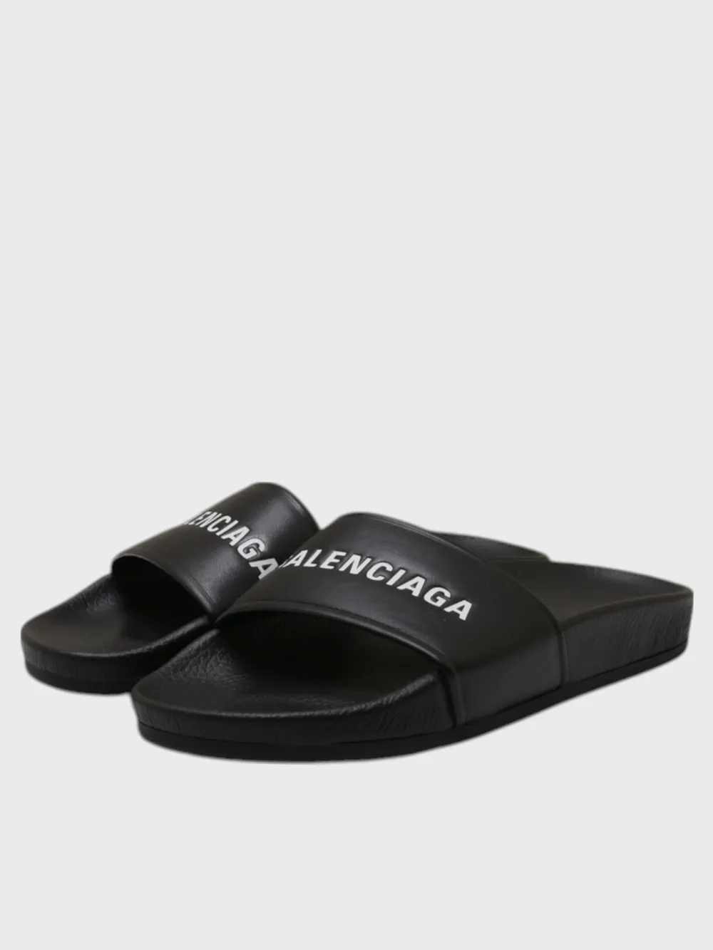 Шлепки Balenciaga выполнены из черной кожи с текстурой, которая придает им уникальный внешний вид. Модель дополнена белым логотипом бренда на ремешке, который добавляет узнаваемости и стиля. Устойчивая подошва обеспечивает комфорт при длительной носке. Стильные и модные — идеальный выбор для летнего образа, сочетающий современность и роскошь.