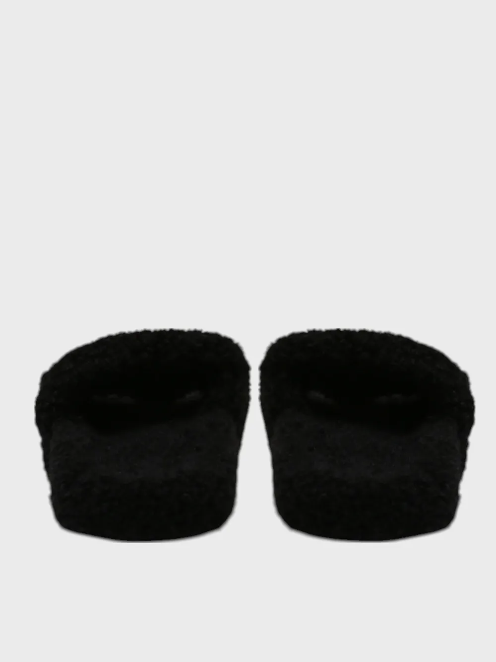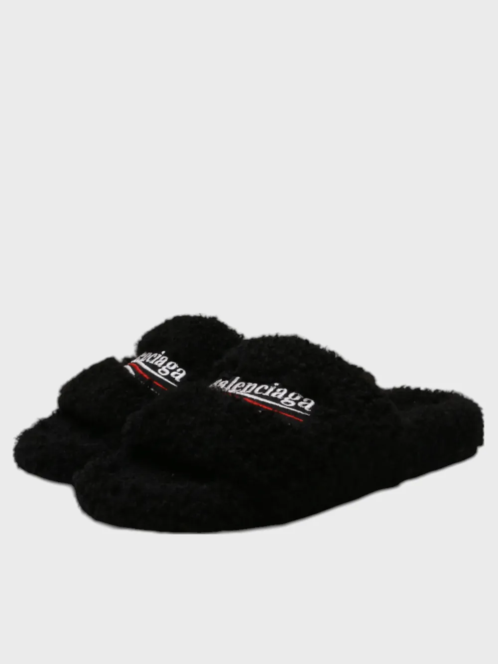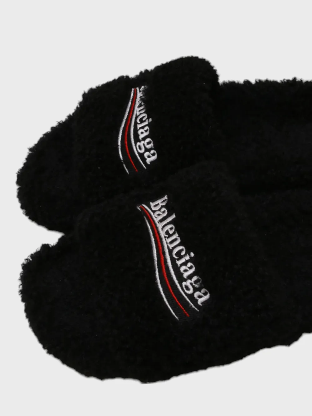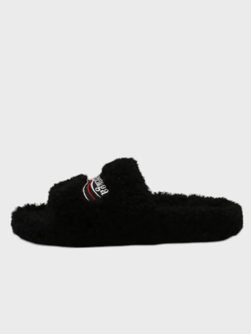 Сабо Balenciaga выполнены из черного меха с эффектом плюша, создавая уютный и теплый внешний вид. Модель сочетает минималистичный дизайн и комфортную посадку, дополненную мягкой стелькой. На верхней части сабо вышит логотип бренда "Balenciaga" в белом цвете с красной полосой, что добавляет аксессуару узнаваемость и современный стиль. Плоская подошва обеспечивает удобство при носке, а текстура меха придает изделию домашний характер.