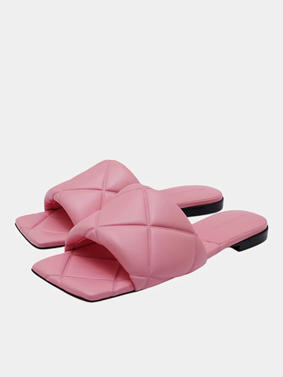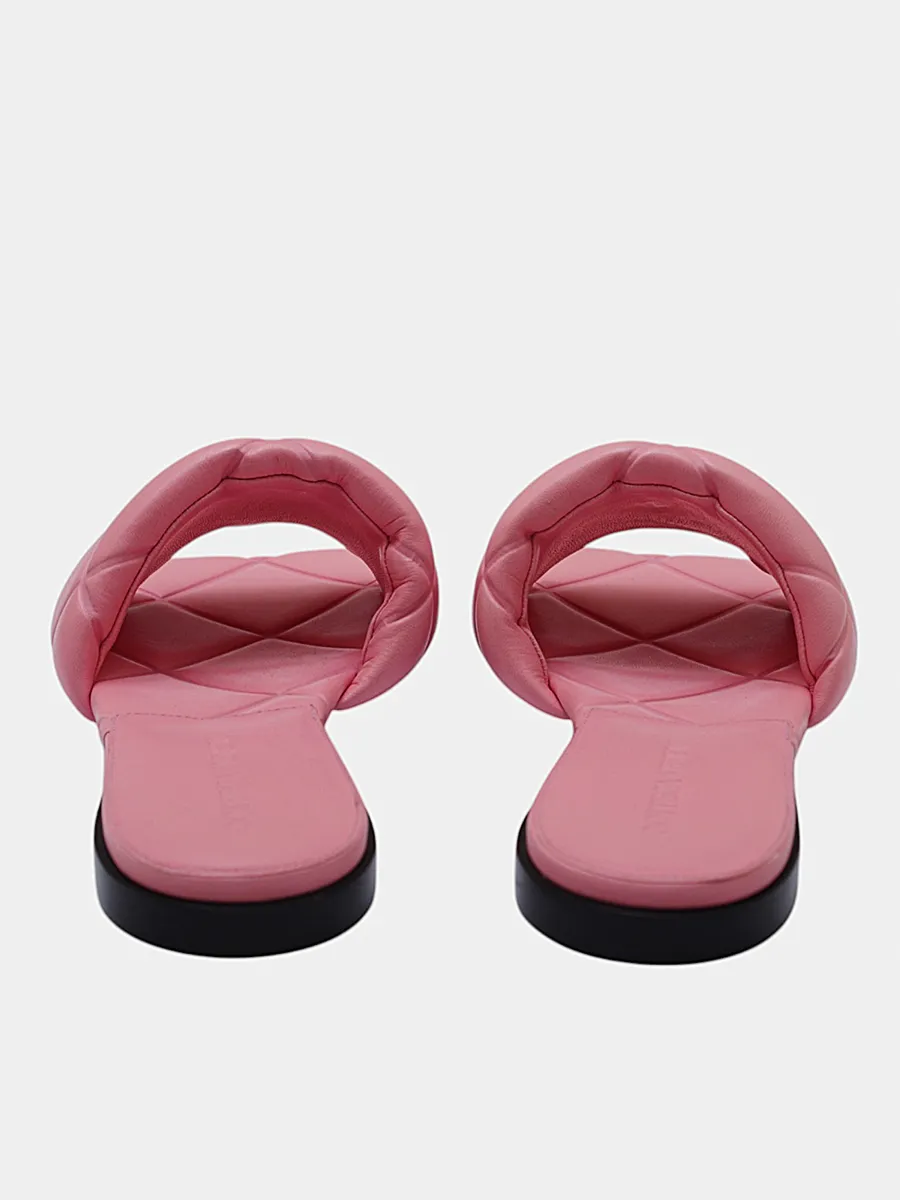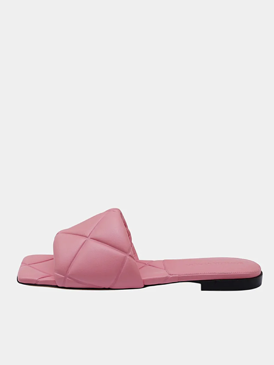 Шлепки Bottega Veneta выполнены из мягкой розовой кожи с характерной стёганой текстурой и широким ремешком, сочетают комфорт и современный дизайн. Модель на плоской подошве с чёрным основанием подчёркивает качество исполнения и минималистичный стиль — идеальный аксессуар для элегантных повседневных образов в духе итальянской роскоши.