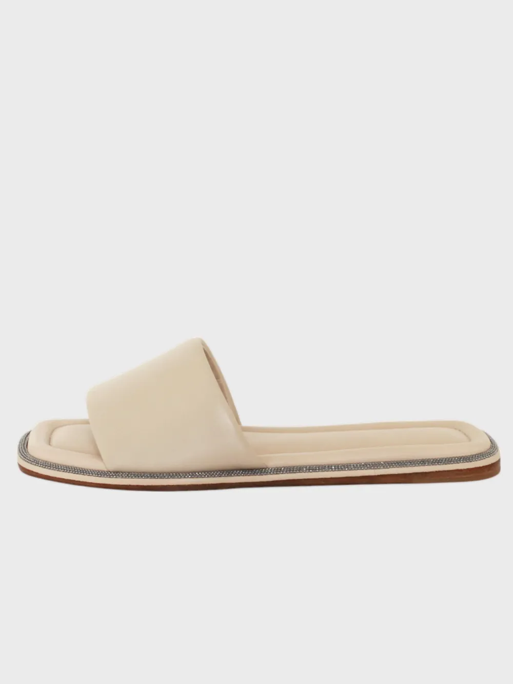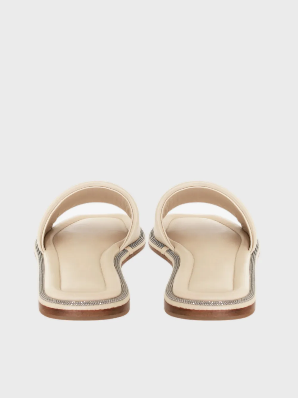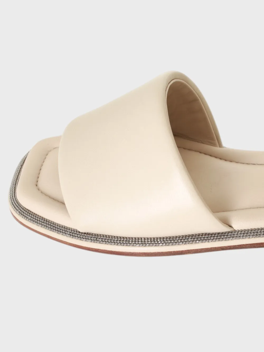 Шлепки Brunello Cucinelli выполнены из натуральной кожи нежно-бежевого цвета с контрастной деталью в виде декоративной цепочки серебристого оттенка, которая проходит по краю ремешка на носке. Модель дополнена простой и элегантной формой, а также мягкой подошвой для комфорта при ходьбе. Лаконичный дизайн и высокое качество материалов делают эти шлепки идеальным выбором для повседневной носки или отдыха.