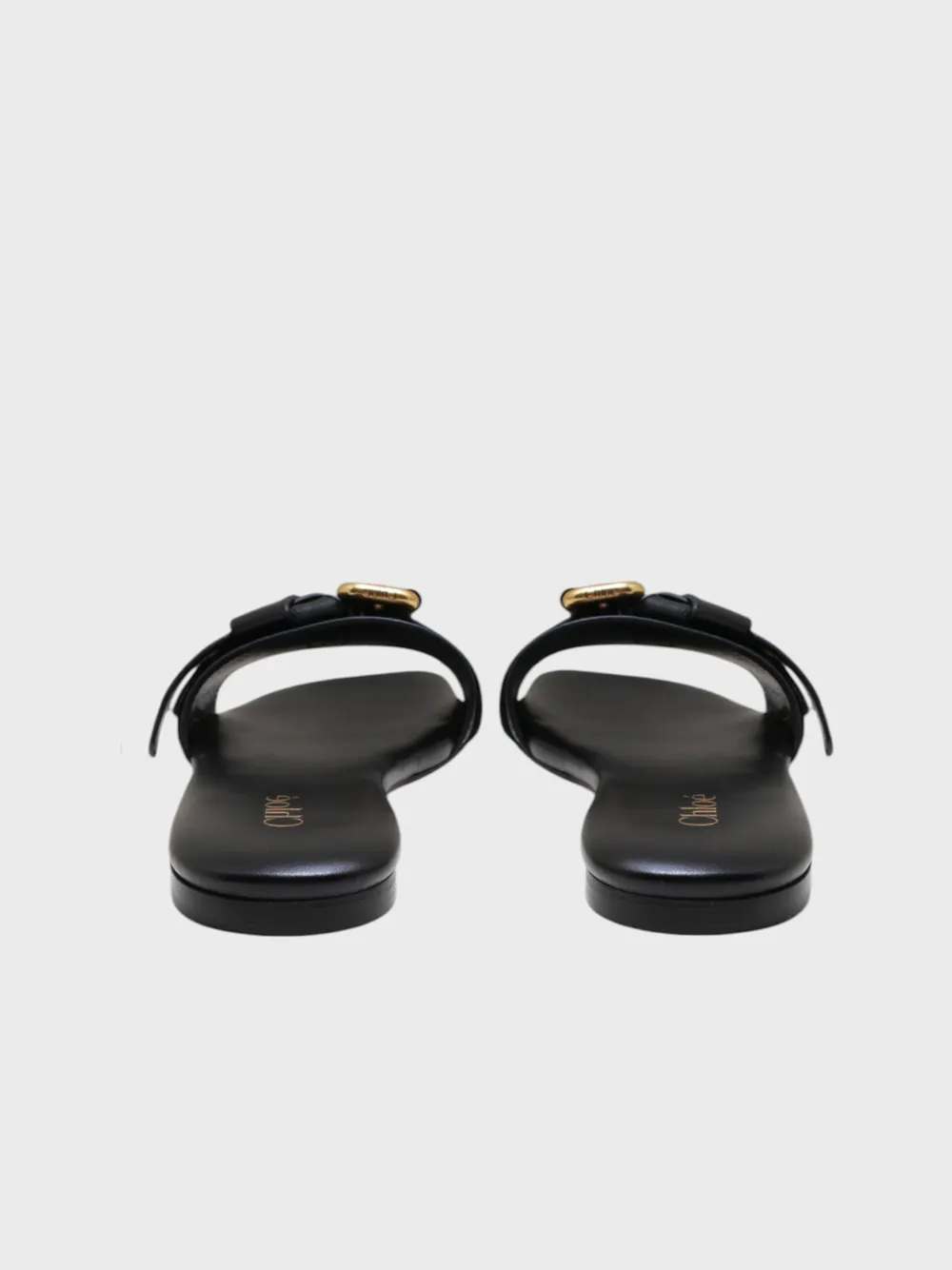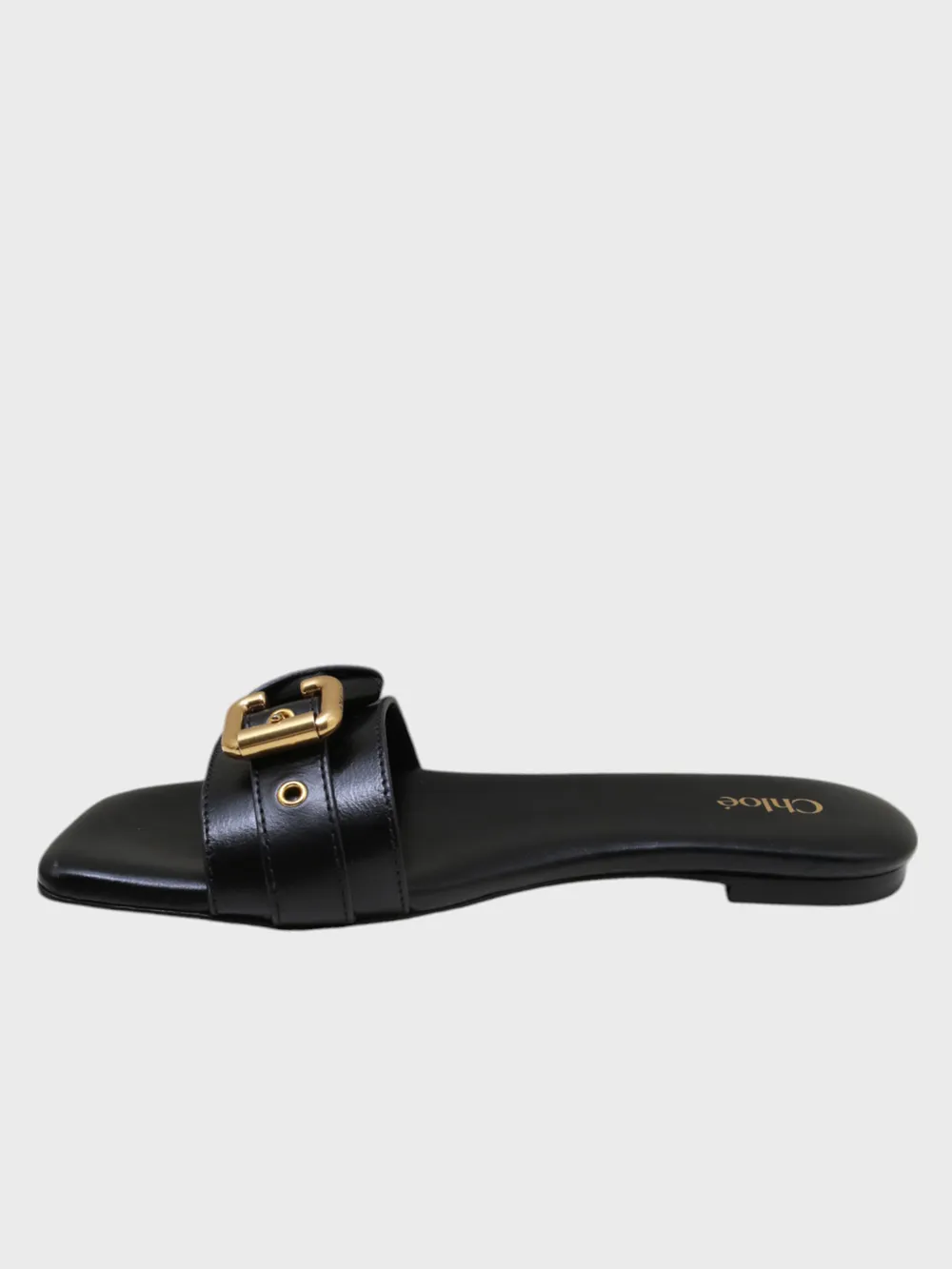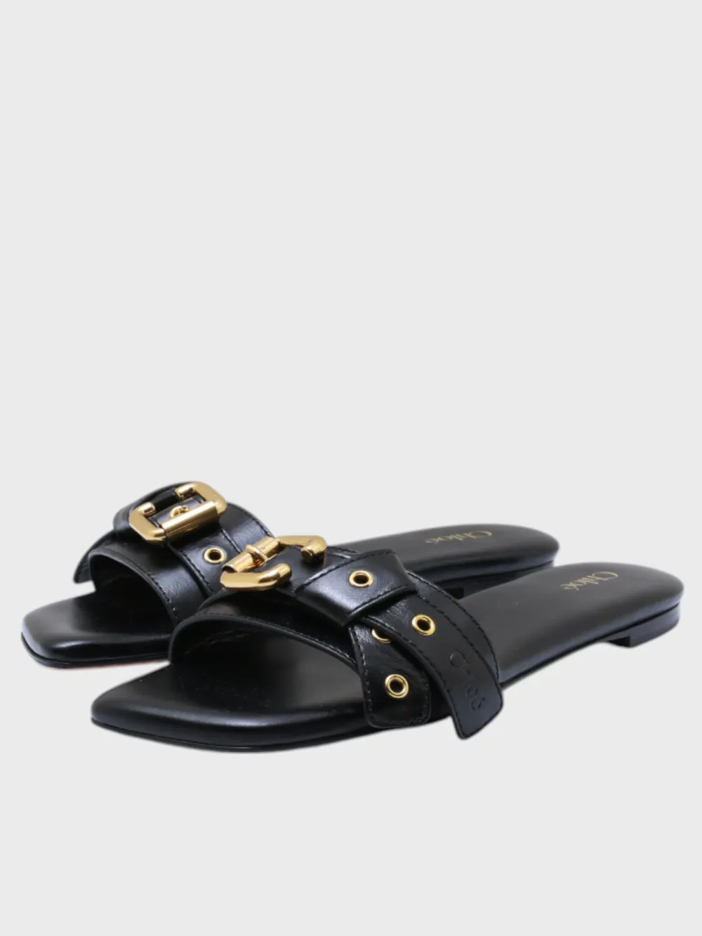Шлепанцы Chloe выполнены из качественной черной кожи с гладким матовым эффектом. Модель дополнена золотыми металлическими деталями, включая декоративные пряжки и заклепки, которые придают аксессуару современный и элегантный вид. Комфортная подошва обеспечивает легкость при ходьбе, а универсальный дизайн позволяет сочетать как с повседневной, так и с вечерней одеждой. Идеальный выбор для ценителей премиальных материалов и стильного летнего обуви.