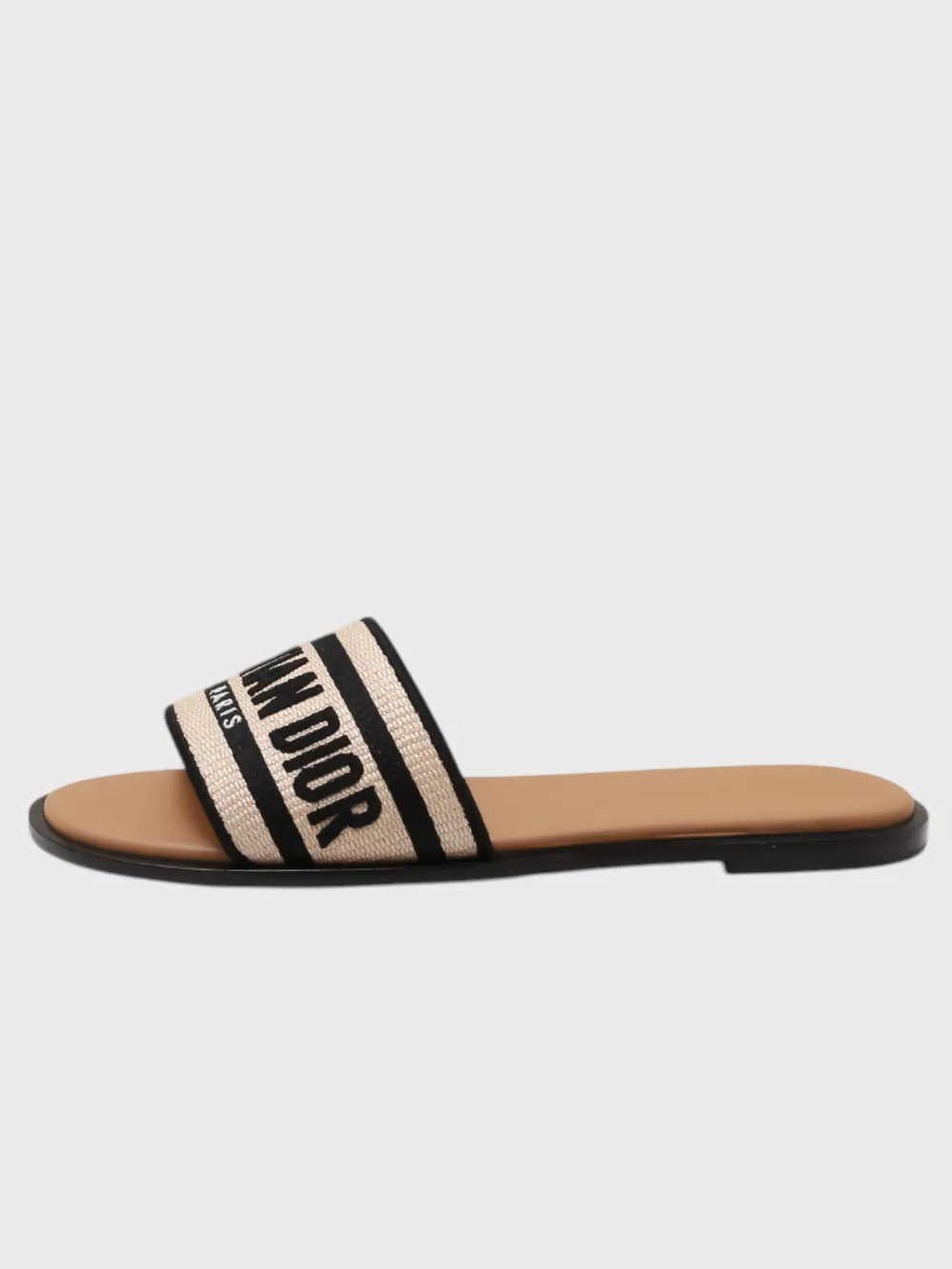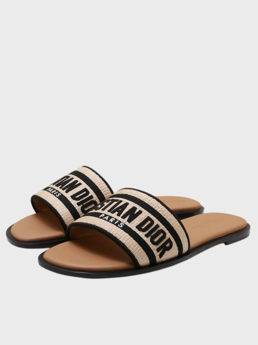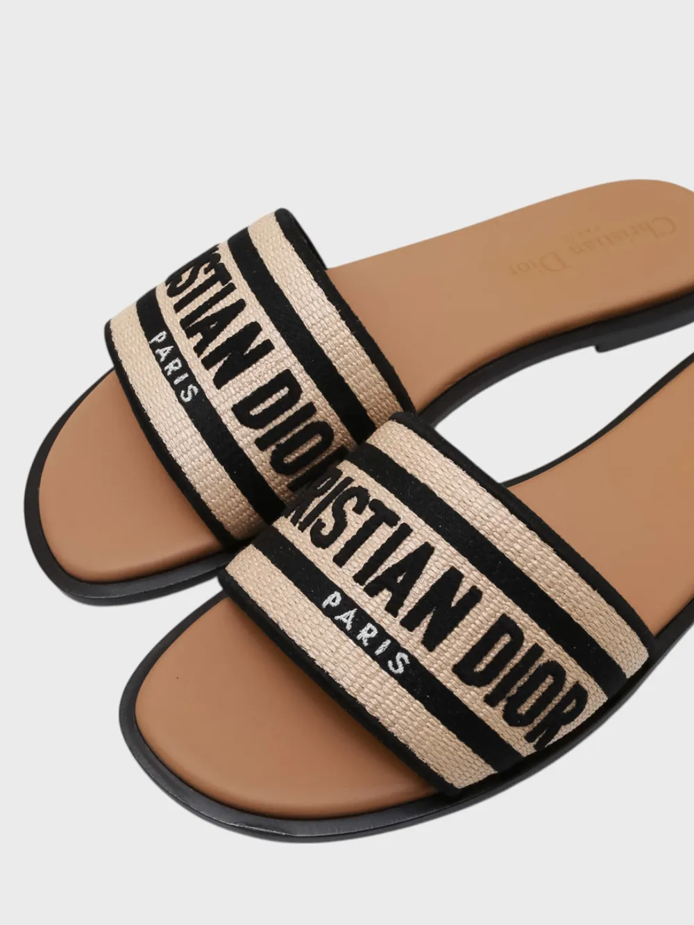 Шлепки Christian Dior выполнены из натуральной кожи нежного бежевого цвета с черной отделкой. Модель дополнена широкой лентой, украшенной крупным логотипом "CHRISTIAN DIOR PARIS", что придает изделию узнаваемость и премиальность. Комфортная подошва обеспечивает легкость и удобство в носке, а элегантный дизайн делает их идеальным выбором для летнего отдыха или повседневного использования.