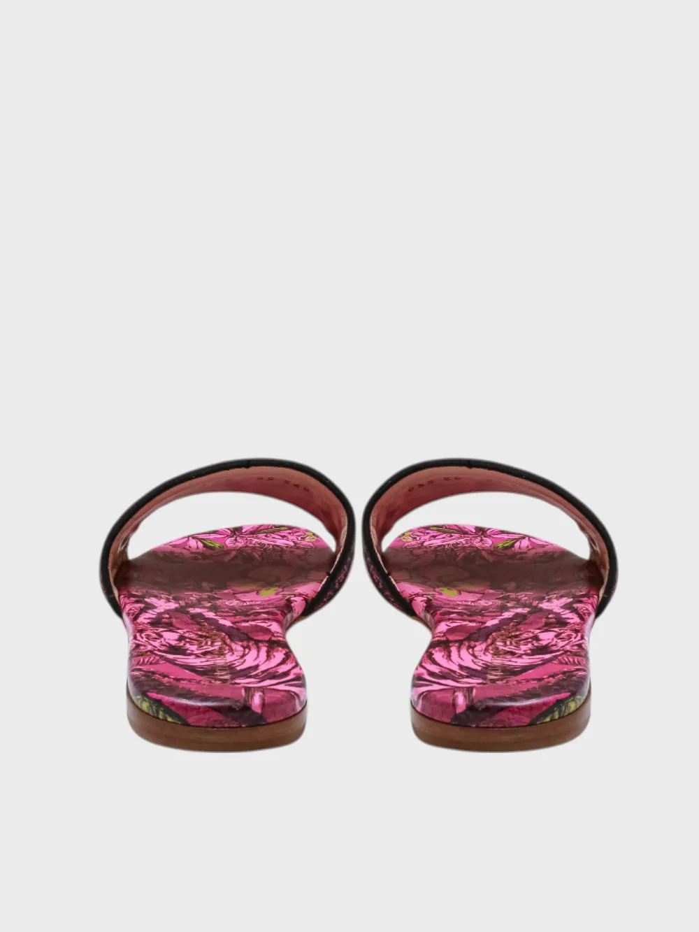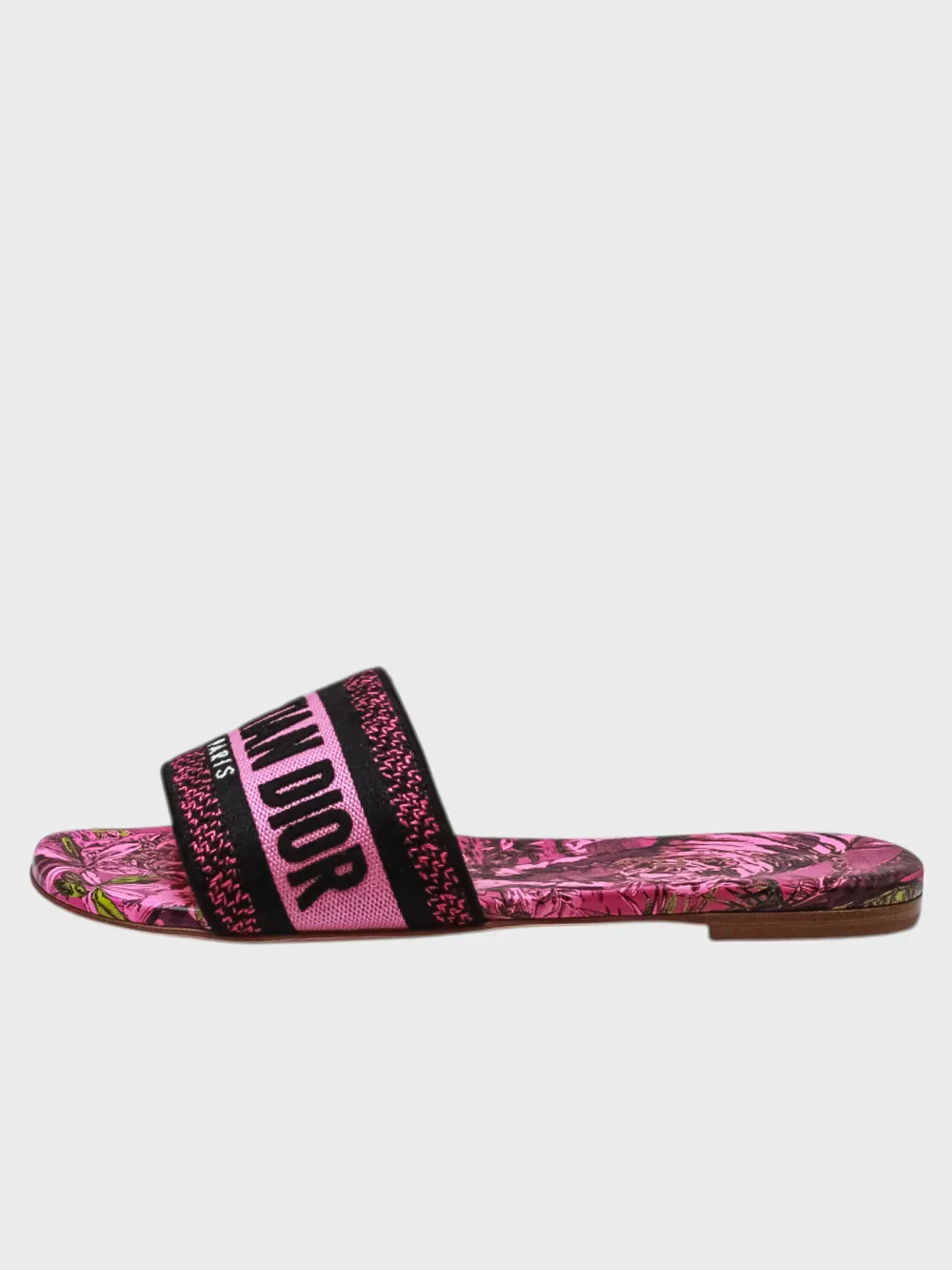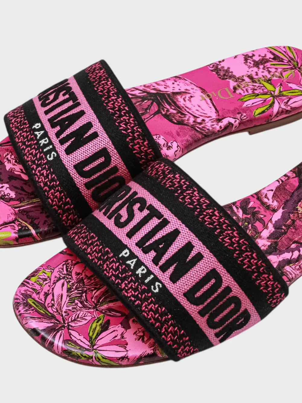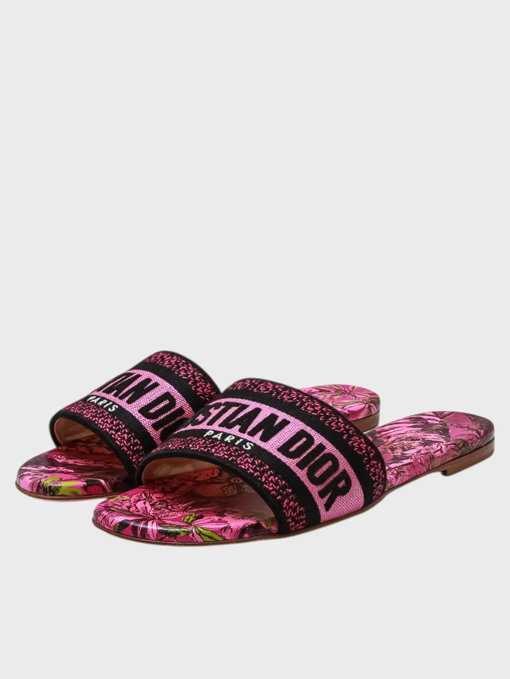 Шлепки Christian Dior выполнены из яркой ткани с роскошным цветочным принтом на фоне черного и фиолетового. Модель дополнена широкой лентой, украшенной крупным логотипом "CHRISTIAN DIOR PARIS", что придает изделию узнаваемость и премиальность. Комфортная подошва обеспечивает легкость в носке, а элегантный дизайн делает их идеальным выбором для летнего отдыха или повседневного использования. Их броский внешний вид позволяет создать современный и модный образ.
