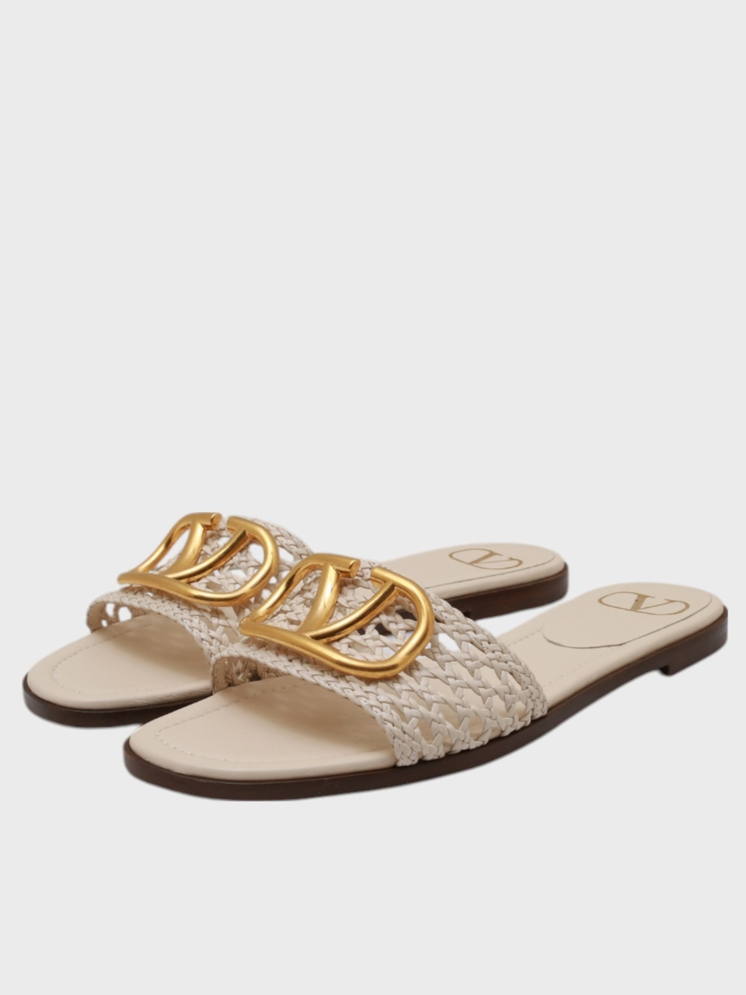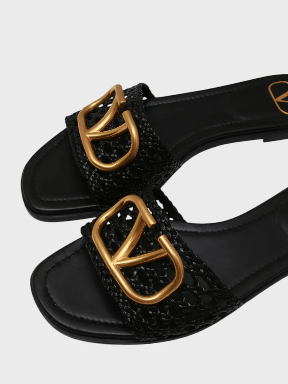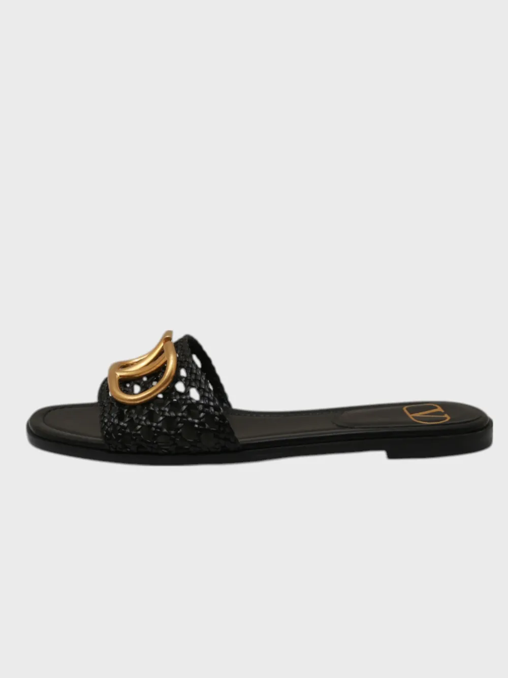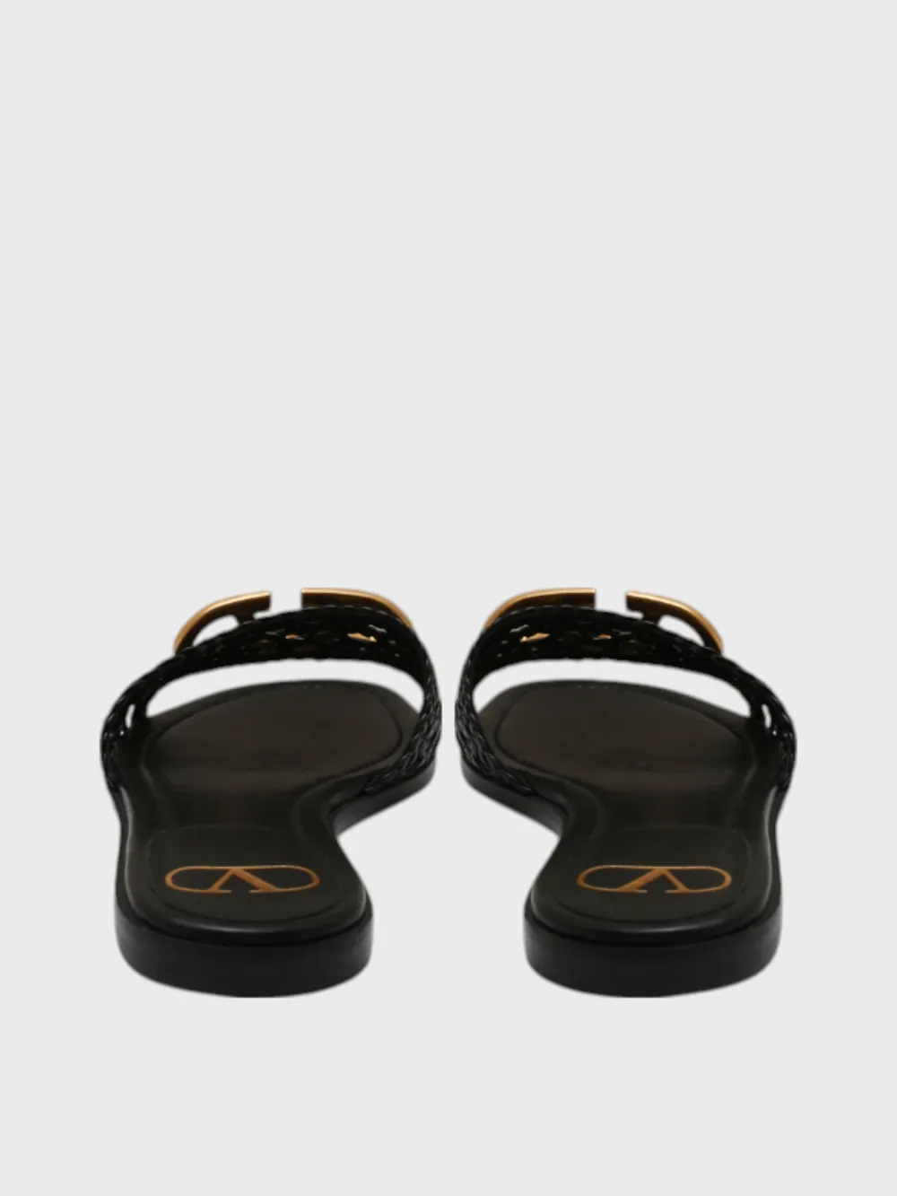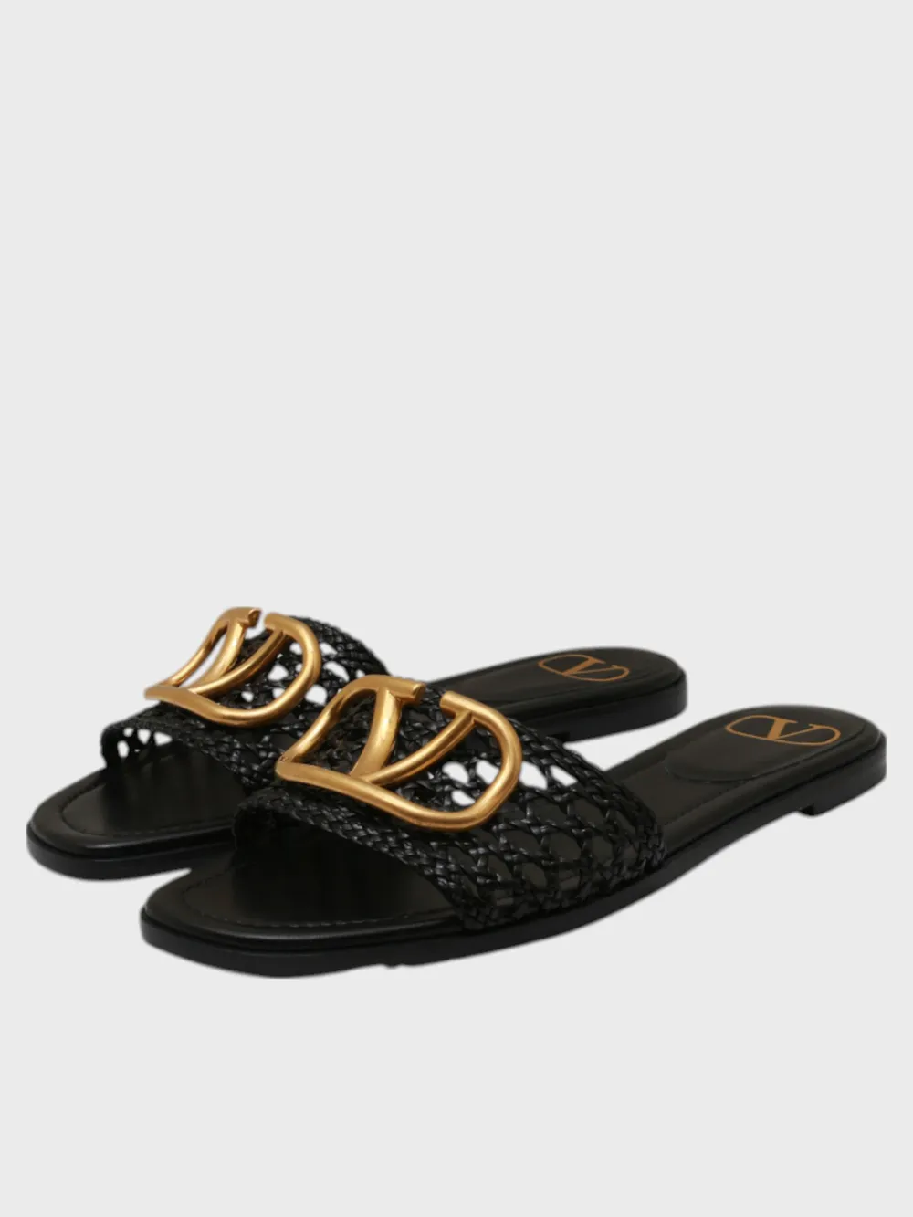 Шлепки Valentino выполнены из черной кожи с плетеной текстурой, которая придает им уникальный внешний вид. Модель дополнена золотым декоративным элементом в виде логотипа бренда, который добавляет роскоши и узнаваемости. Устойчивая подошва обеспечивает комфорт при длительной носке. Стильные и элегантные — идеальный выбор для летнего образа, сочетающий современность и классику.