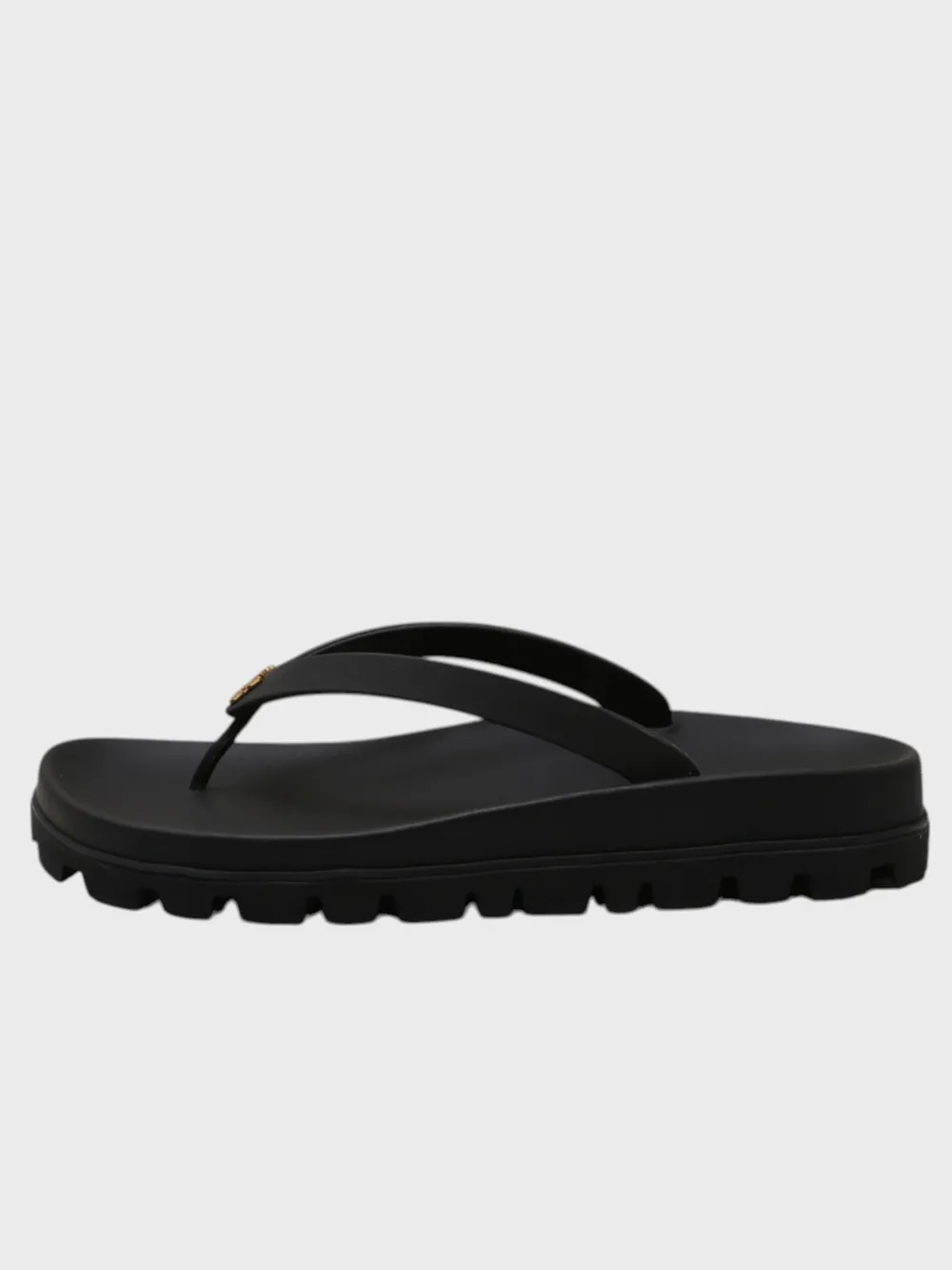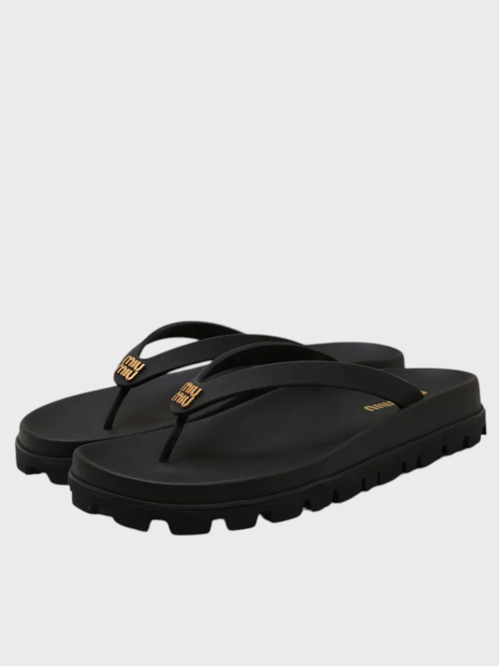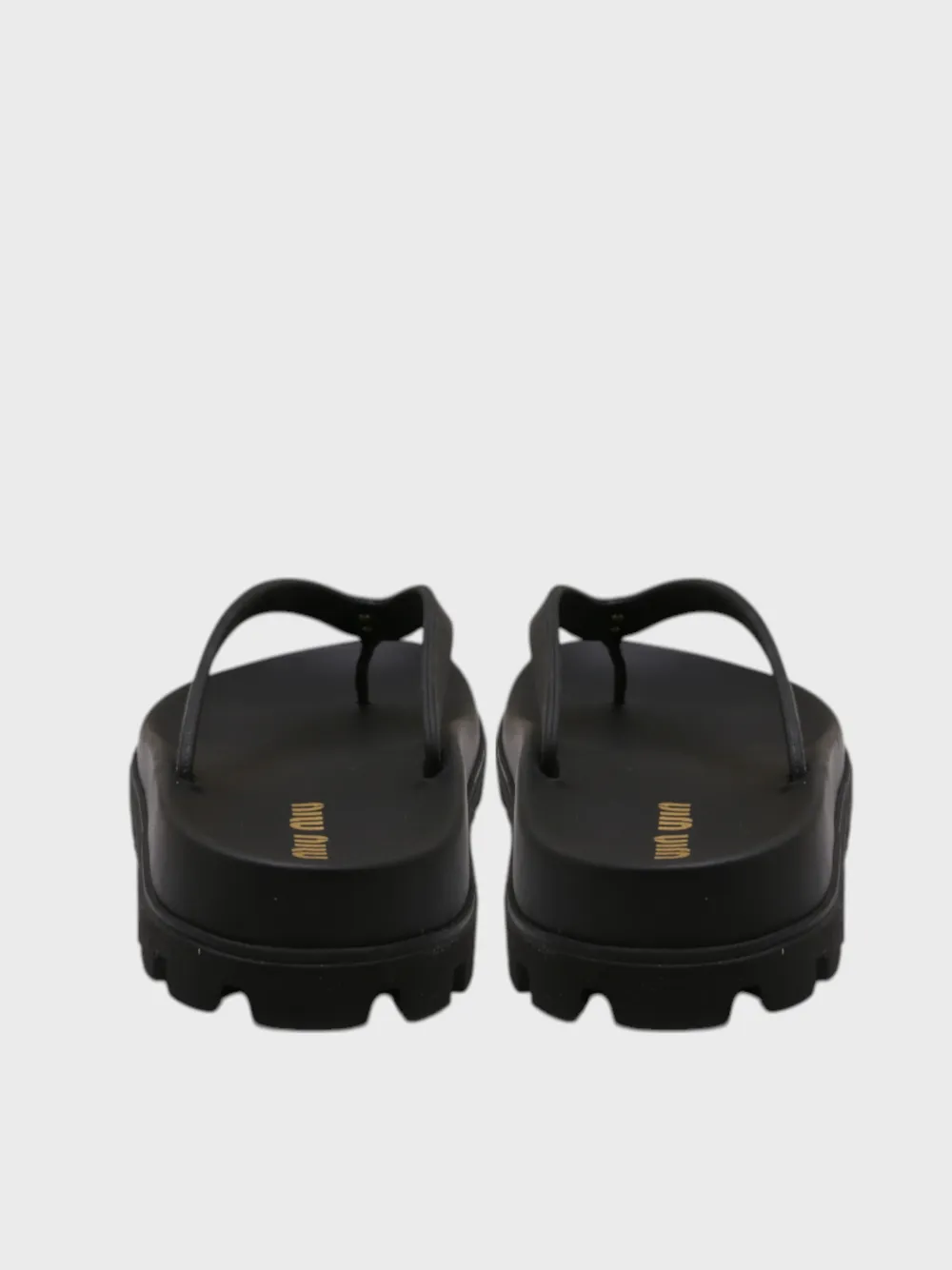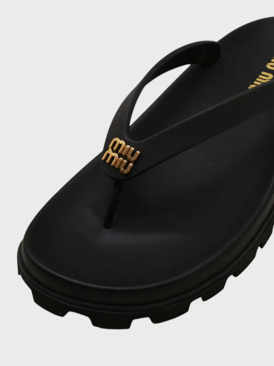 Шлепки Miu Miu выполнены из высококачественного черного резинового материала с текстурной подошвой, обеспечивающей комфорт и устойчивость. Модель дополнена золотистым логотипом бренда на ремешке, который придает обуви современный и элегантный вид. Плотная конструкция и широкий ремешок гарантируют удобство даже при длительной носке. Идеально подходят для летнего отдыха или повседневного использования.