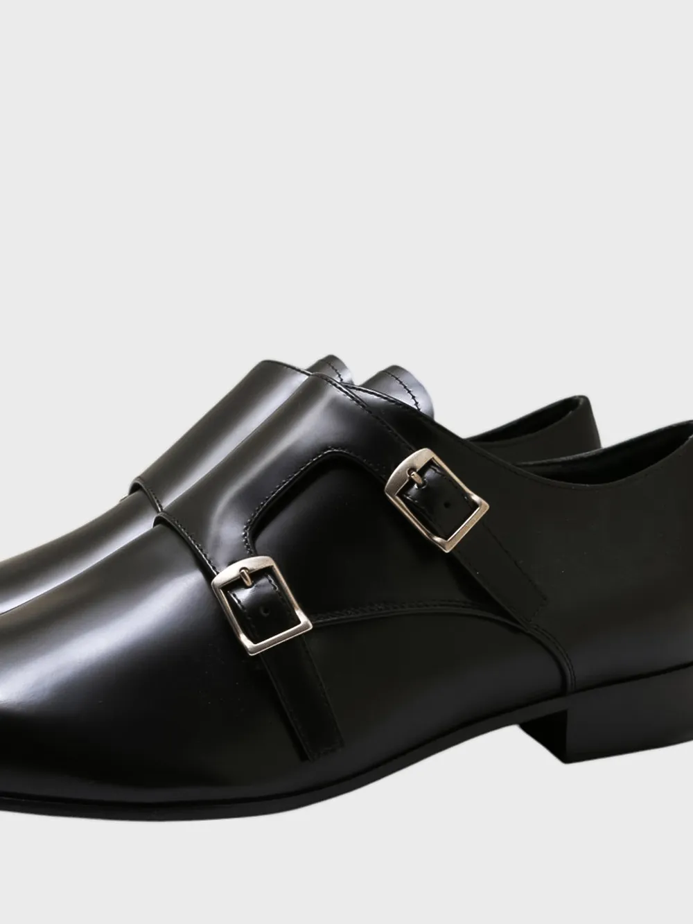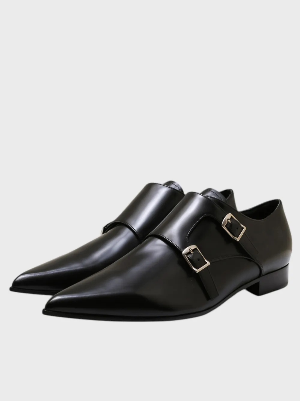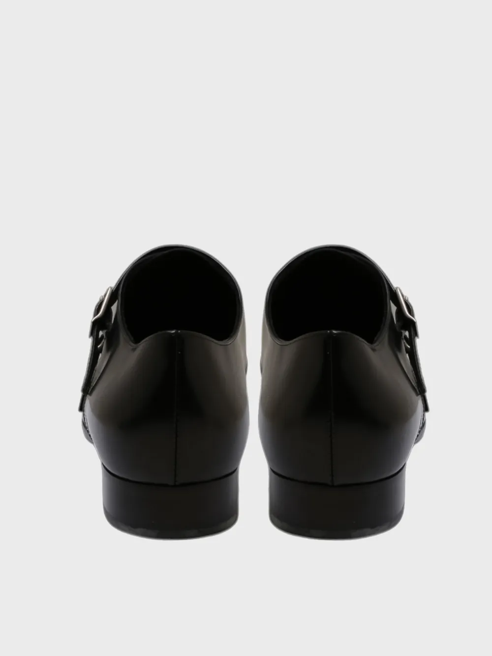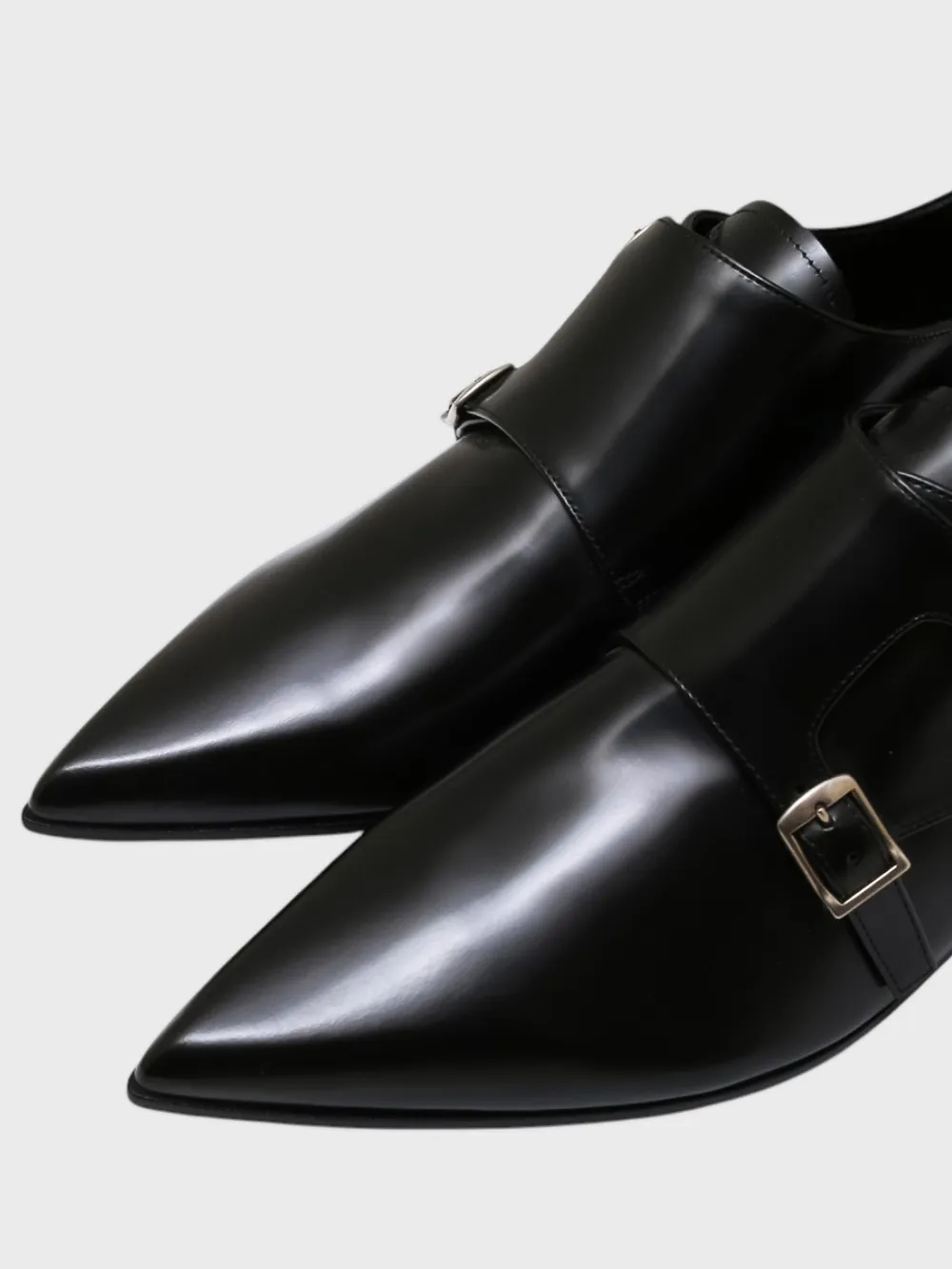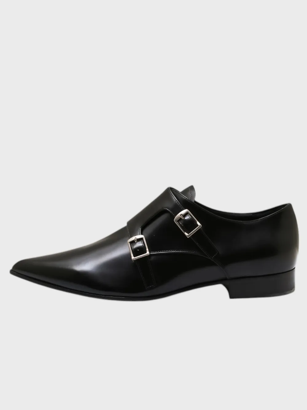 Туфли Dior выполнены из черной глянцевой кожи высшего качества с лаконичным дизайном. Модель дополнена двумя металлическими пряжками, которые придают изделию классический и элегантный вид. Точная посадка и острые носки обеспечивают комфортную посадку и делают обувь универсальной для различных форм ног. Плотная подошва гарантирует устойчивость и долговечность. Эти туфли — идеальный выбор для делового стиля или официальных мероприятий, где требуется безупречный внешний вид.