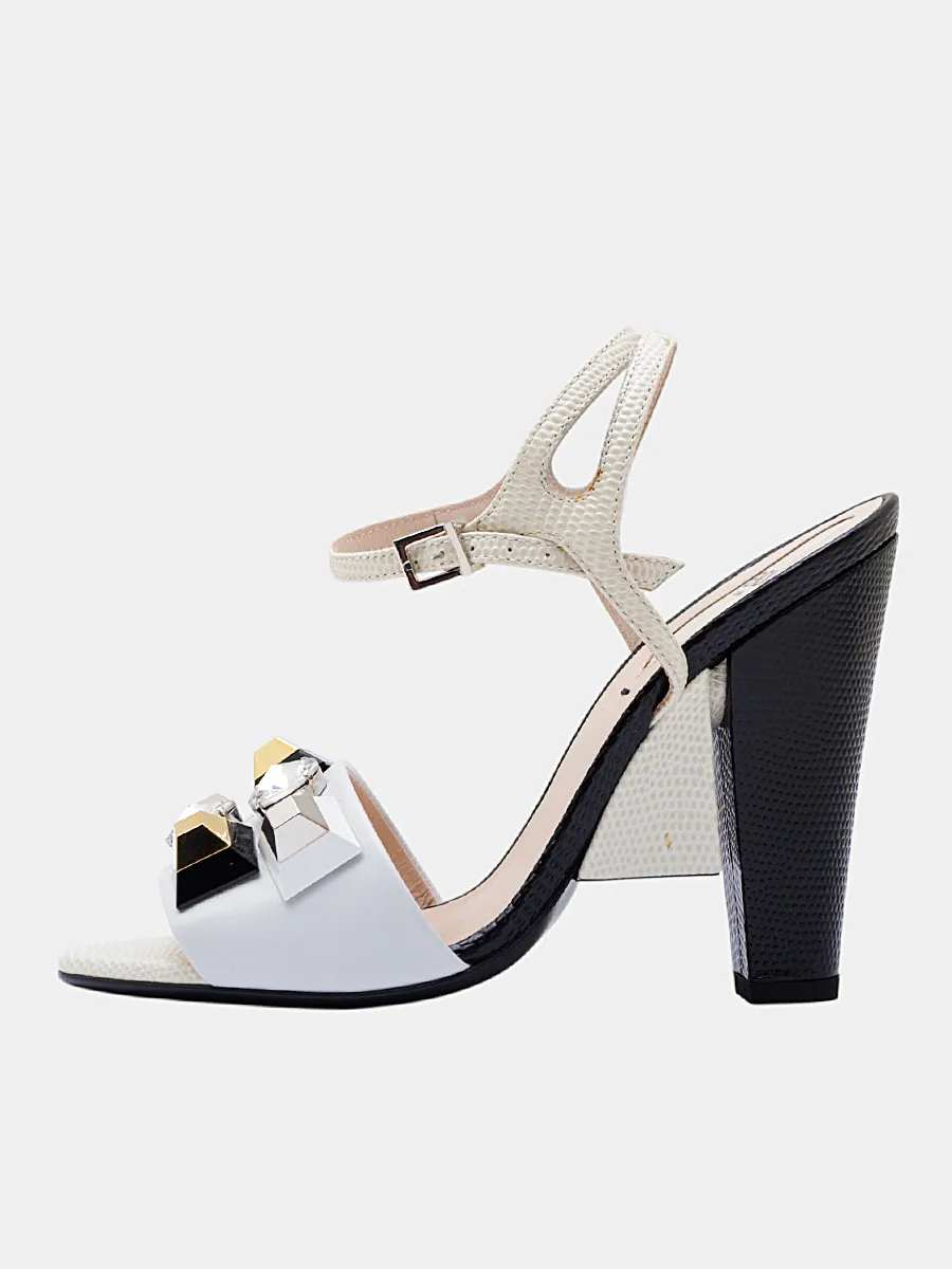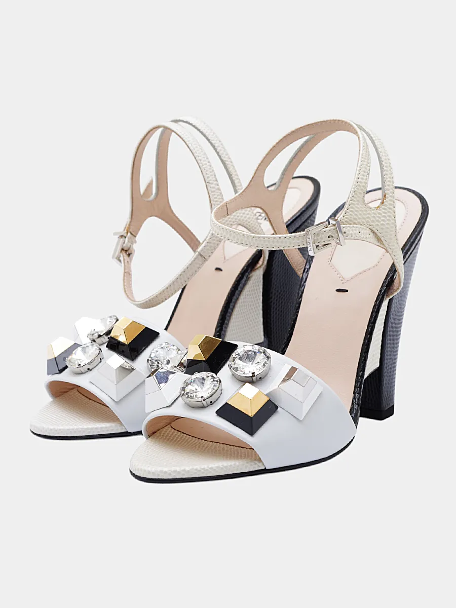 Туфли Fendi выполнены из качественной кожи белого цвета с черными вставками и декорированы крупным геометрическим элементом, инкрустированным кристаллами. Модель дополнена ремешком на щиколотке, застежкой-пряжкой и устойчивым квадратным каблуком средней высоты. Современный дизайн и роскошные детали делают эти туфли идеальным выбором для вечернего или делового образа.