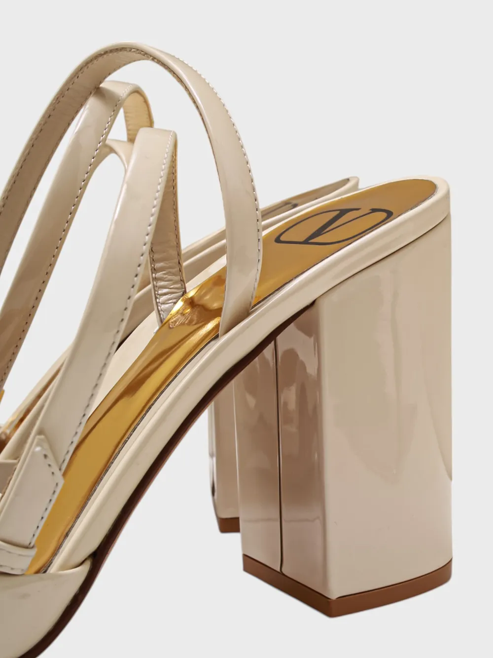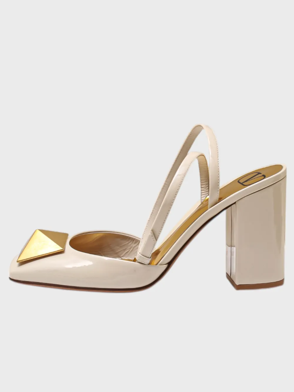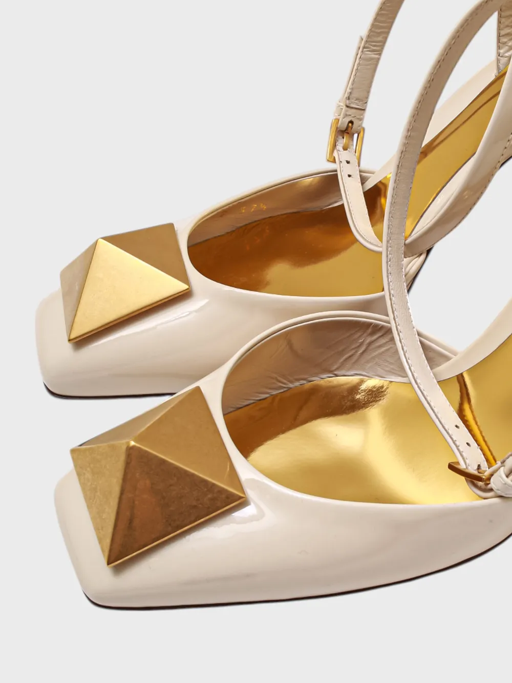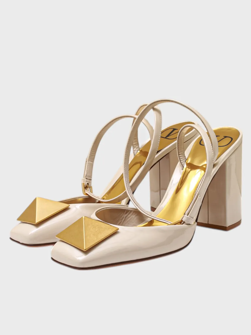 Туфли Valentino выполнены из белой лакированной кожи с глянцевой фактурой. Модель дополнена массивным квадратным каблуком и декоративными золотыми деталями в виде пирамидок на носке, которые создают эффектный акцент. Подошва и внутренняя часть выполнены из мягкой коричневой кожи для максимального комфорта. Туфли имеют ремешок на щиколотке с золотой пряжкой, обеспечивающий надежную фиксацию. Стильные и женственные, эти туфли станут идеальным выбором для вечерних мероприятий или выходных в городе.