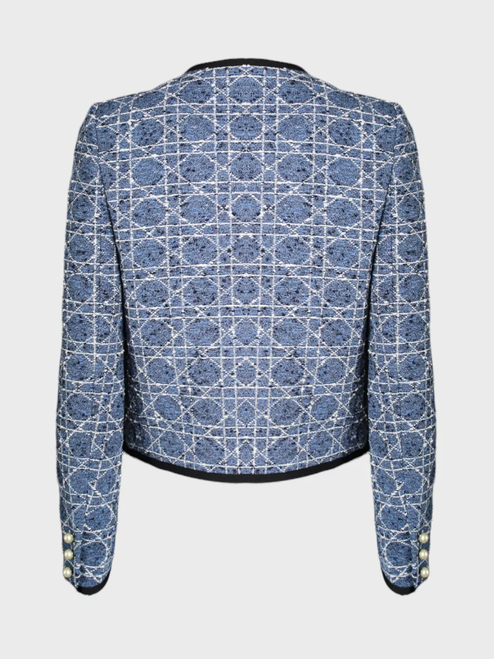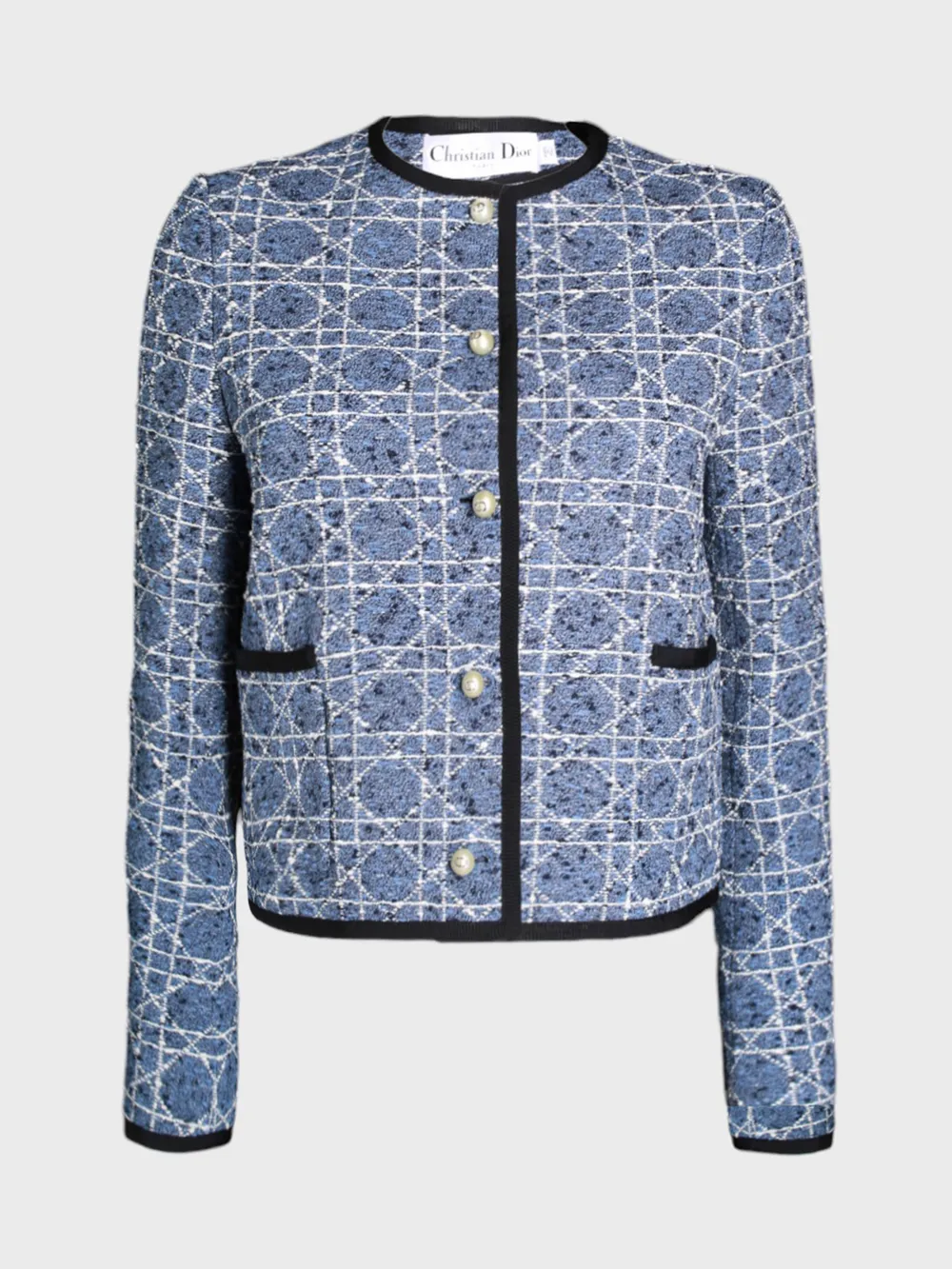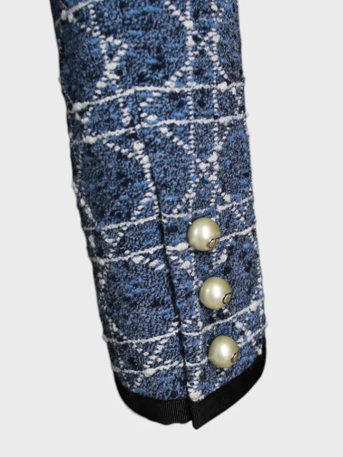 Пиджак Christian Dior выполнен из ткани с абстрактным геометрическим узором в сине-белых тонах. Модель имеет прямой крой, круглый вырез и застежку на три жемчужные пуговицы. Детали, такие как черная отделка по низу рукавов и спинки, добавляют акценты и контраст. Кардиган сочетает современный дизайн с классическим стилем, идеально подходя для повседневной носки или деловых встреч.