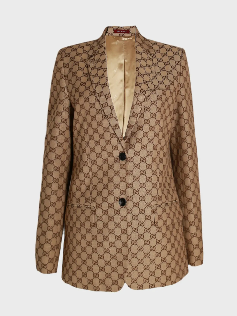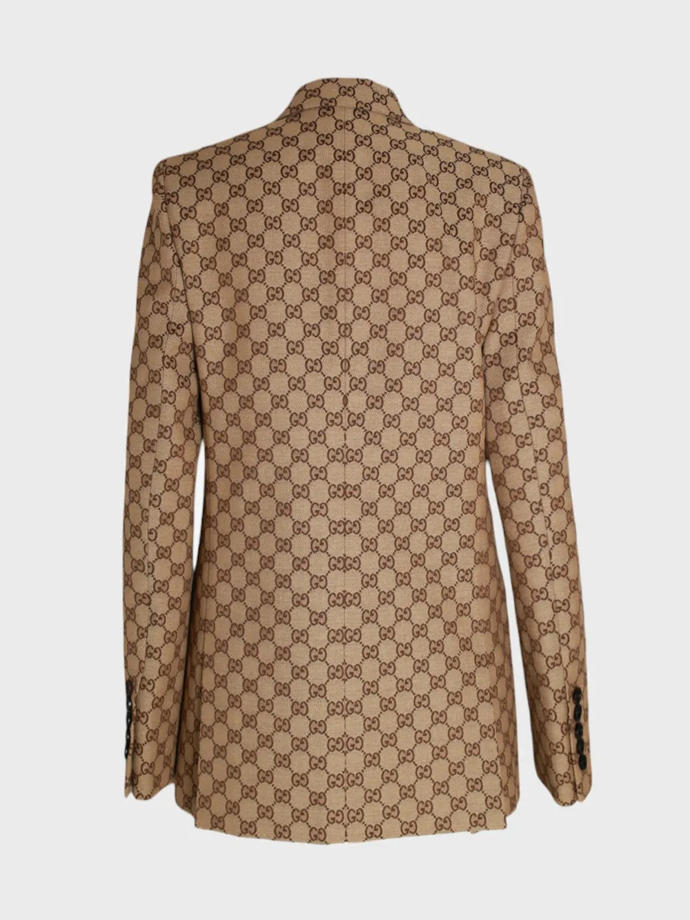 Пиджак Gucci выполнен из ткани с характерным монограммным принтом в коричневых тонах. Модель имеет классический крой с длинными рукавами и застежкой на пуговицы спереди. Пиджак дополнен двумя накладными карманами, которые добавляют функциональности и структуру дизайну. Воротник-стойка и контрастная подкладка создают акценты, подчеркивающие качество исполнения. Этот пиджак сочетает элегантность с узнаваемым брендовым стилем Gucci, идеально подходящий для деловых встреч или вечерних мероприятий.