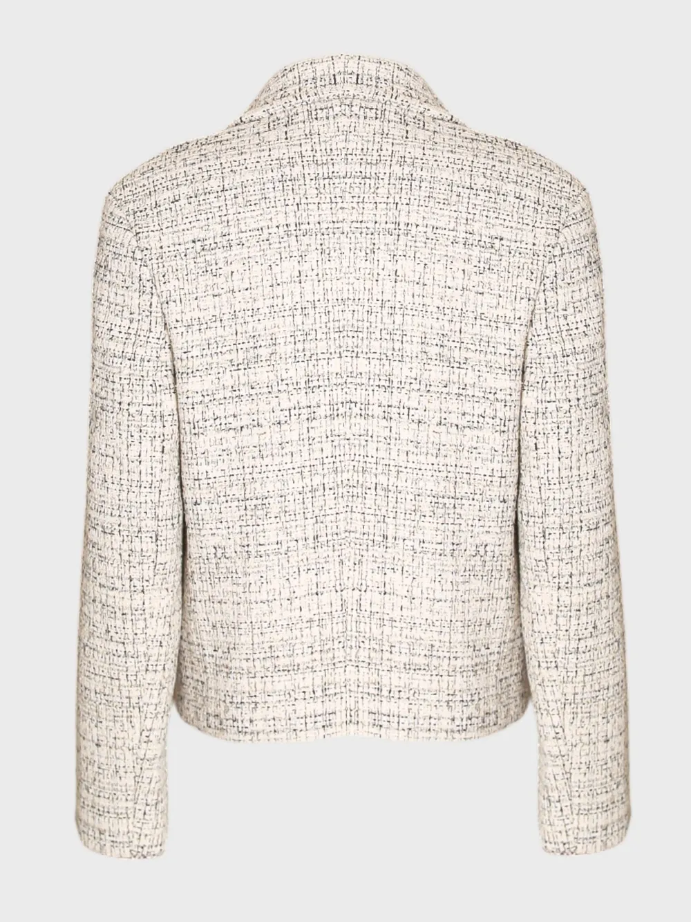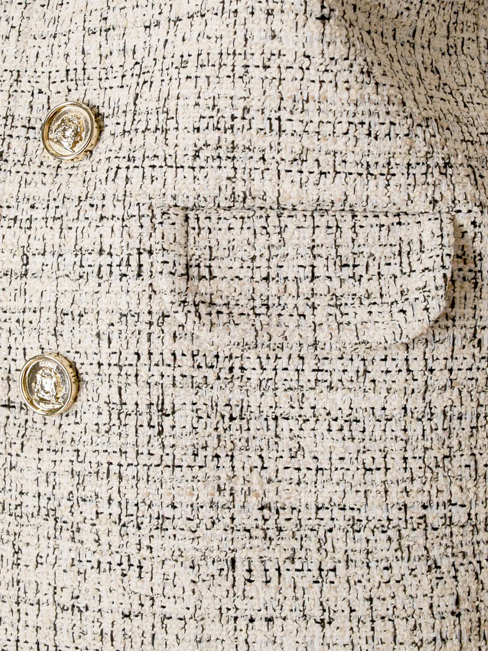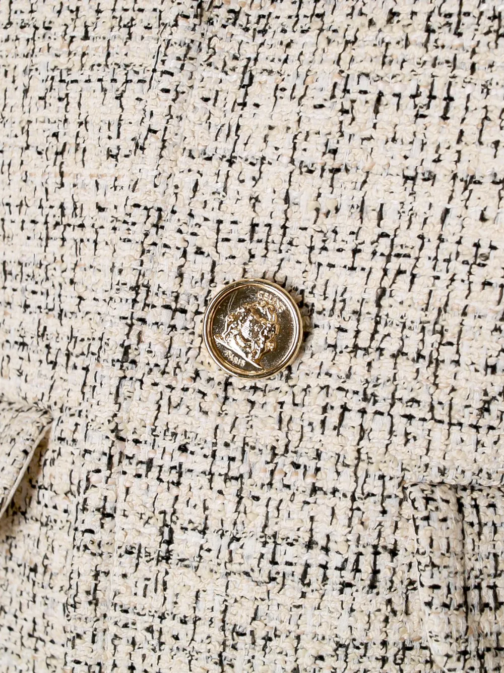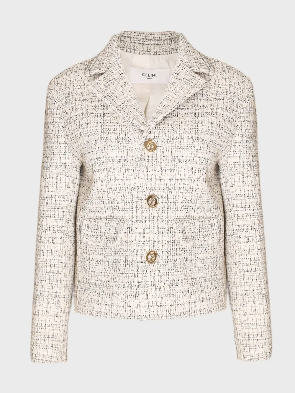 Жакет Celine выполнен из качественного твида с текстурным узором в светло-бежевых тонах. Модель дополнена двумя крупными кнопками на передней части и классическим отложным воротником. Простой силуэт и акцент на качество материалов делают этот жакет универсальным элементом гардероба для различных мероприятий, особенно подходящим для делового или официального стиля.