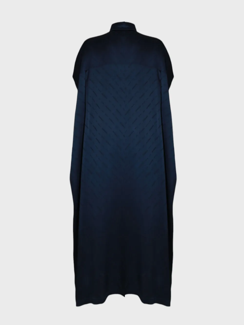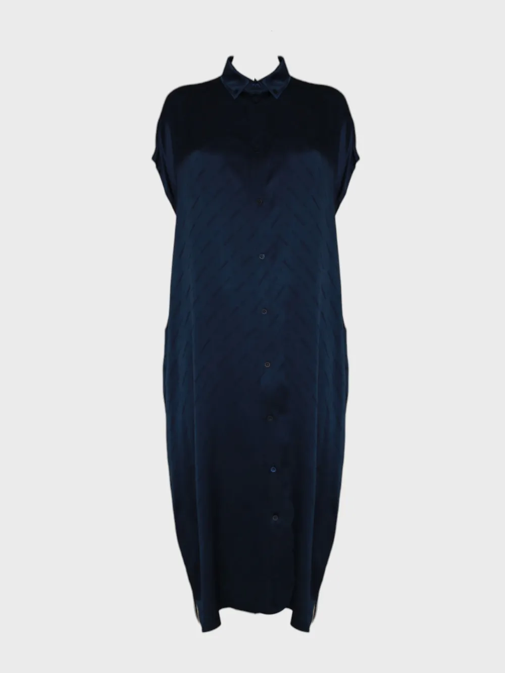Платье Balenciaga выполнено из качественного темно-синего материала с безрукавным кроем и классическим воротником. Модель дополнена декоративными элементами в виде крупных пуговиц и повторяющегося логотипа бренда, что добавляет элегантности и узнаваемости. Простой дизайн и комфортная посадка делают платье идеальным выбором для повседневной носки или как базовый элемент в гардеробе.