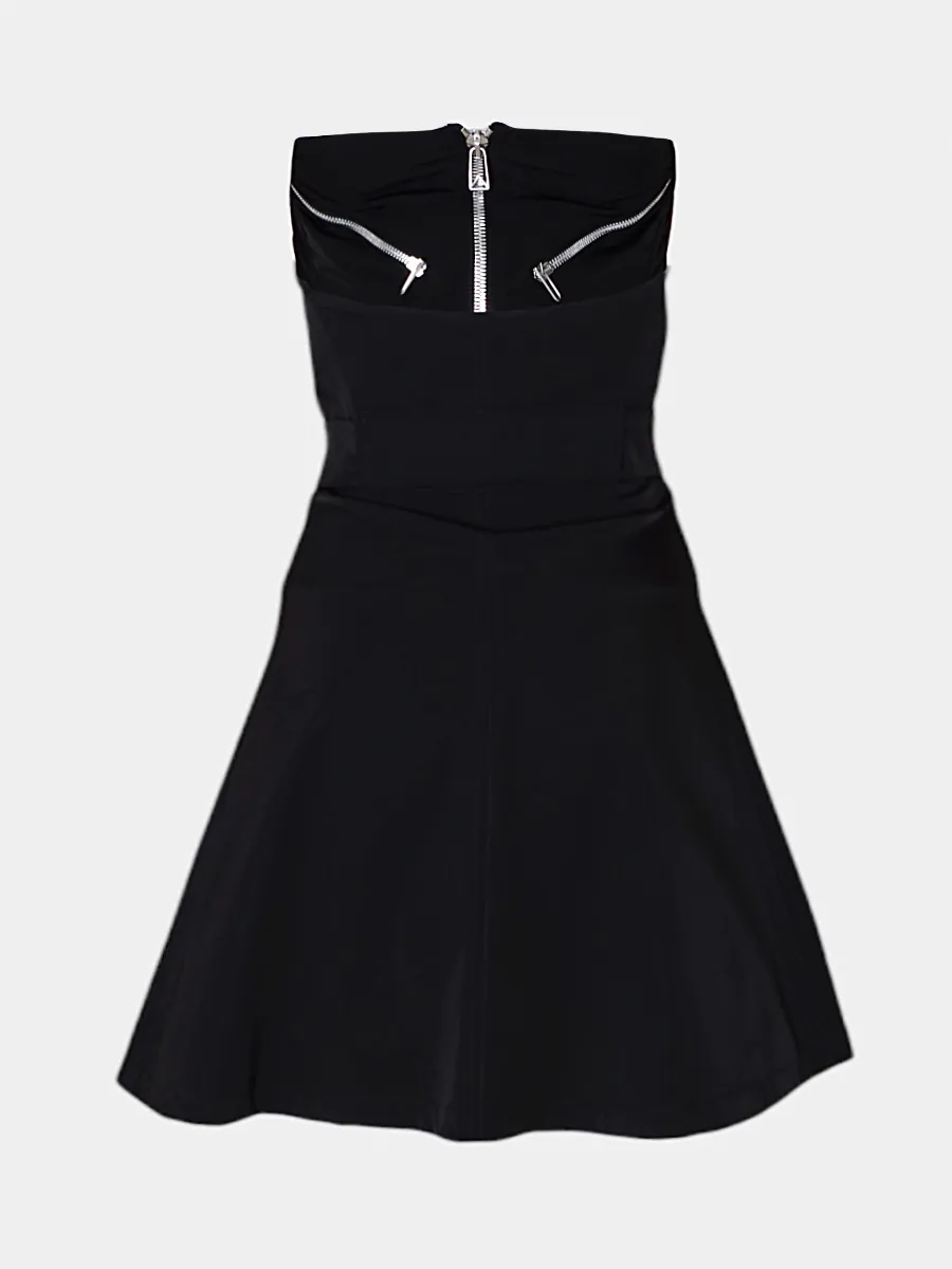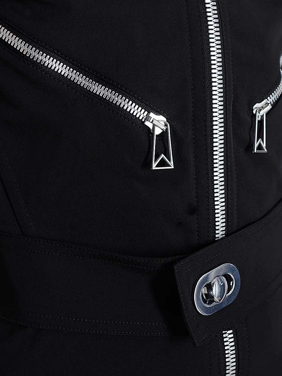 Платье Bottega Veneta выполнено из плотной ткани чёрного цвета с асимметричным кроем и декоративными молниями: центральная застёжка, два боковых кармана на молнии и металлическая фурнитура подчёркивают технологичный стиль; расклешённая юбка и пояс с фирменным элементом создают динамичный силуэт — смелый выбор для вечернего образа.
