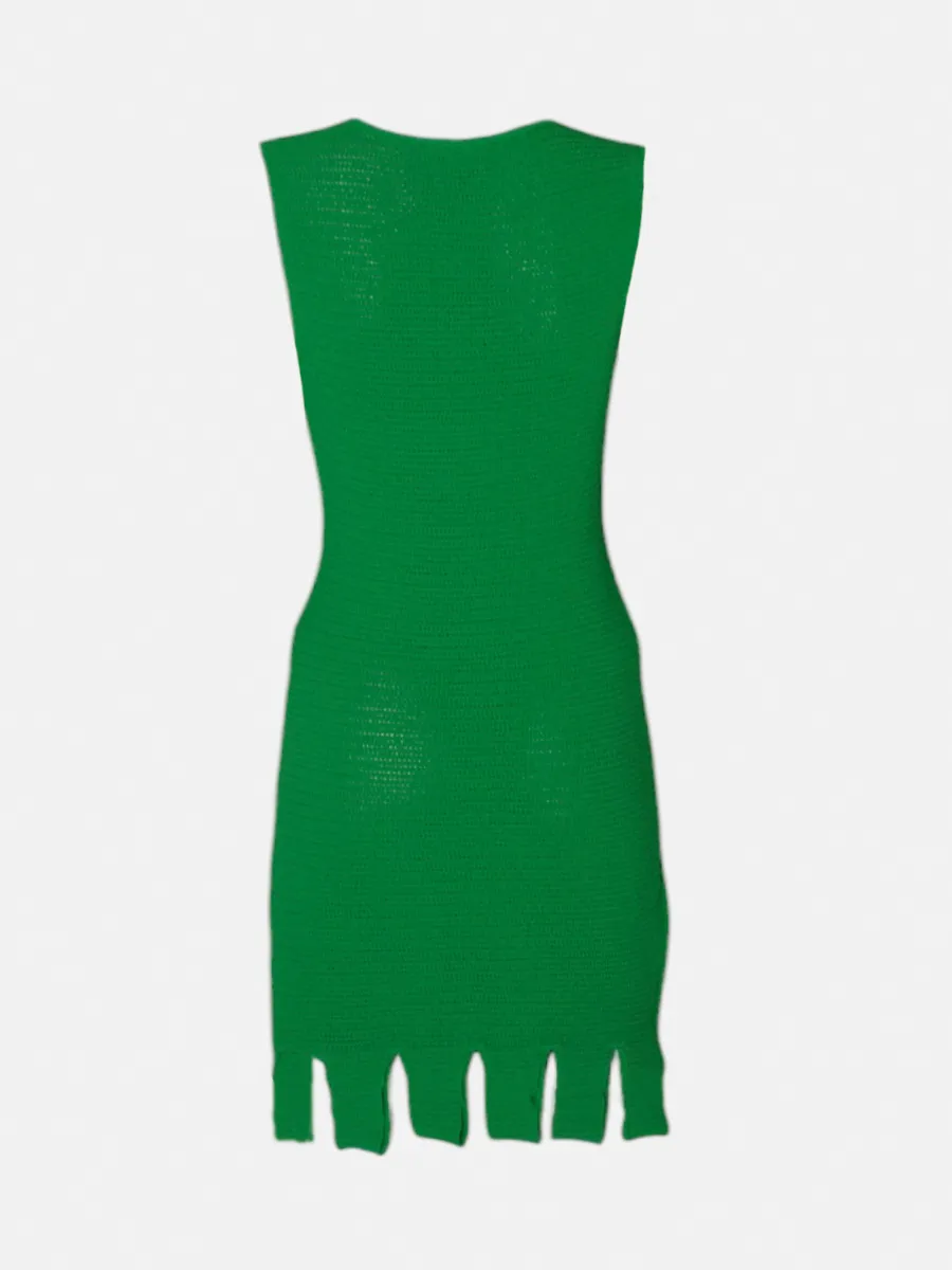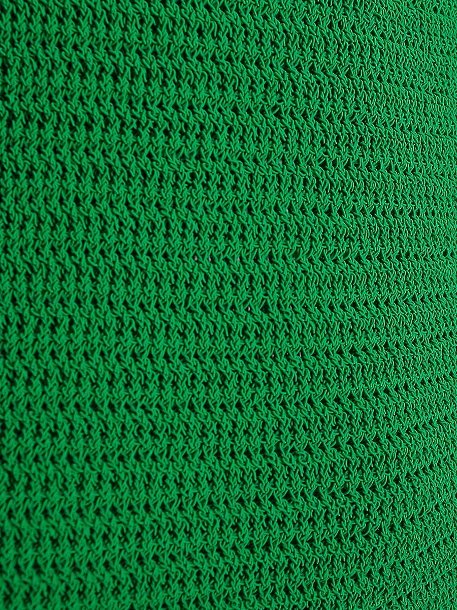 Платье Bottega Veneta выполнено из плотного фактурного трикотажа насыщенного зелёного цвета с характерной перфорацией и асимметричным кроем. Модель без рукавов с округлым вырезом и декоративными разрезами по низу сочетает минимализм и современный дизайн — идеальный выбор для смелых и элегантных образов в духе итальянской роскоши.