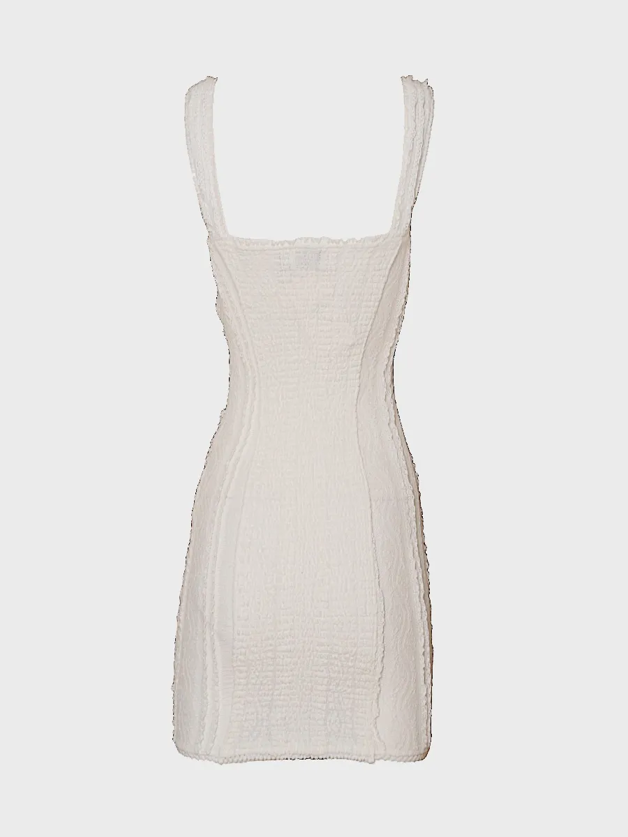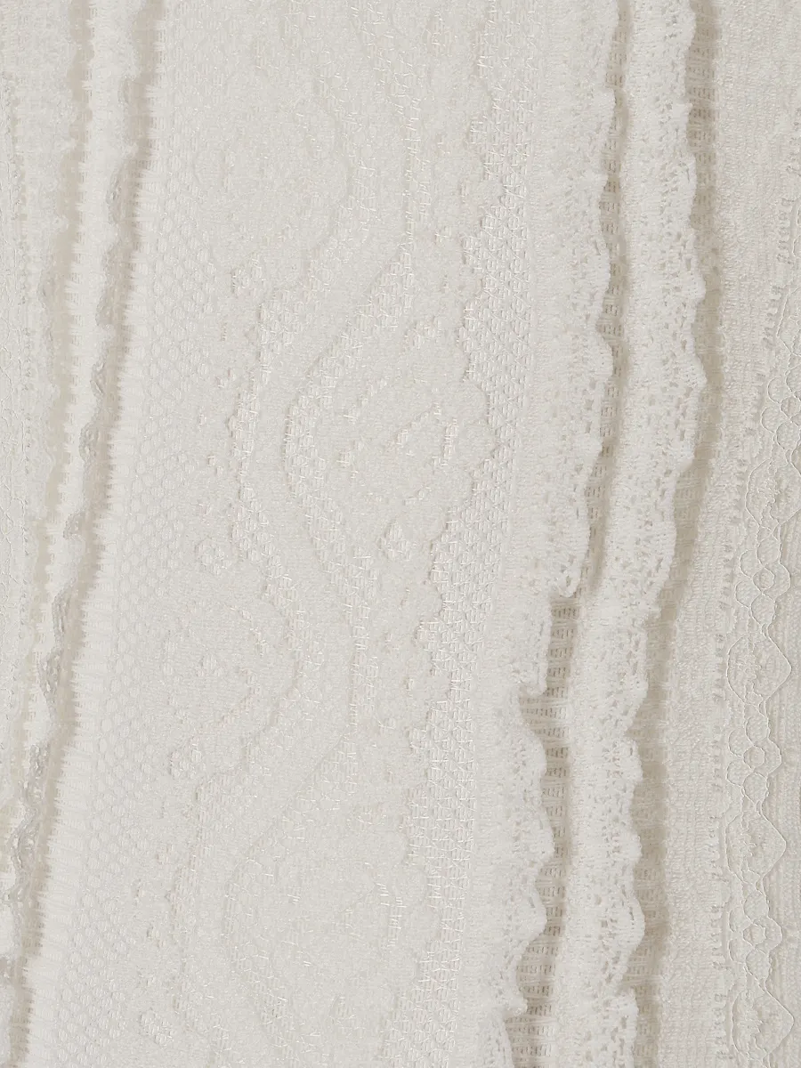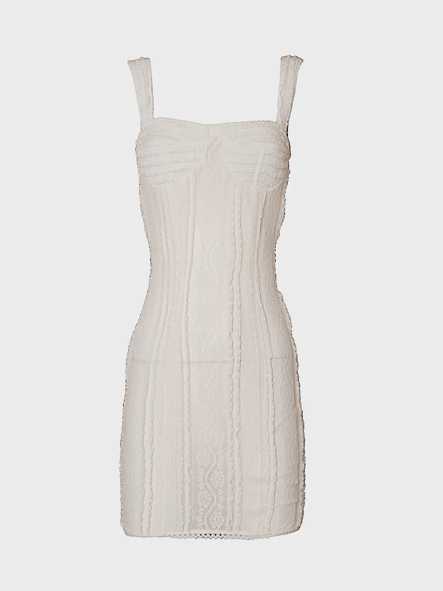 Платье Charo Ruiz выполнено из белого кружевного трикотажа с рельефным узором, созданным методом перфорации. Модель сочетает безрукавный крой и образный вырез, декорированный тонкой отделкой. Структура платья подчеркивает фигуру, а легкая фактура материала придает изделию комфорт и нежность. Идеально для вечерних мероприятий или выходных в стиле casual-chic.