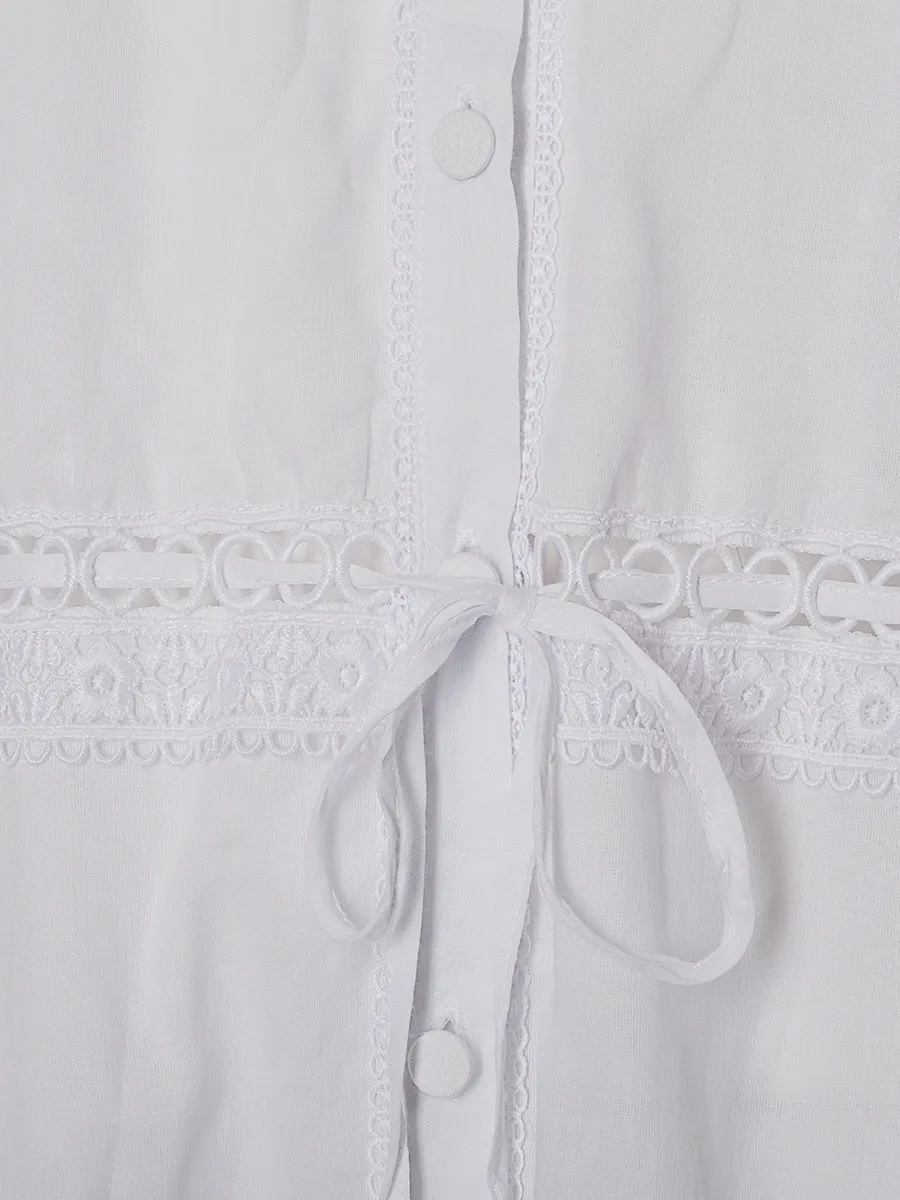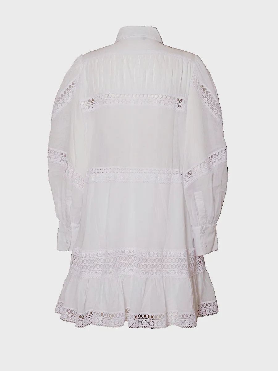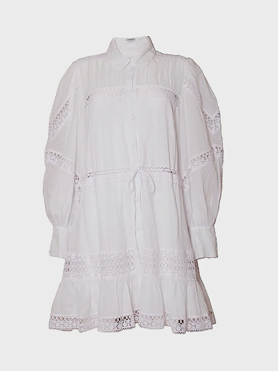 Платье Charo Ruiz выполнено из белого фактурного материала с роскошным кружевным узором, включающим геометрические элементы и точечные детали. Модель прямого кроя дополнена длинными рукавами-фонариками и пышной юбкой, что создает романтичный и элегантный образ. Контраст между плотной тканью и воздушным кружевом придает платью нежность и изысканность. Дизайн идеально подходит для повседневного или особенного случая.