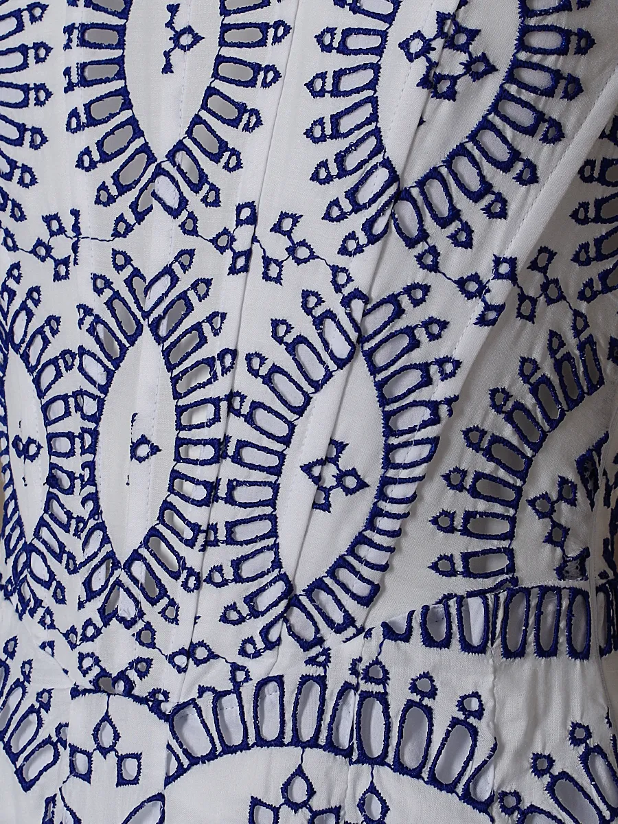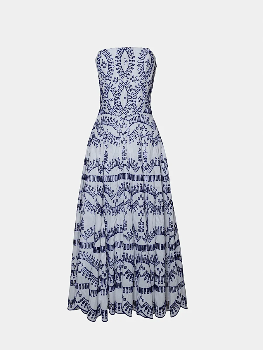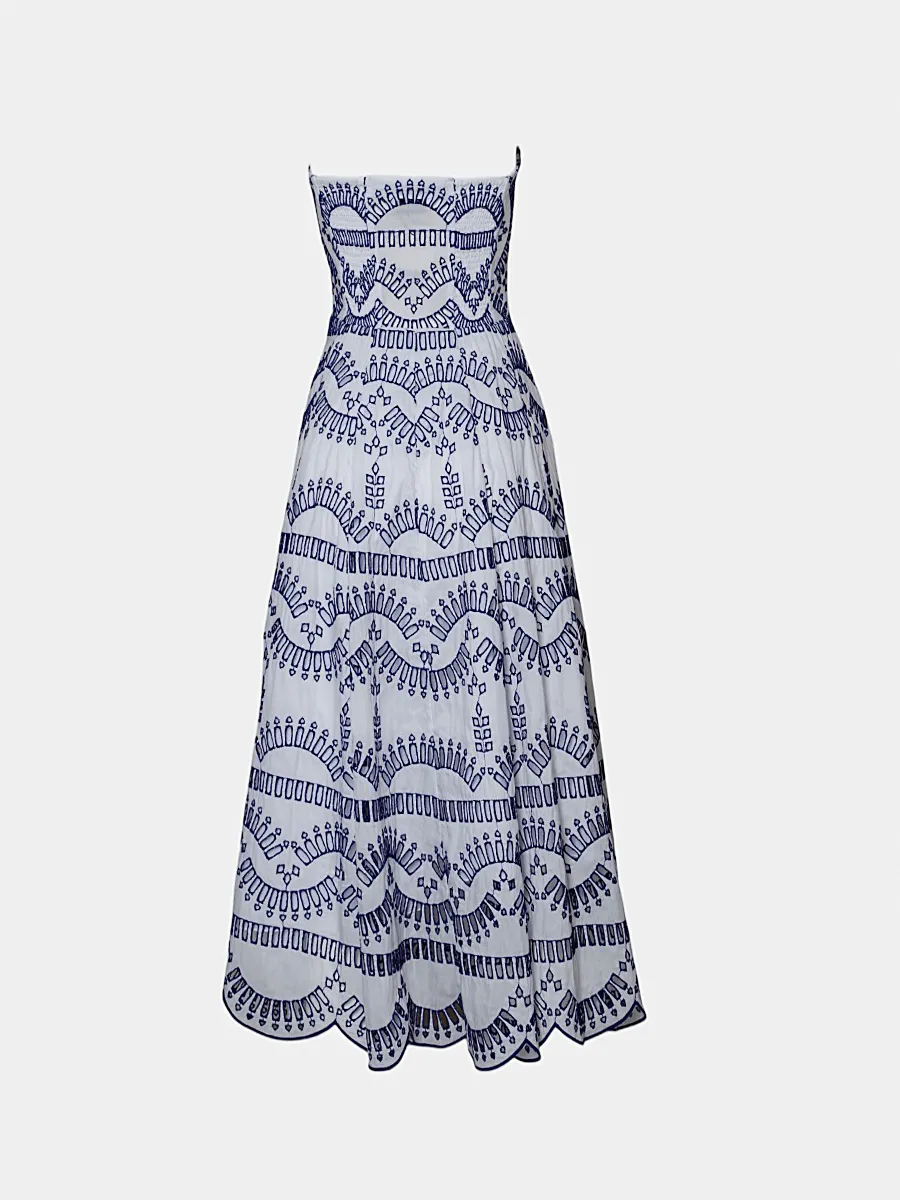 Платье Charo Ruiz выполнено из белого трикотажа с ярким этническим принтом в синих тонах. Модель сочетает безрукавный крой и образный вырез, декорированный резным узором. Свободный силуэт дополнен многослойной юбкой с плавными складками, которая создает воздушность и легкость образа. Идеально для летних мероприятий или отдыха на природе.