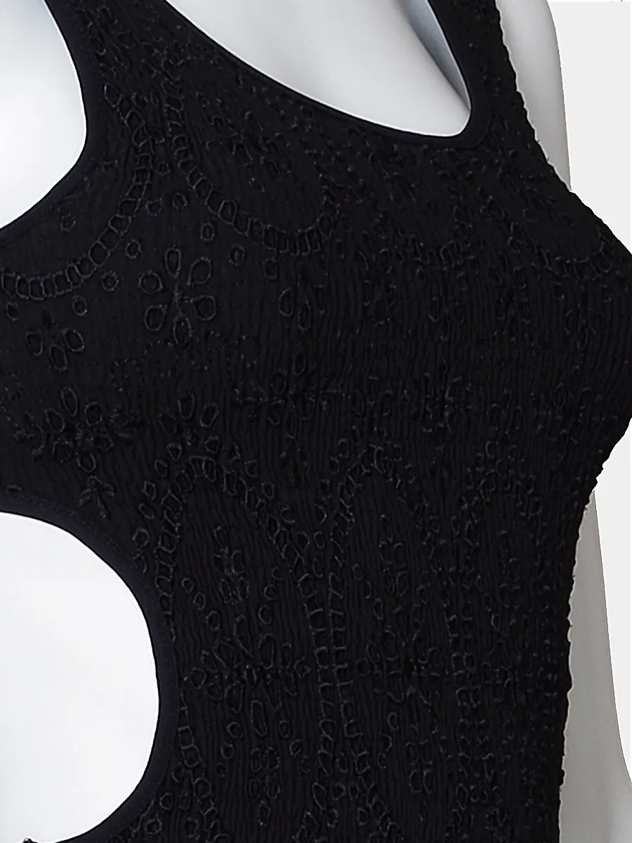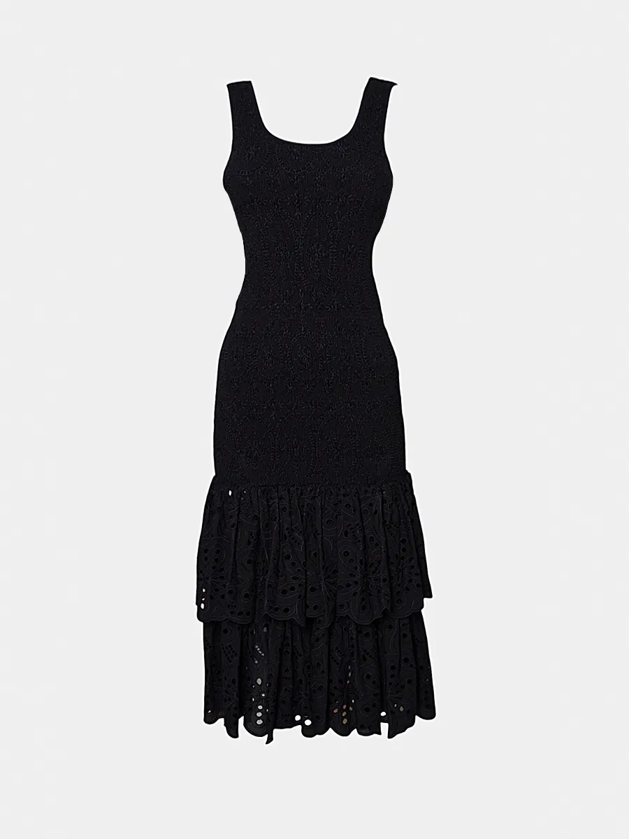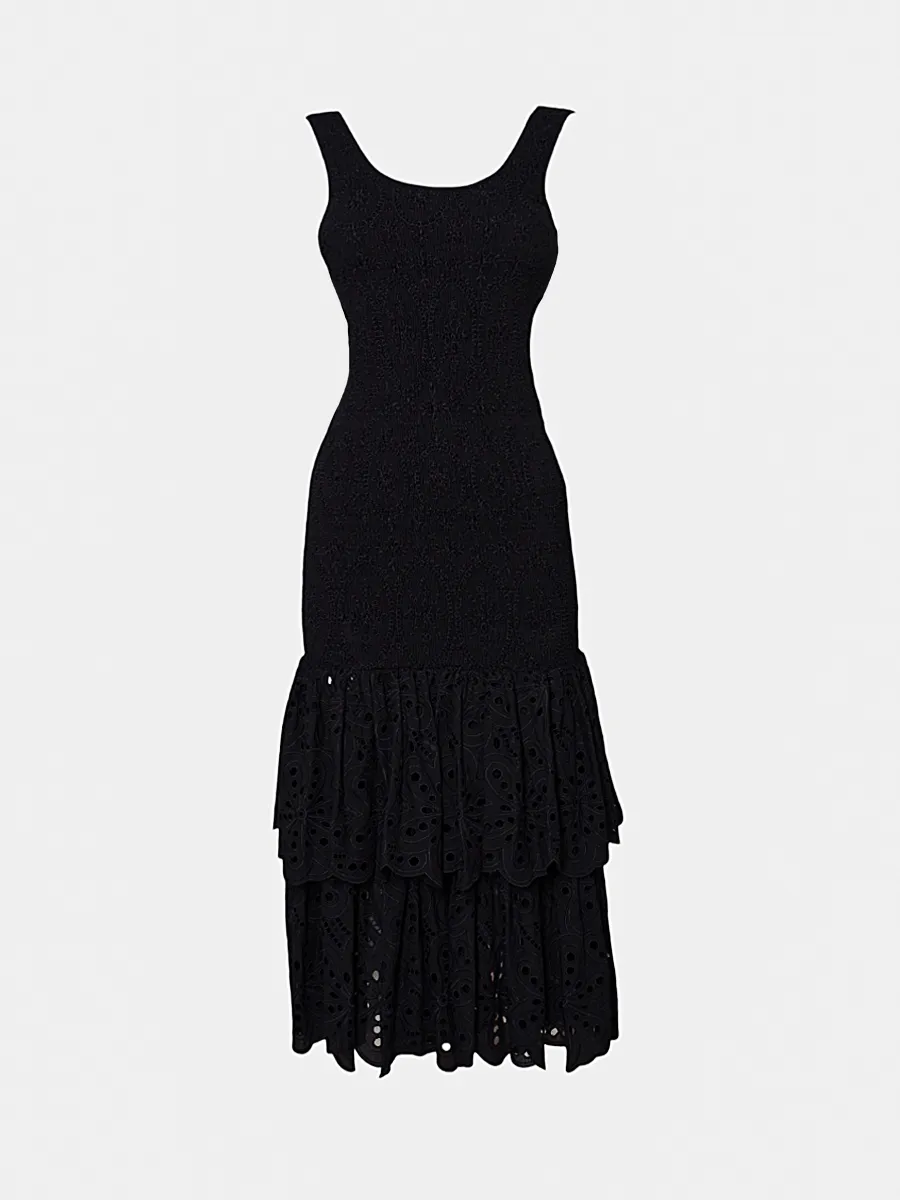 Платье Charo Ruiz выполнено из черного фактурного материала с роскошным кружевным узором, включающим геометрические элементы и точечные детали. Модель прямого кроя дополнена безрукавным верхом и пышной юбкой с многослойными кружевными оборками, что создает романтичный и элегантный образ. Контраст между плотной тканью и воздушным кружевом придает платью нежность и изысканность. Дизайн идеально подходит для вечерних мероприятий или особенных случаев.
