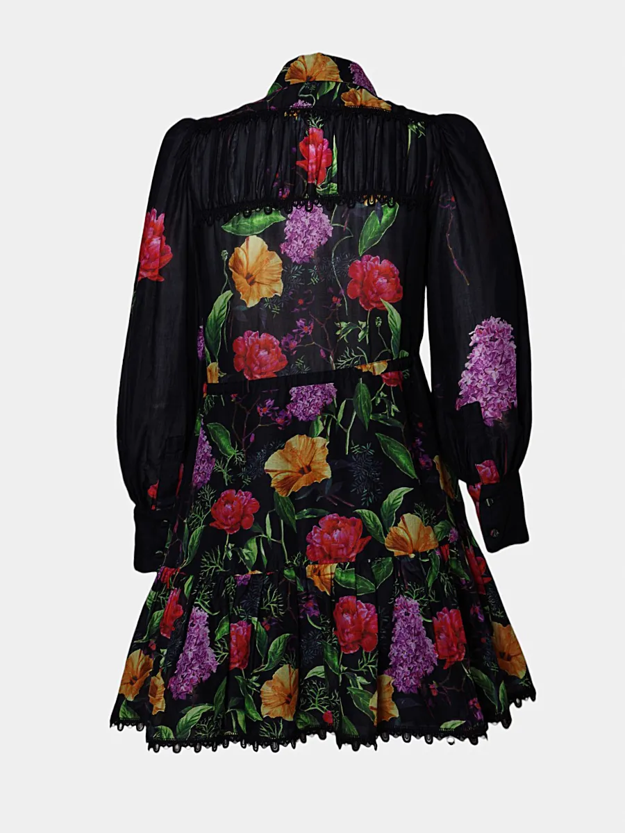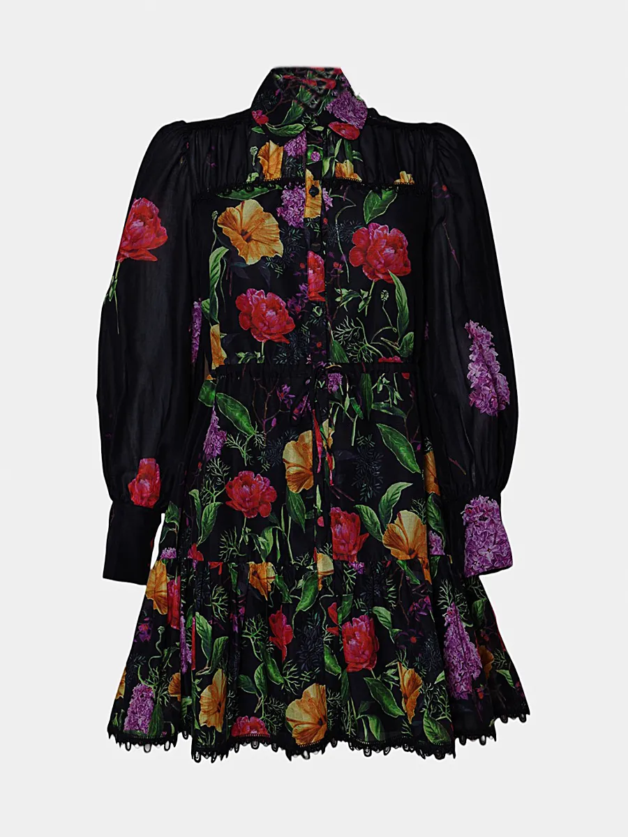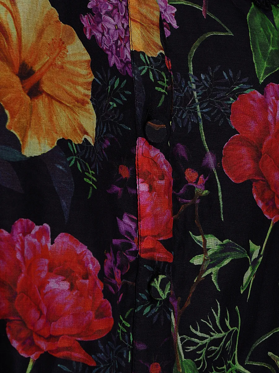 Платье Charo Ruiz выполнено из темной ткани с ярким цветочным принтом, включающим красочные розы, гиацинты и другие экзотические цветы на черном фоне. Модель прямого кроя дополнена объемными рукавами-фонариками и пышной юбкой, что создает романтичный и элегантный образ. Детали работы принта демонстрируют высокое качество исполнения, делая это платье идеальным выбором для вечерних мероприятий или особенных случаев.