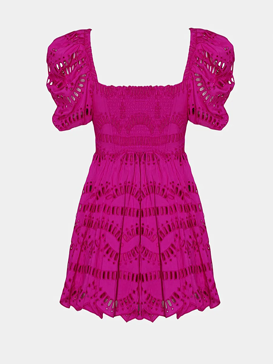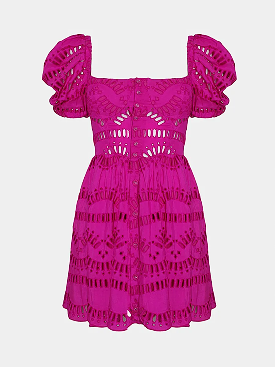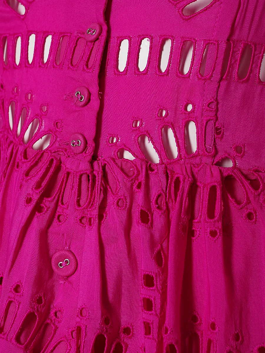 Платье Charo Ruiz выполнено из ярко-розового кружевного трикотажа с рельефным узором, созданным методом перфорации. Модель сочетает короткие пышные рукава и образный вырез, декорированный тонкой отделкой. Свободная юбка дополнена многослойной структурой, которая придает изделию легкость и воздушность. Идеально для летних мероприятий или повседневного использования в теплую погоду.