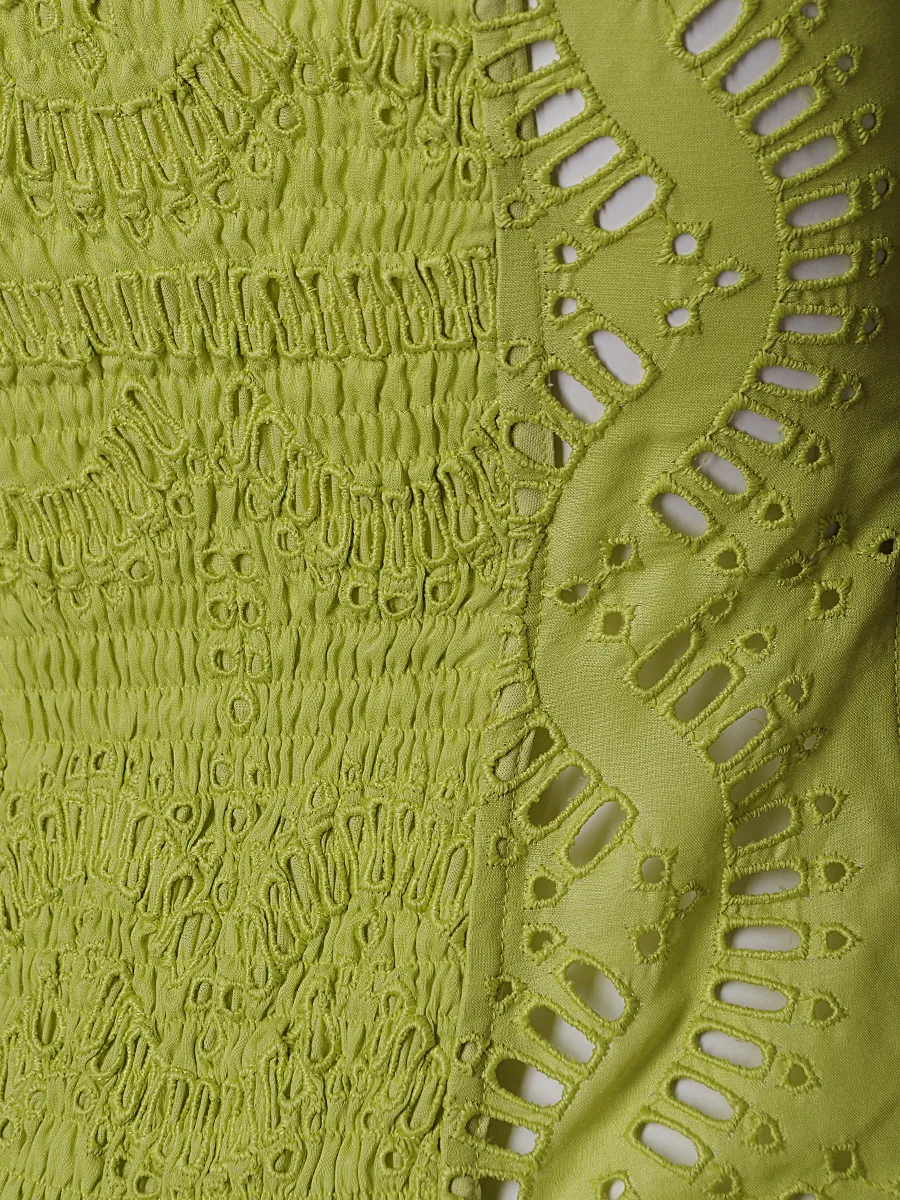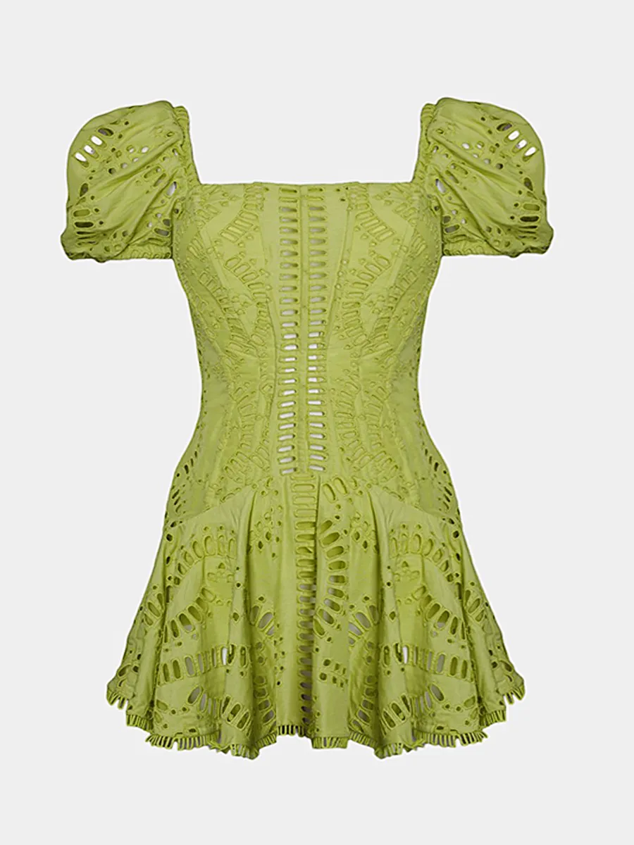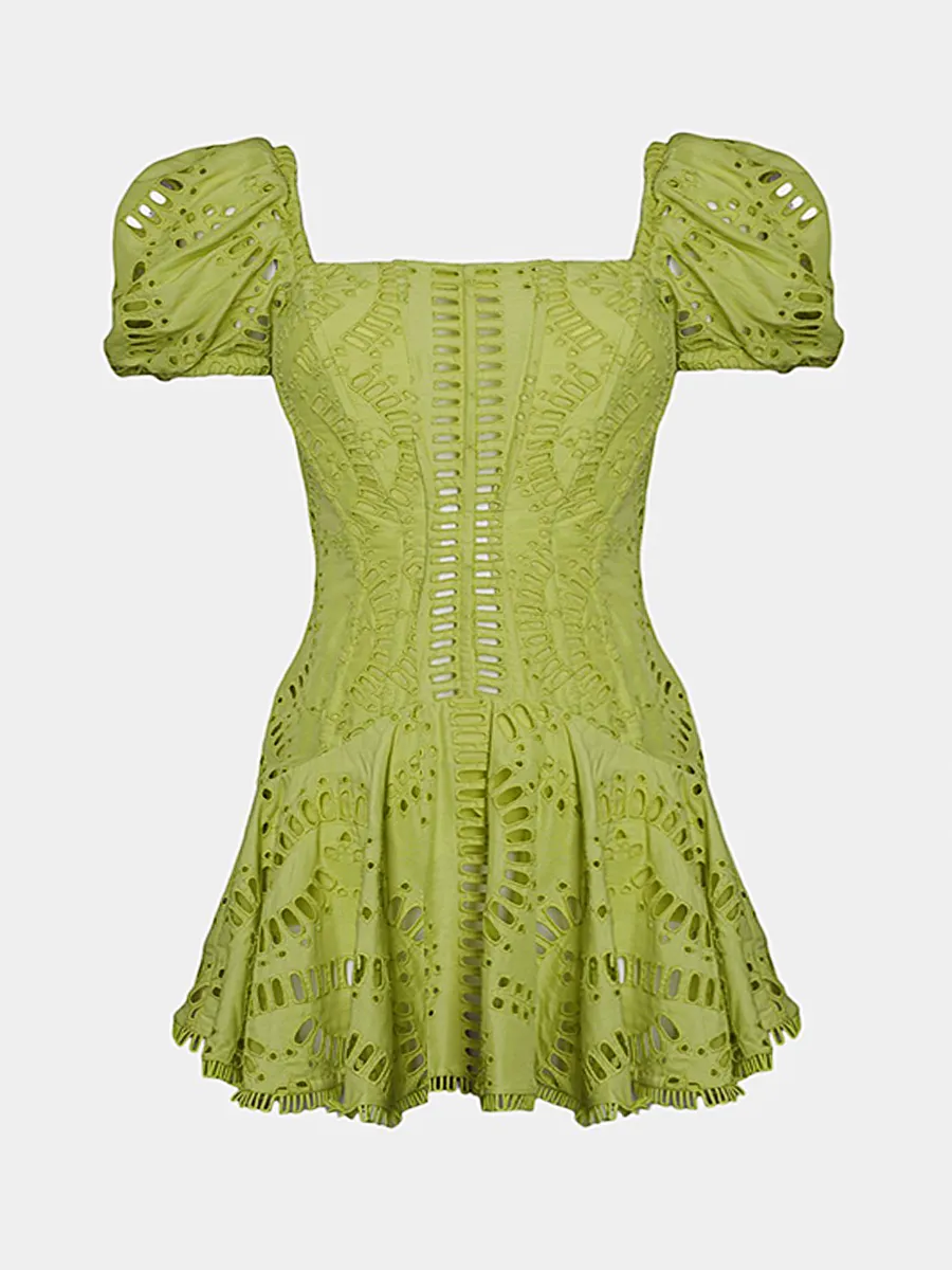 Платье Charo Ruiz выполнено из яркого зеленого кружевного трикотажа с рельефным узором, созданным методом перфорации. Модель сочетает короткие пышные рукава и образный вырез, декорированный тонкой отделкой. Свободная юбка дополнена многослойной структурой, которая придает изделию легкость и воздушность. Идеально для летних мероприятий или повседневного использования в теплую погоду.
