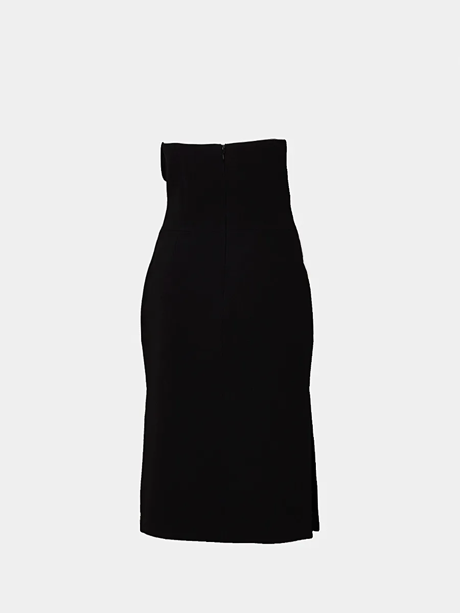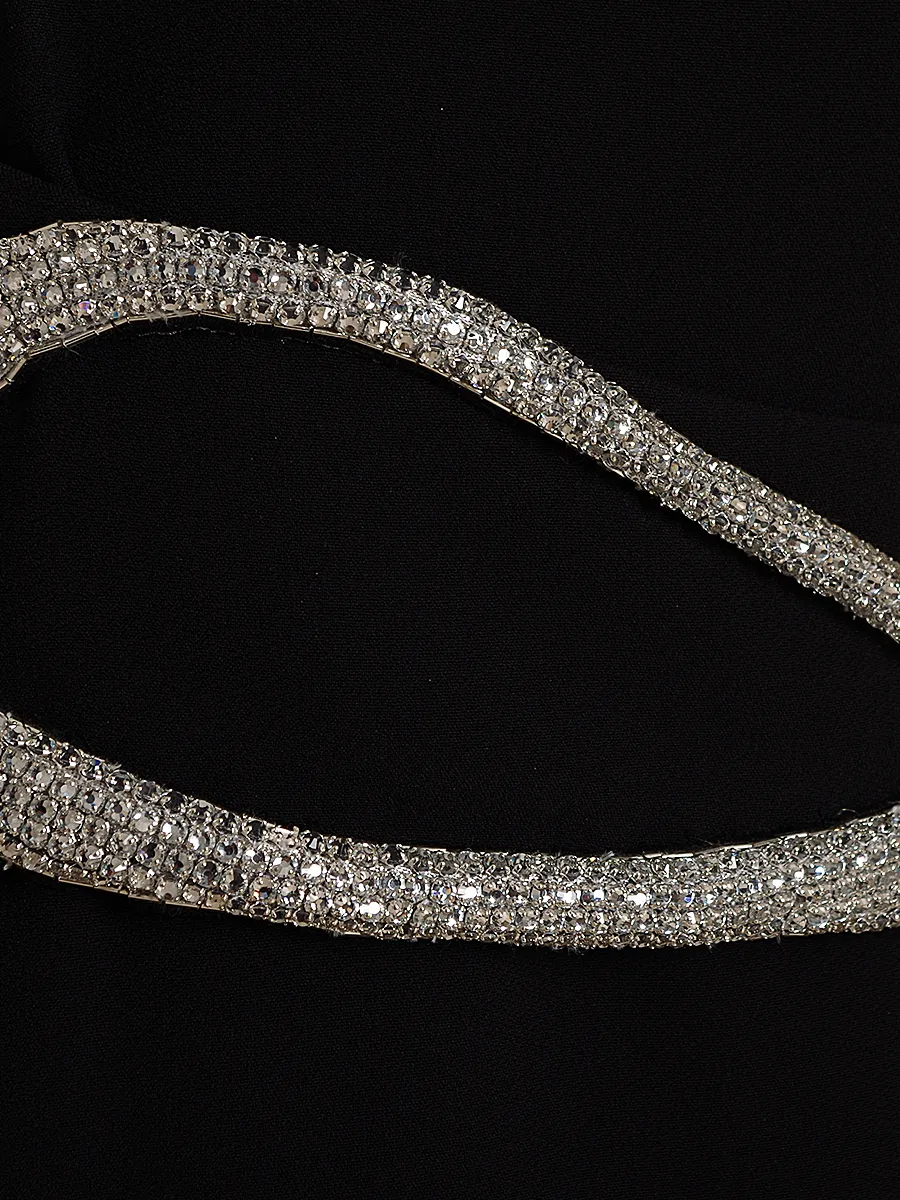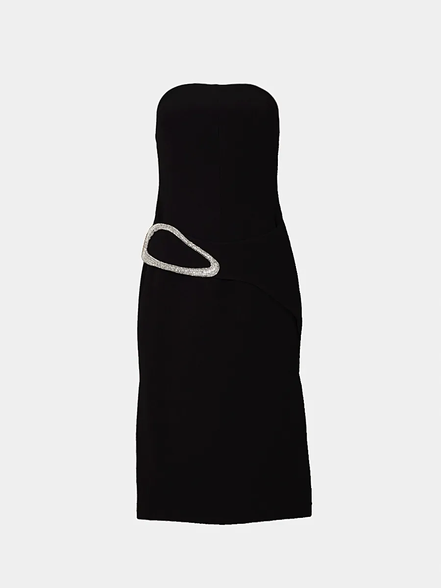 Платье David Koma выполнено из качественного гладкого текстиля черного цвета с лаконичным силуэтом и без бретелей. Модель дополнена элегантной отделкой — контрастной аппликацией в виде кристаллизованного декора, которая акцентирует талию. Текстура материала подчеркивает фигуру, создавая современный и стильный образ для вечерних и особенных случаев.