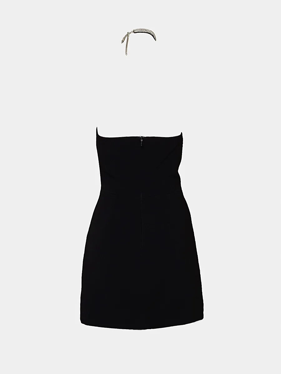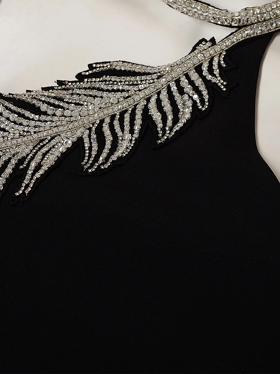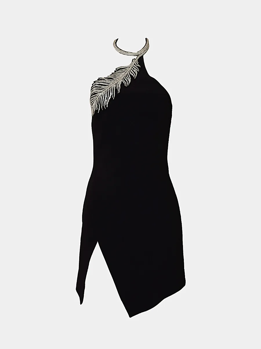 Платье David Koma — минималистичный силуэт из плотной черной ткани с эффектным асимметричным декором: броская вышивка в виде пера, инкрустированная кристаллами, на плече и шее, создаёт роскошный акцент; облегающий крой и разрез сбоку подчеркивают фигуру — эксклюзивный выбор для вечернего образа.