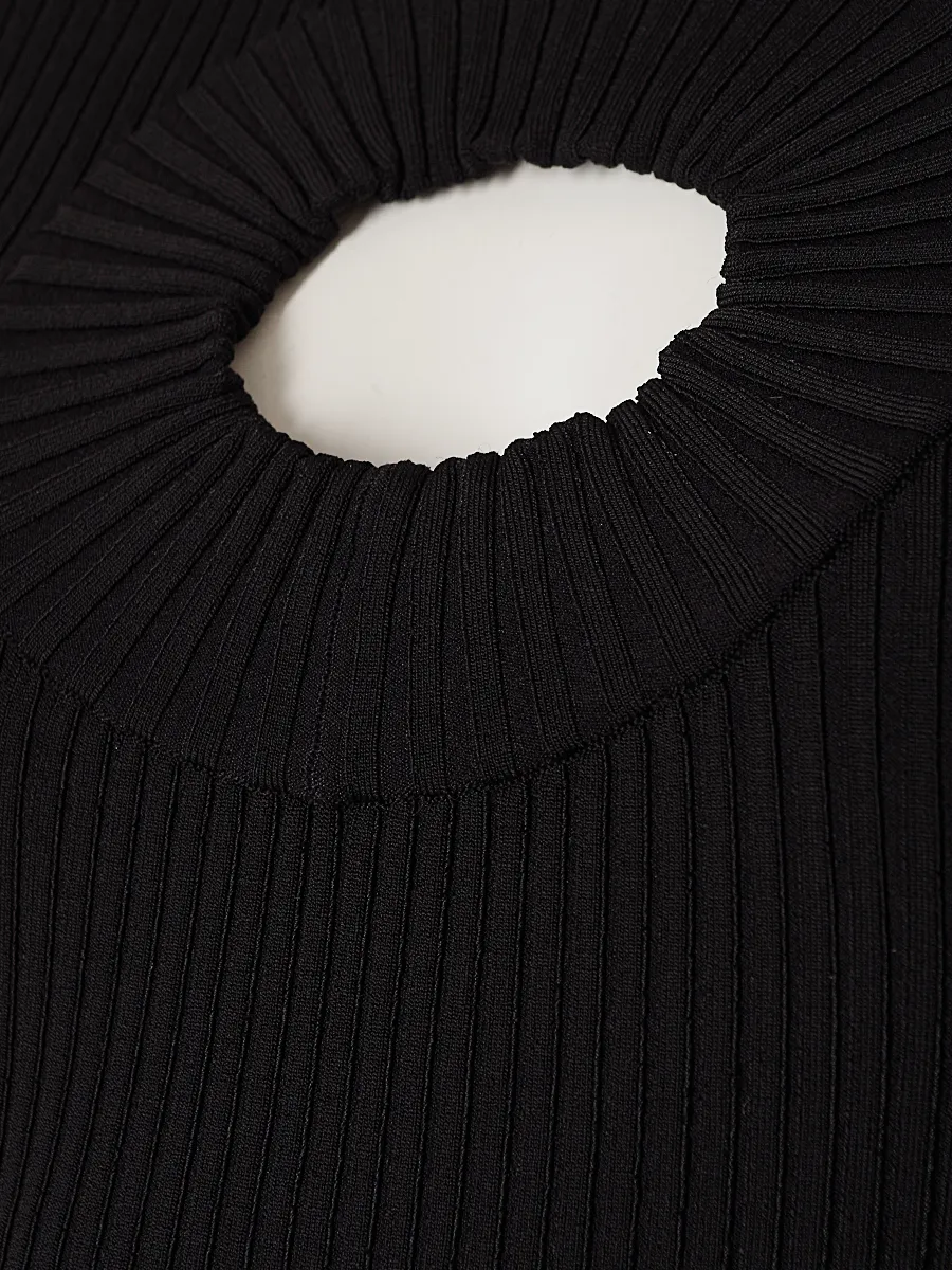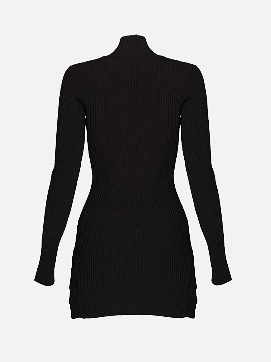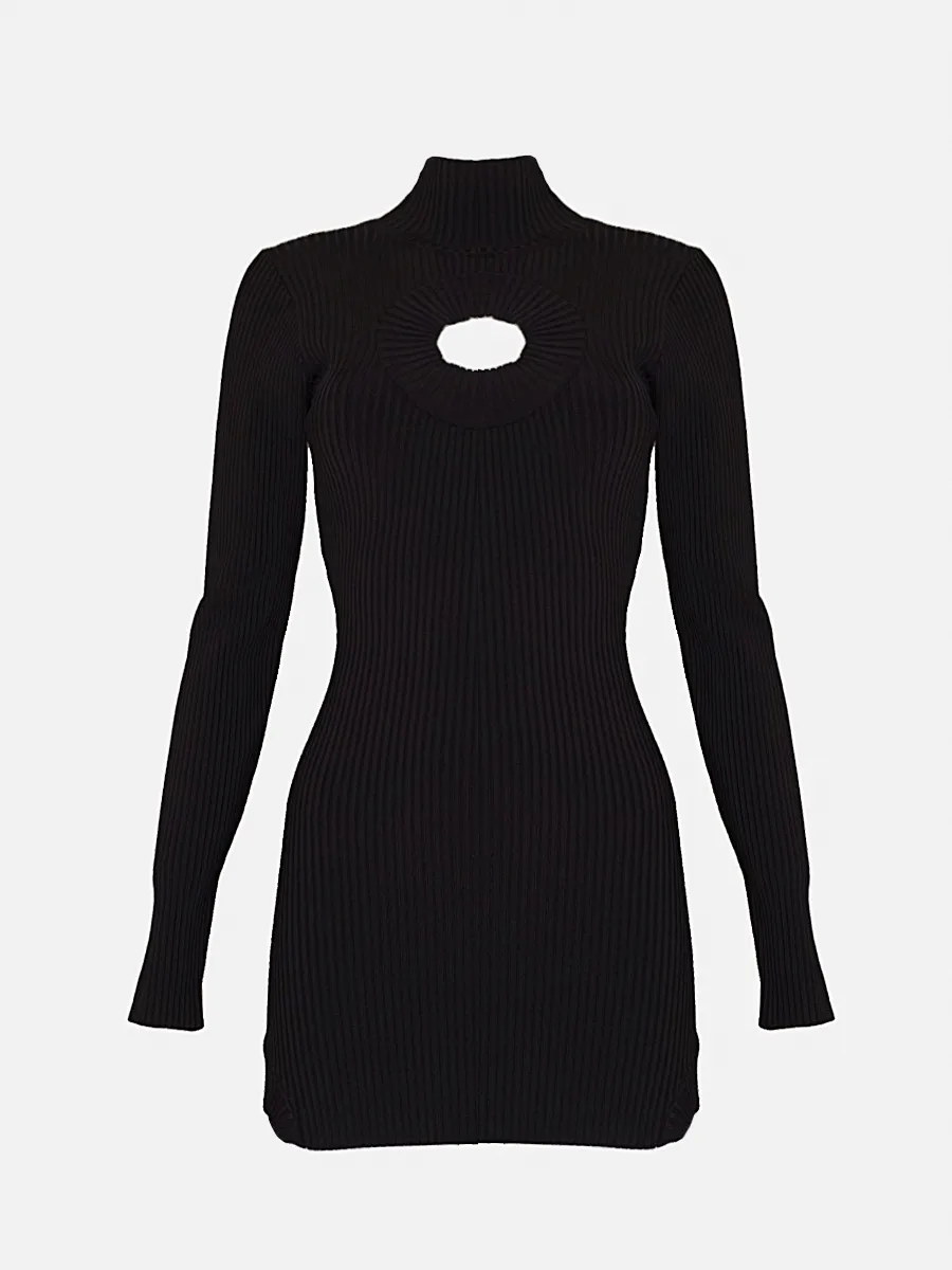 Платье David Koma выполнено из черного фактурного трикотажа с эффектом резинки, создавая приталенный силуэт. Модель дополнена оригинальным декольте в форме круга, обрамленного складками ткани, что добавляет игривости и современности образу. Дизайн дополняется длинными рукавами и округлым вырезом на спинке, завершенным застежкой-молнией. Идеально для вечерних мероприятий или как базовый элемент модного лука.