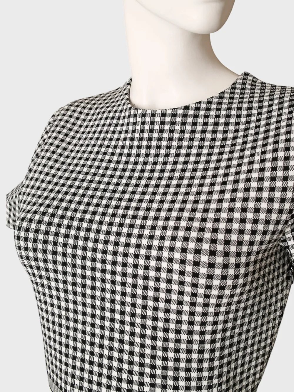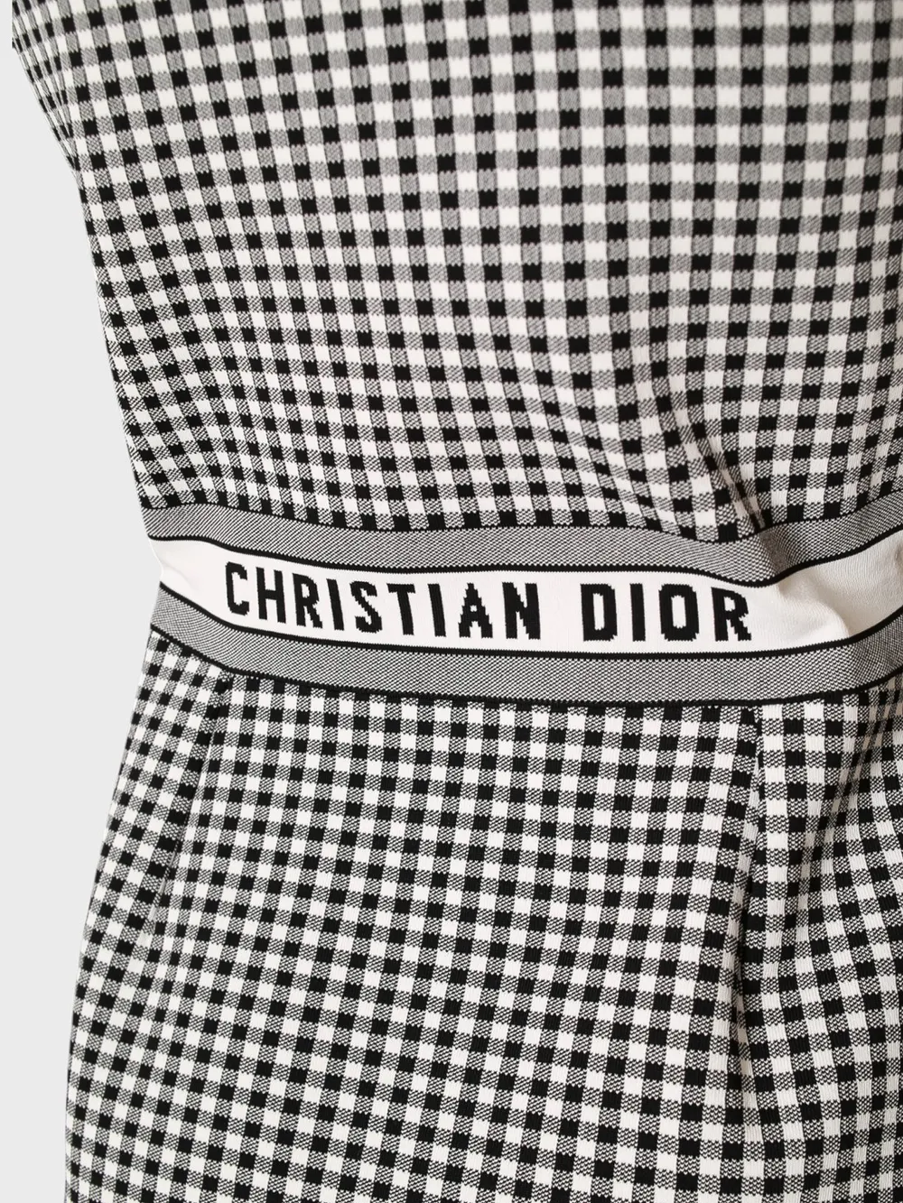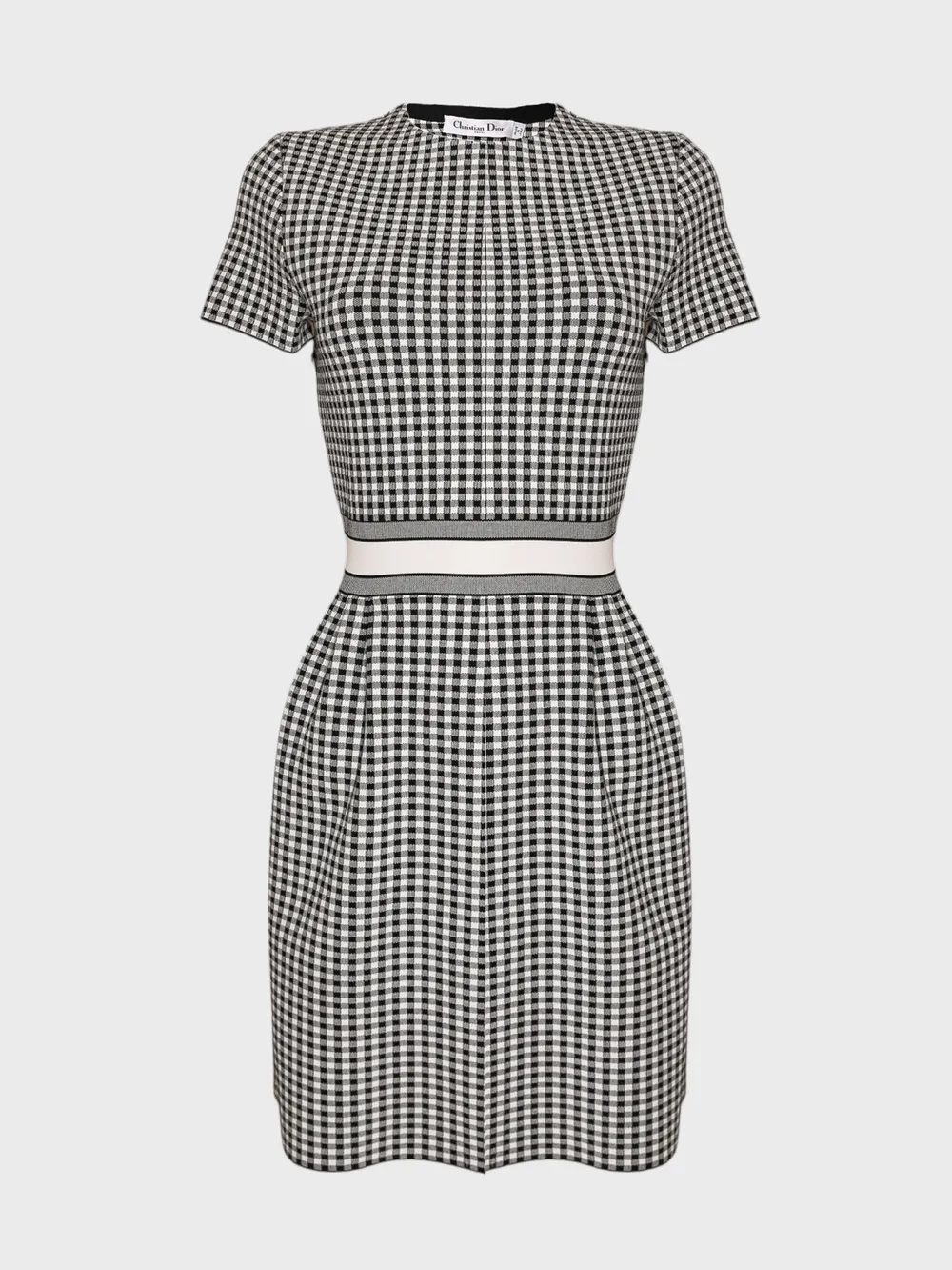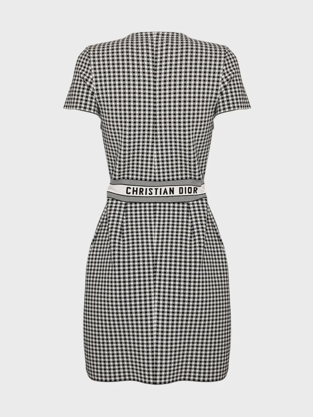 Платье Christian Dior выполнено из качественного материала с черно-белой клетчатой текстурой. Модель дополнена короткими рукавами, прямым кроем и поясом с логотипом бренда "Christian Dior" на талии. Пояс подчеркивает фигуру, а классический дизайн создает элегантный и современный образ. Простые детали и внимание к качеству делают это платье идеальным выбором для повседневного использования или официальных мероприятий.