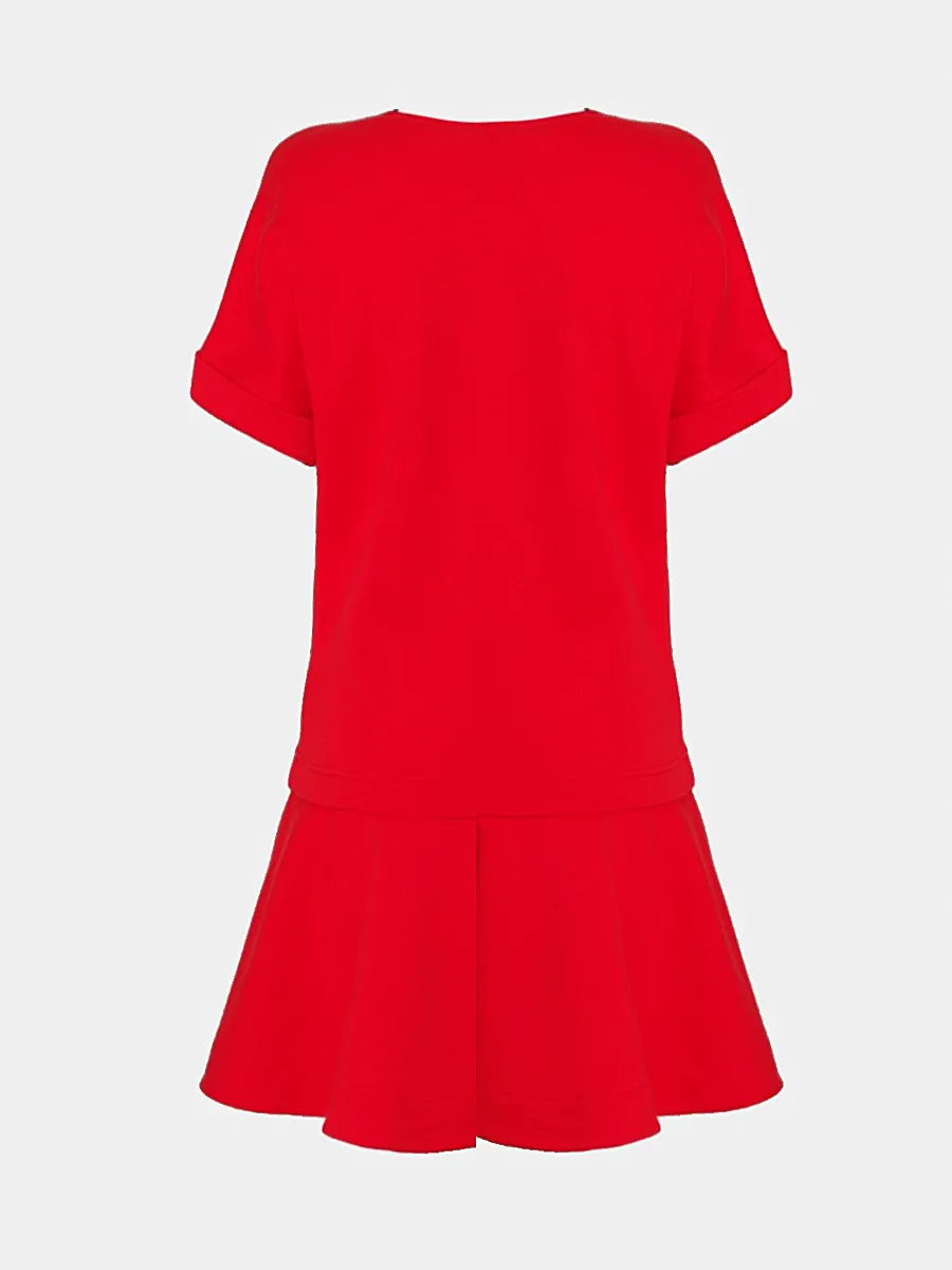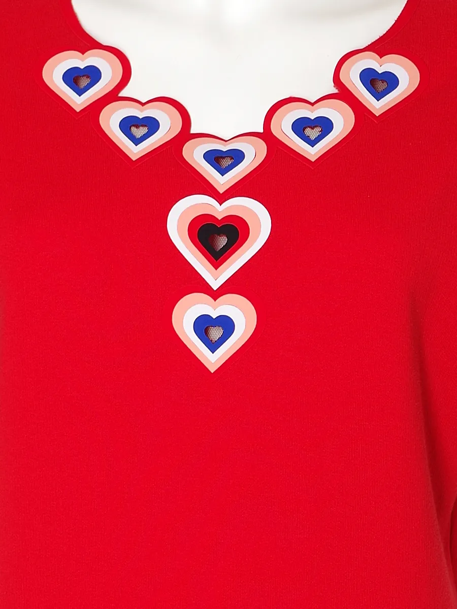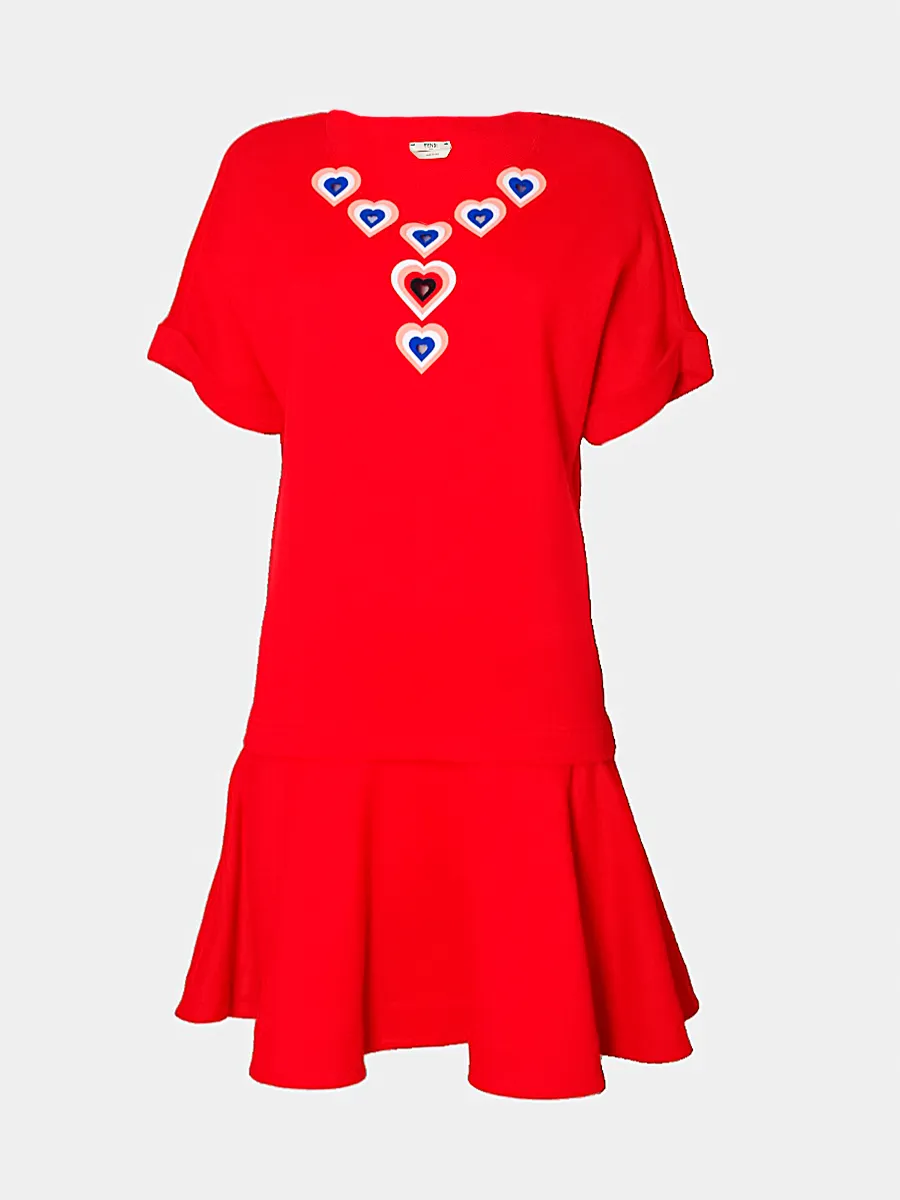 Платье Fendi выполнено из качественного красного материала с короткими рукавами и круглым вырезом. Модель дополнена декоративными элементами в виде сердечек на лифе, которые добавляют игривости и акцента. Простой дизайн и комфортная посадка делают платье идеальным выбором для повседневной носки или как базовый элемент в гардеробе.