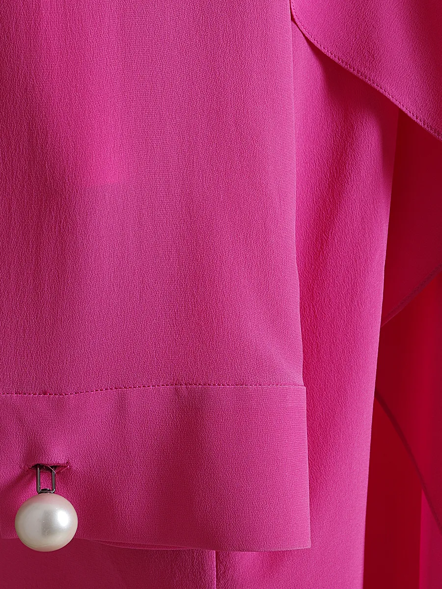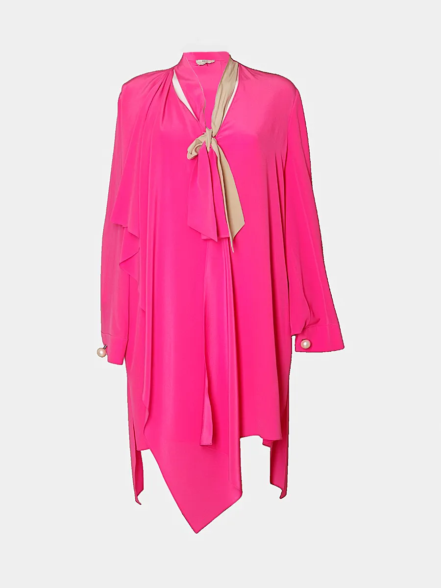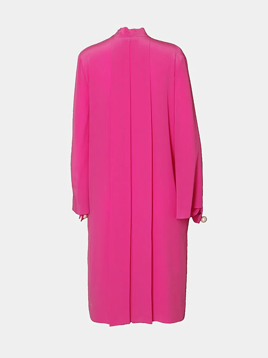Платье Fendi выполнено из качественного ярко-розового материала с длинными рукавами и V-образным вырезом. Модель дополнена декоративными элементами в виде жемчужных пуговиц и завязки на лифе, что добавляет элегантности и акцента. Простой дизайн и комфортная посадка делают платье идеальным выбором для повседневной носки или как базовый элемент в гардеробе.
