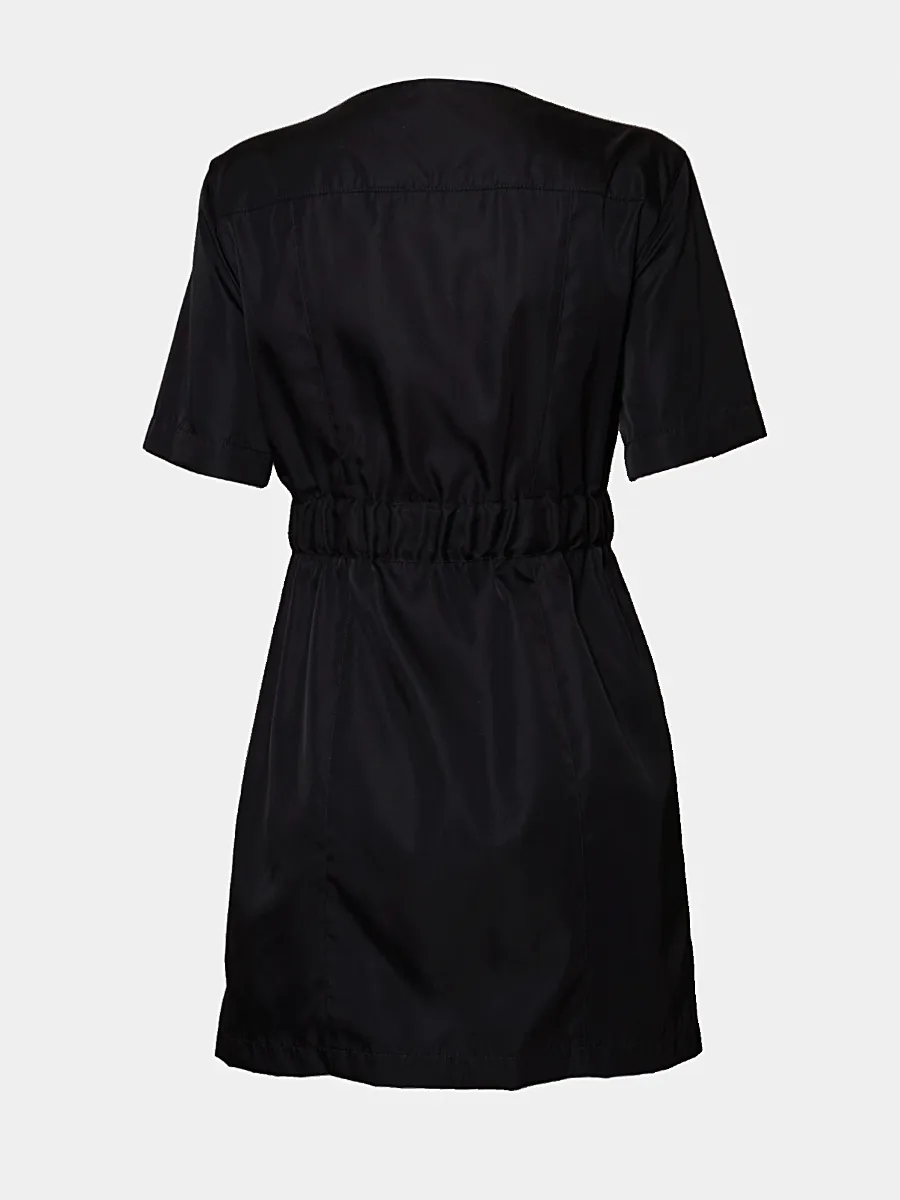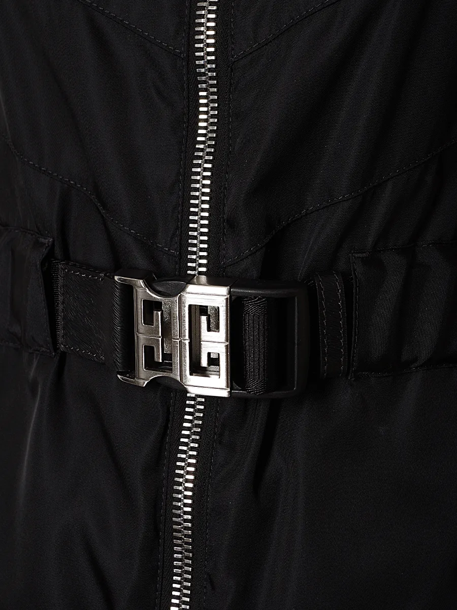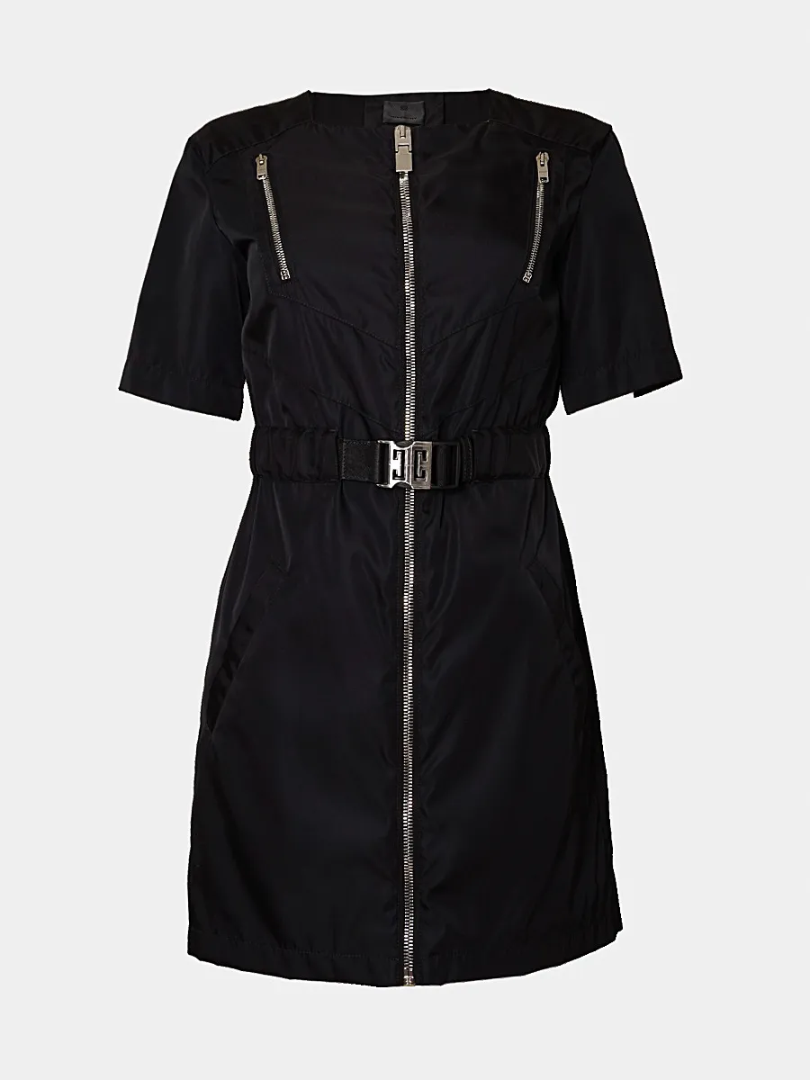 Платье Givenchy выполнено из качественного глянцевого текстиля черного цвета, с лаконичным силуэтом и короткими рукавами. Модель дополнена центральной молнией, контрастной отделкой на воротнике и поясом с металлической пряжкой в виде фирменного логотипа бренда. Стильный акцент — небольшие карманы с молниями на передней части платья. Универсальный крой позволяет создать современный и элегантный образ для различных случаев.