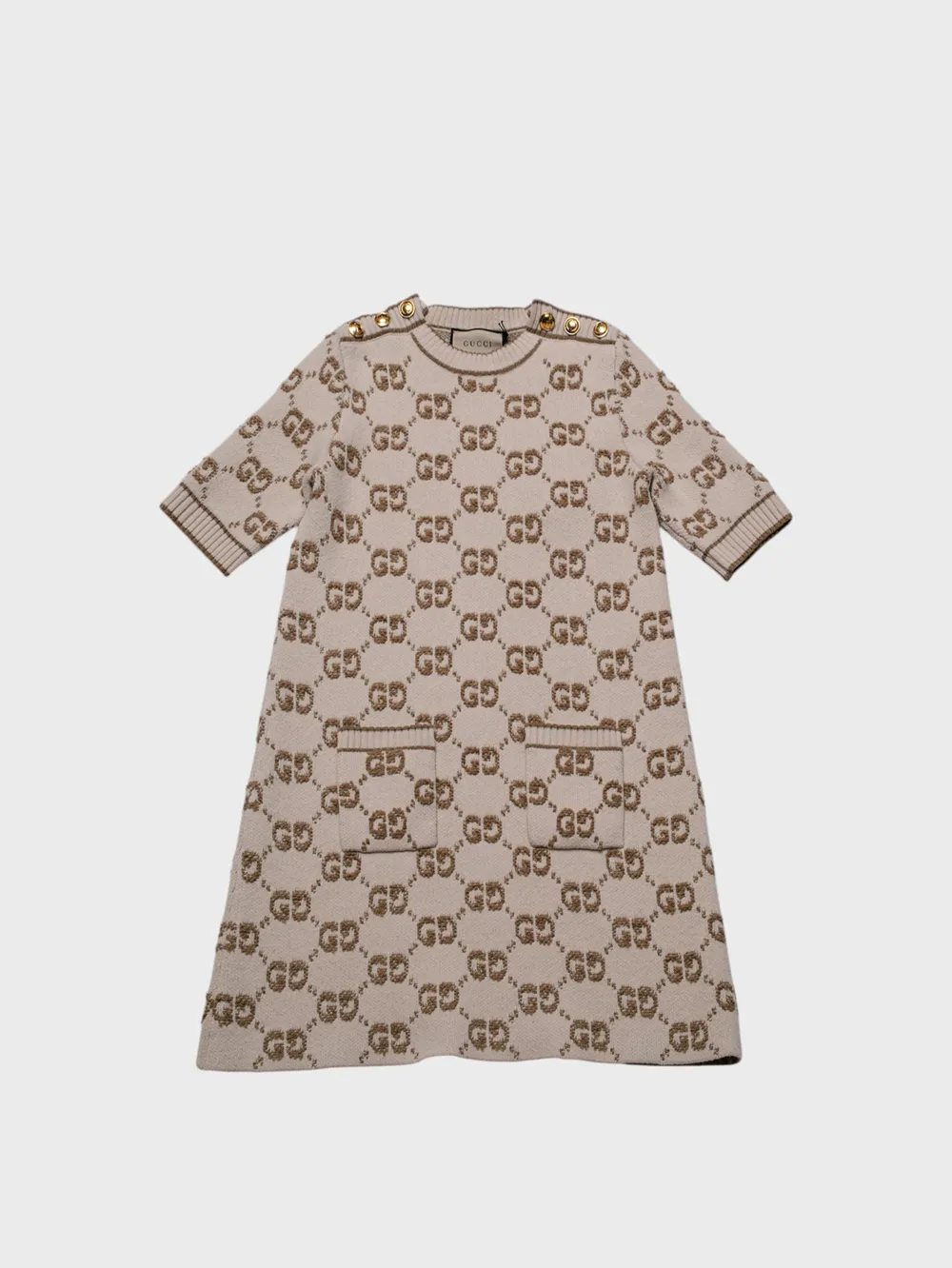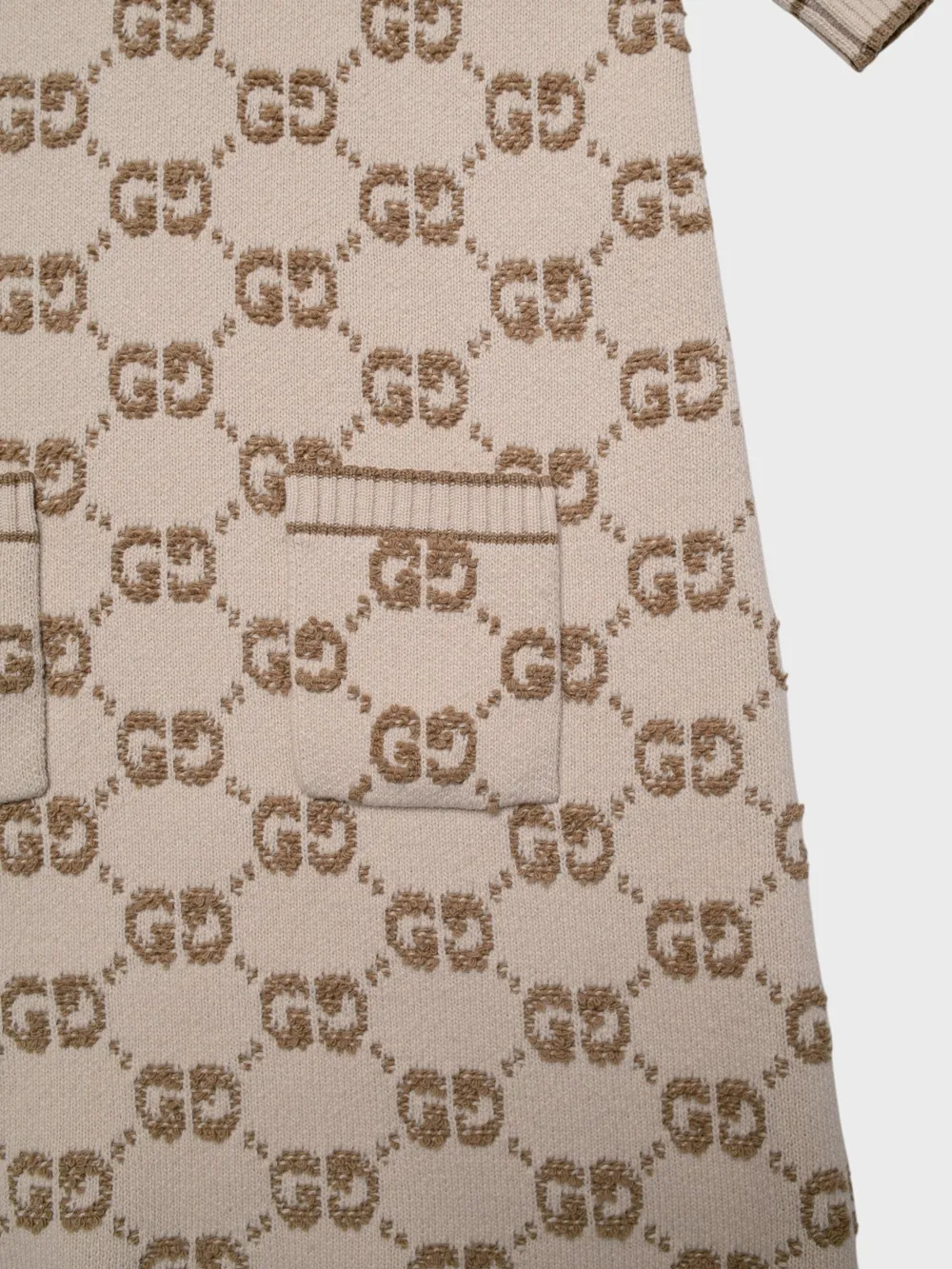 Платье Gucci выполнено из плотного трикотажа бежевого цвета с повторяющимся монограммным узором «GG» в коричневых тонах; приталенный крой, короткие рукава, круглый вырез и декоративные пуговицы на плечах подчёркивают элегантность и узнаваемость бренда — стильный элемент повседневного или вечернего образа.