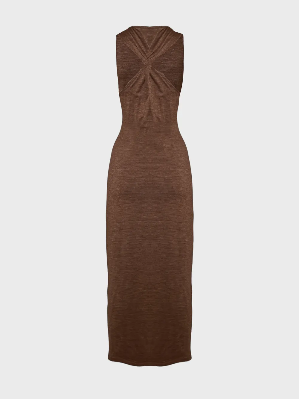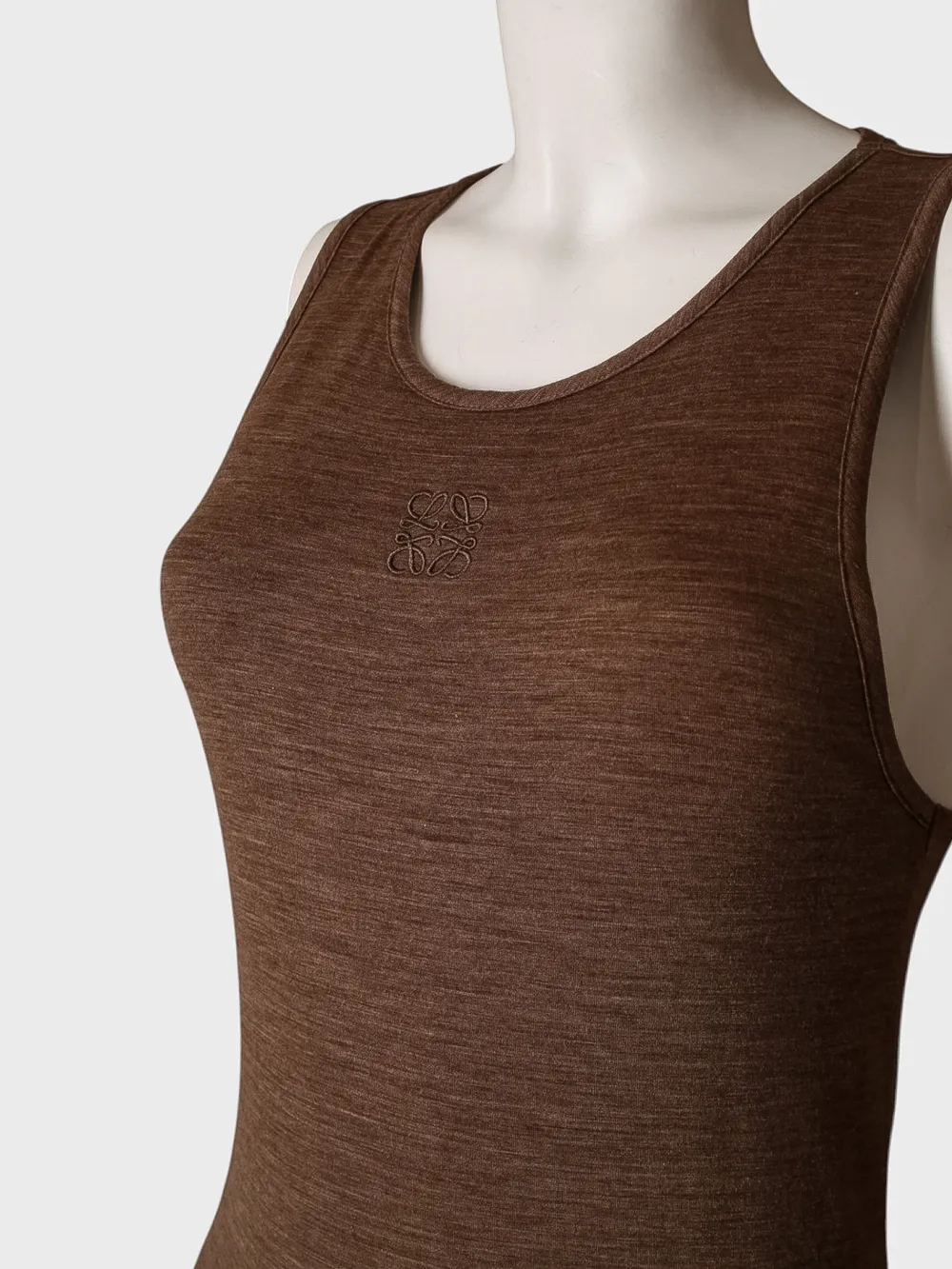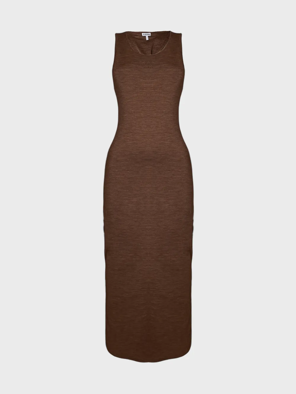 Платье выполнено из высококачественного темно-коричневого трикотажа с текстурой рибана, обеспечивающей комфорт и элегантный внешний вид. Дизайн лаконичный и женственный, акцентирован брендовым логотипом "LOEWE" в тон к платью на груди. Модель оснащена округлым вырезом и безрукавным силуэтом, подчеркивающим фигуру. Прочный материал и качественная отделка гарантируют долговечность и стильный внешний вид. Идеально подходит для вечерних мероприятий или как базовый элемент гардероба.